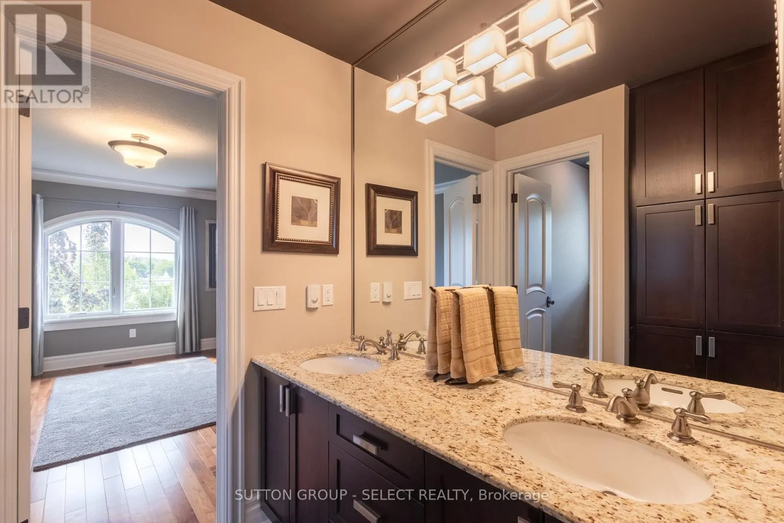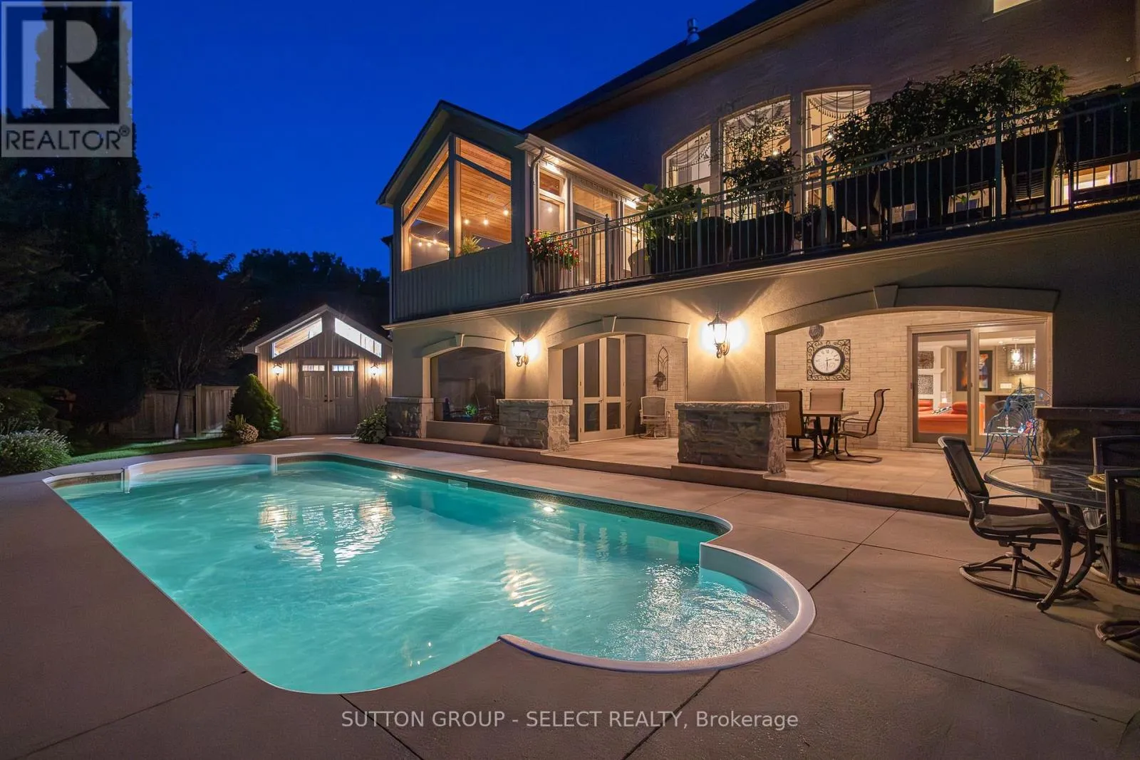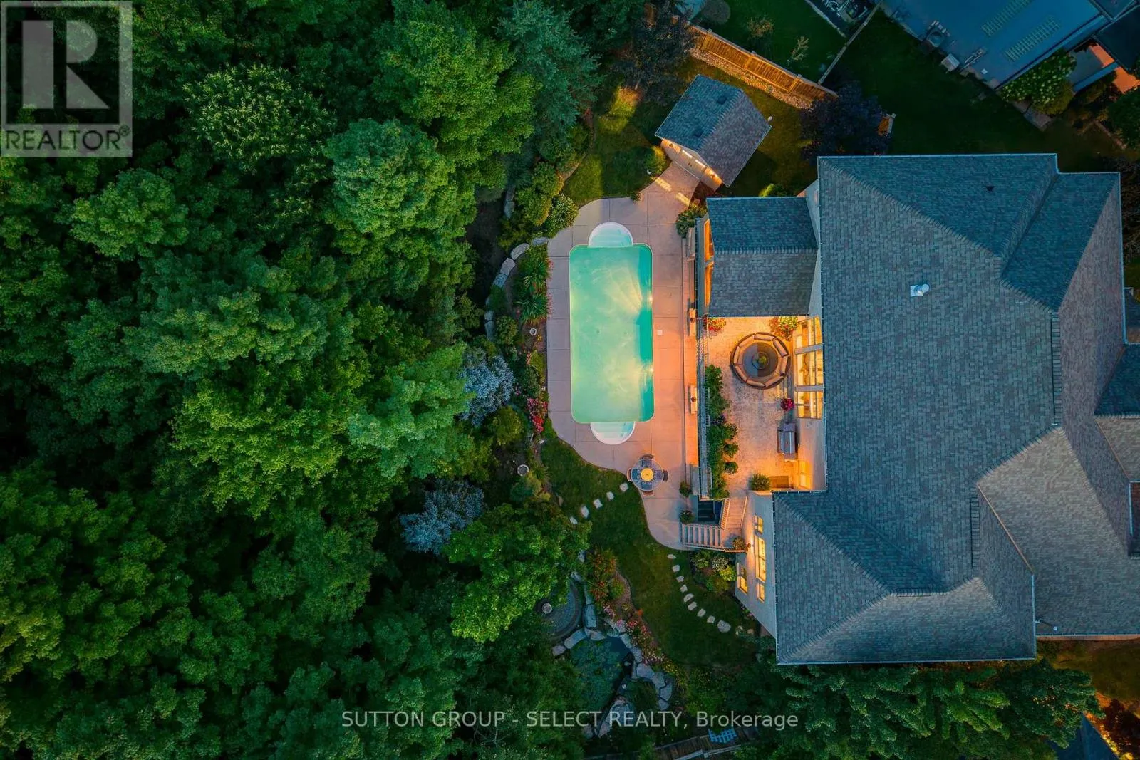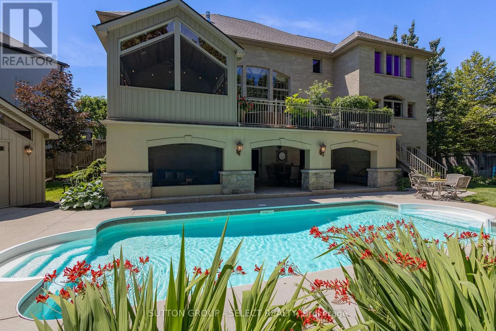 Cross Streets: Eagletrace Drive. ** Directions: Head north on Wonderland Road, turn right on Eagletrace Drive. Turn right into Eagletrade Drive cul-de-sac and property is at top of cul-de-sac. This 6,067 total sq. ft. European-inspired residence, thoughtfully designed by The Barnswallow Company, embodies timeless appeal, enduring craftsmanship, artistry, and refinement. Positioned at the top of Eagletrace Drive's prestigious cul-de-sac, this property enjoys the rare privilege of backing on Medway Valley Heritage Forest & ravine. The striking stone, stucco, and brick facade is complimented by a forecourt with manicured lush gardens and a sculptural water feature. The grounds unfold into a resort-style retreat with an in-ground saltwater pool, screened veranda, walkout partially screened loggia, raised terrace, serene waterfall, thriving pond, and an armour stone fire retreat, making this an extraordinary property to host. Inside, the main level exudes grandeur & warmth. The two-story great room is embellished with a cast stone gas fireplace, walnut hardwood floors, and expansive Andersen windows showcasing beautiful tree canopy views. Flow seamlessly into the expansive European-inspired kitchen, discovering embellished millwork, Cherry cabinetry, Sub-Zero fridge, Wolf, Bosch, and KitchenAid appliances, butlers pantry, kitchen pantry, breakfast nook, and a furniture style 7.4' Delicatus granite island. A formal dining room, sun-filled study, and family room with wet bar elevate the living experience. The upper level is crowned by an indulgent primary retreat - a serene, romantic sanctuary with sweeping treetop views, a lavish 6-piece ensuite with limestone, bidet & water closet, and a custom oversized dressing room with jewelry cabinetry. Three junior suites with custom closets, two with a shared 4-piece Jack & Jill, provide privacy & comfort. The lower level walkout was thoughtfully designed to bring together leisure and wellness with a recreation lounge, wet bar, sound-isolated music room, home gym with integrated sauna, craft/creative room & a thoughtfully designed in-law suite with kitchenette. Recent upgrades: Roof, furnace, AC, hot water tank-2023. (id:27476)