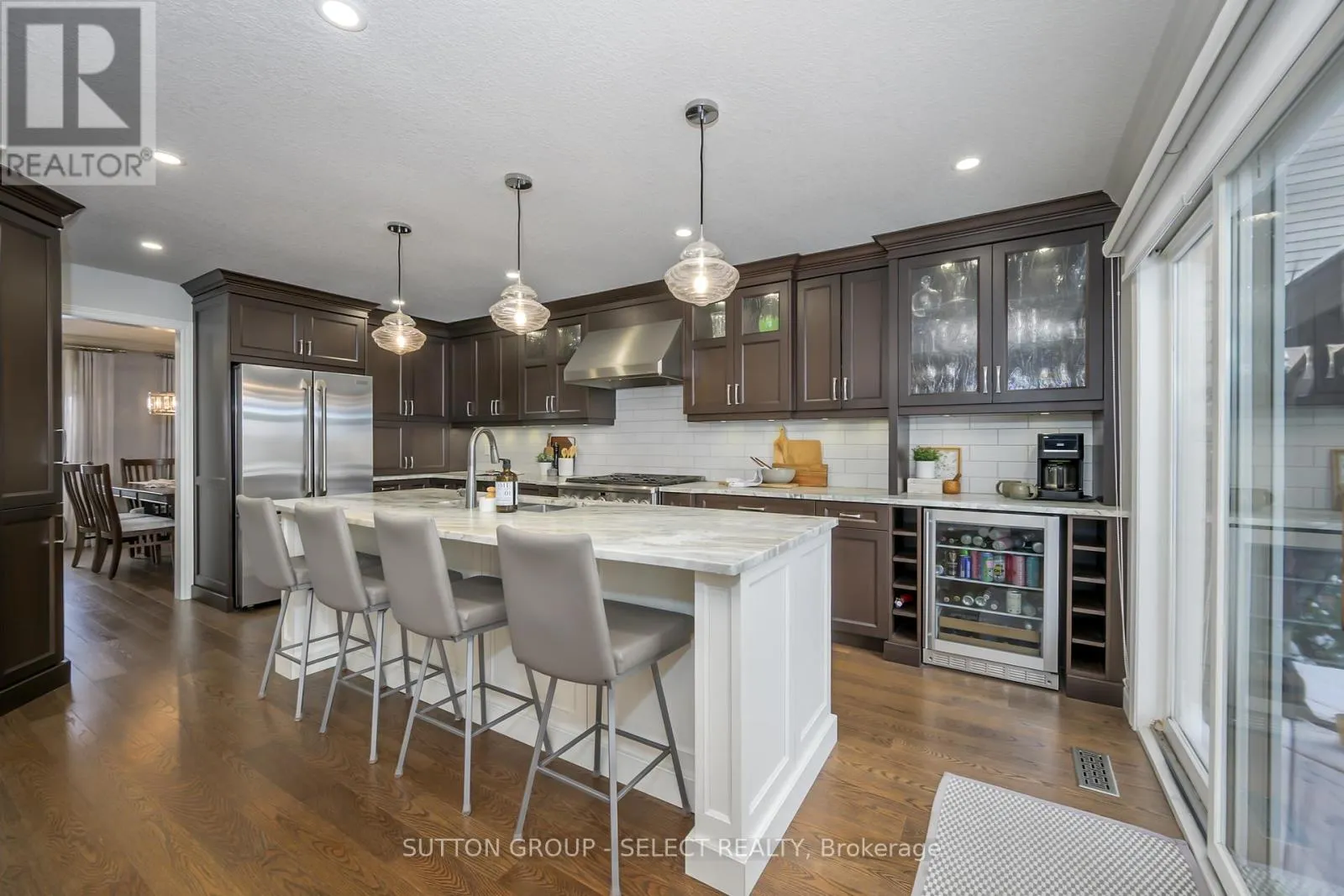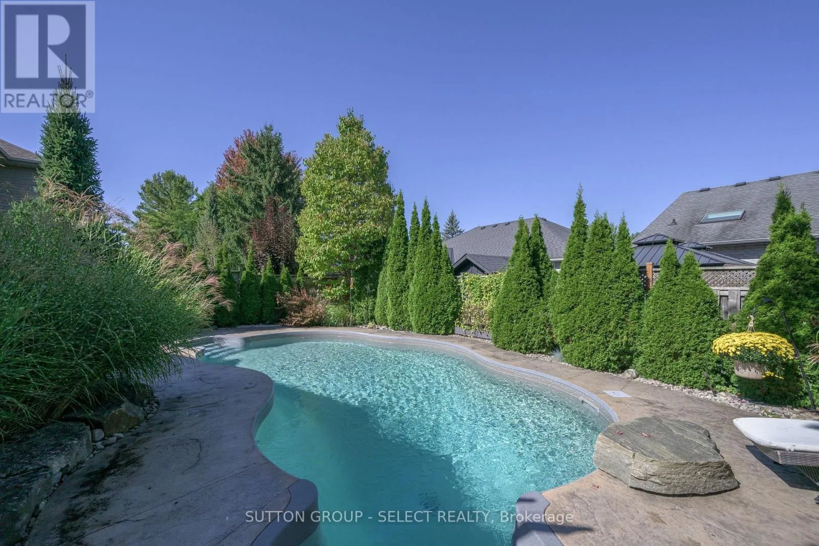 Cross Streets: Ambleside Drive & Marcus Crescent. ** Directions: Derwent Road off of Fanshawe Park Rd W, Ambleside Dr to Marcus Crescent. Set on a quiet crescent in the Masonville Public School catchment, this exquisitely upgraded executive home delivers refined living and a resort-style backyard retreat rarely found in the city. Minutes to Western University, University Hospital, St. Joseph's, Sunningdale Golf, and Ivey, the location is unmatched for academic, medical, and professional families. Playgrounds, community parks, and the Medway Valley Heritage Forest trail system elevate the lifestyle with nature just steps away. Inside, the home offers a warm, polished atmosphere with a gracious foyer, separate dining room, and a sun-filled living room with a fireplace and sweeping backyard views. A main-floor office provides a quiet, private workspace set apart from the principal rooms. Premium window treatments, rich hardwood flooring, and fresh neutral tones underscore the home's elevated aesthetic. The kitchen is a showpiece-designed with intention, luxury, and performance in mind. Wall-to-wall cabinetry creates exceptional storage and prep space. Stainless appliances include an impressive 6-burner gas range, while espresso cabinetry with backlit rain-glass uppers adds dramatic depth. Granite surfaces enhance the space and the contrast-tone, 4-seat island. The laundry/mudroom enhances daily function with built-in cabinetry, a full folding counter, and garage access. Upstairs, the generous primary suite offers a walk-in closet and a spacious ensuite. Three additional bedrooms share a refreshed main bath, and the lower level provides substantial storage and future potential. The backyard is the true showstopper: a heated pool anchors a private outdoor resort with multiple zones for lounging, dining, entertaining, and relaxing. A pergola lounge, tiki hut/bar, dining gazebo, and manicured green space framed by mature trees create a setting that feels worlds away. With a double garage and commanding curb appeal, this home delivers exceptional family living in one of London's most desirable neighbourhoods. (id:27476)