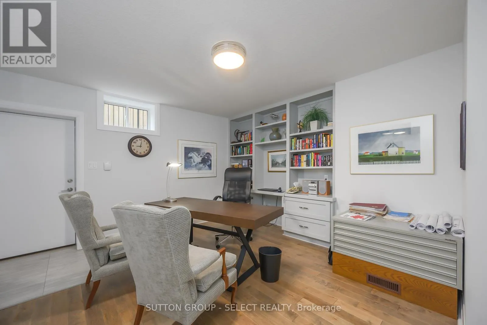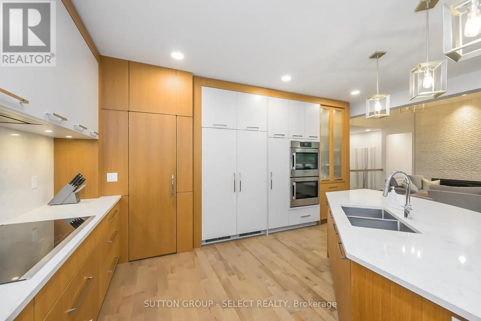 Cross Streets: Ricmond Street & Sunningdale Street. ** Directions: From Sunningdale: S on Meadowlands Way, 2nd exit from roundabout, W on Bradwell Chase. From Richmond St. N: W on Plane Tree Dr, N on Pelkey Rd, W on Quarrier, S on Meadowlands Way, W on Bradwell Chase. 2250 sq. ft. of bespoke design wrapped in natural stone, warm woods, and thoughtful contemporary detailing. From the moment you step inside, the single-storey layout unfolds with clean lines, layered textures, and intentional flow. The great room is anchored by a 15-ft vaulted ceiling and a striking porcelain media wall with an integrated linear fireplace. Quarter-sawn hardwood runs throughout the main living spaces, grounding the palette in warmth and texture. In the kitchen, ceiling-height cabinetry blends soft grey flat panels with the combed grain of Rift-sawn White Oak. Quartz surfaces, integrated appliances, a sculptural 6-seat curved island, and hidden pantry access all contribute to a space that's both functional and refined. The adjacent dining area leads to a Muskoka room that invites relaxed indoor-outdoor living. The primary suite features oversized six-pane windows that draw in natural light. A spa-style 5-piece ensuite enjoys double sinks, triple vanities, heated floors & a deep soaker tub wrapped in textured porcelain that continues across the wall to envelope the curb-less, seated, glass shower. Two additional bedrooms include generous closets and share a beautifully finished main bath. The powder room introduces a tactile design moment with its organic cork wall treatment. A custom switchback staircase wood-framed and glass-paneled leads to the finished lower level where lookout windows bring in plenty of natural light. 1,656 sq. ft. of additional living space includes a central games room, inviting family room, office with private outdoor entry (ideal for a home business), guest bedroom, gym/flex space, and a 2-piece bath pre-framed and plumbed for shower option. Outside, the backyard is framed by mature trees and offers multiple areas for dining, lounging, and quiet retreat created through designer hardscaping. Set in the Meadowlands of Sunningdale, close to golf, forested trails, shopping, Western University, and University Hospital. (id:27476)