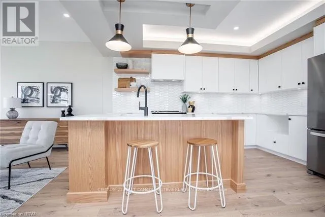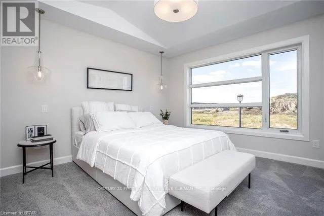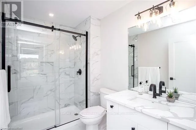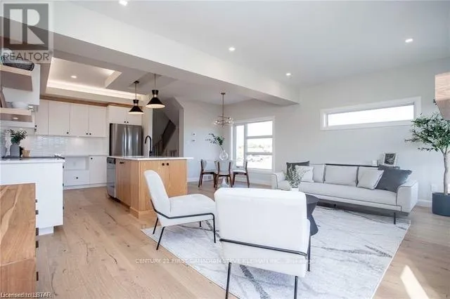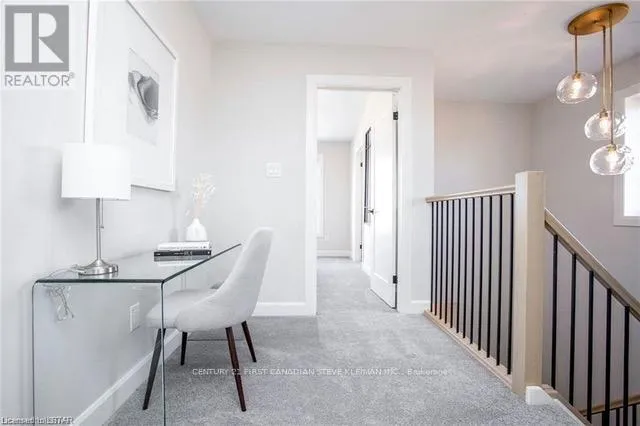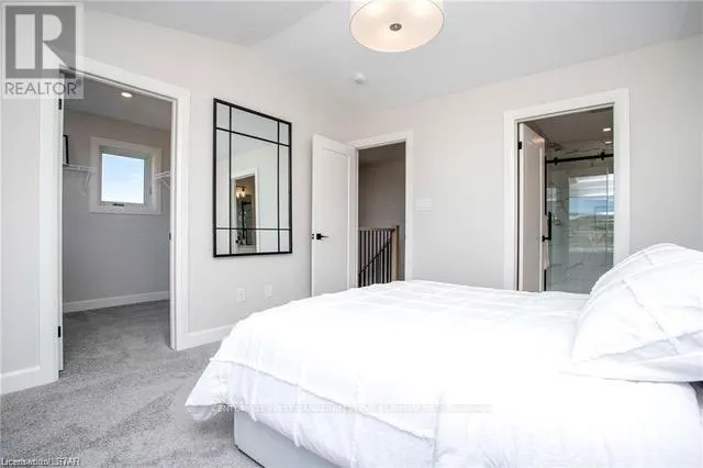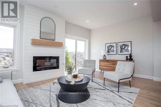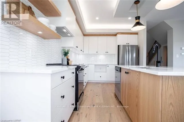 Cross Streets: Fair Oaks. ** Directions: Located just South of Sunningdale Rd. Auburn Homes proudly presents Fox Crossing, North London's newest two-storey townhome condominium community featuring stunning, stately exterior architecture with timeless stone accents. Unit 35, the popular Cornell Plan, offers 3 bedrooms, 2 full bathrooms, a main-floor powder room, and second-floor laundry. A custom-built entrance bench provides practical storage with space for baskets, and the finished lower landing (now included in the price) features a large coat closet. The main floor boasts 9-foot ceilings, abundant recessed lighting, and a custom illuminated kitchen ceiling detail that elevates the overall design. The stunning kitchen is complete with floating shelves stained to match, quartz countertops, soft-close doors and drawers, and both valance and above-cabinet lighting. A modern staircase with black iron spindles and a solid oak handrail leads to the second level. The spacious primary suite includes a luxury ensuite featuring a quartz countertop, soft-close drawers, granite shower base, tiled surround, pot light, and a built-in shampoo niche. The second full bathroom also offers a tiled tub surround. Enjoy the convenience of side-by-side second-floor laundry with ceramic tile flooring and a washer pan with drain. A 10' x 10' rear deck and oversized basement window provide excellent outdoor enjoyment and strong potential for future lower-level finishing. Photos may show upgrades not included. Model Home Open Saturday & Sunday from 2-4 PM at 2366 Fair Oaks Blvd. (id:27476)