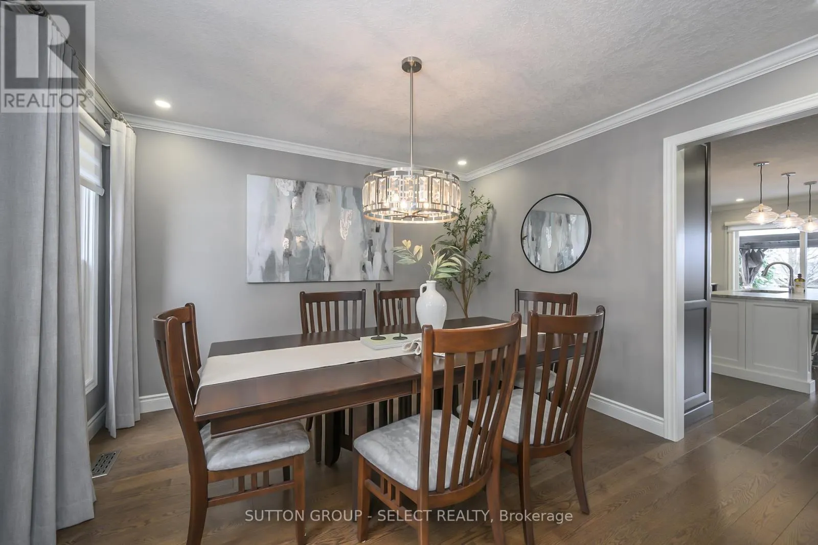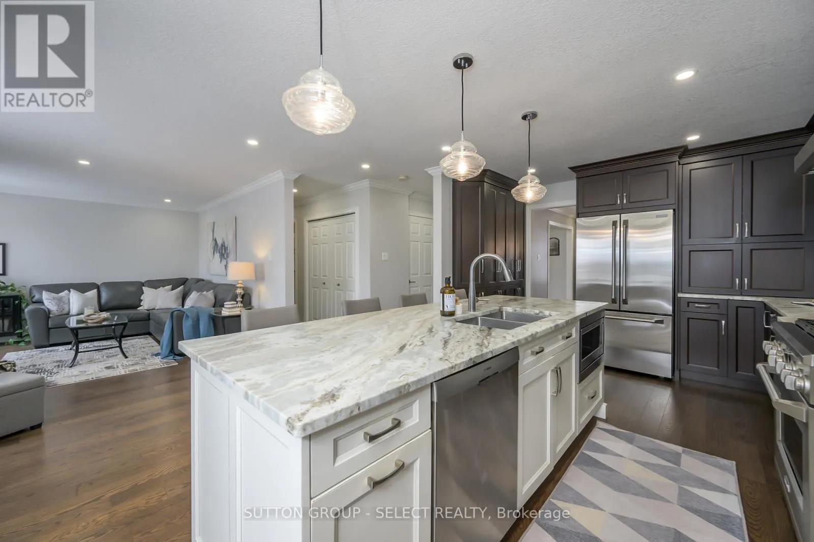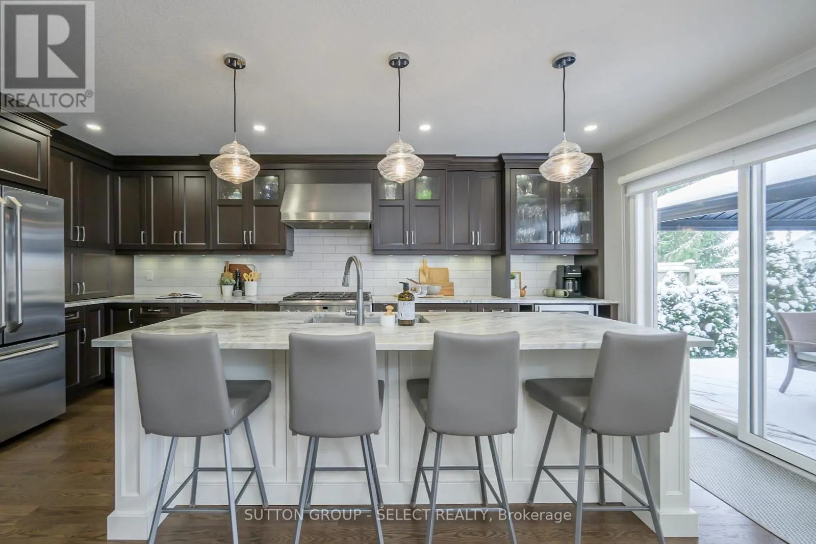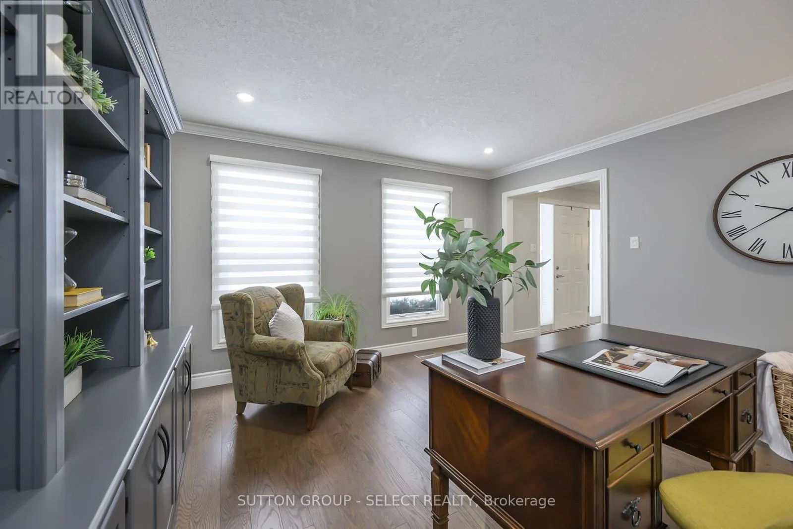Cross Streets: Ambleside Drive & Marcus Crescent. ** Directions: Derwent Road off of Fanshawe Park Rd W, Ambleside Dr to Marcus Crescent. Set on a quiet crescent in the Masonville Public School catchment, this exquisitely upgraded executive home delivers refined living and a resort-style backyard retreat rarely found in the city. Minutes to Western University, University Hospital, St. Joseph's, Sunningdale Golf, and Ivey, the location is unmatched for academic, medical, and professional families. Playgrounds, community parks, and the Medway Valley Heritage Forest trail system elevate the lifestyle with nature just steps away. Inside, the home offers a warm, polished atmosphere with a gracious foyer, separate dining room, and a sun-filled living room with a fireplace and sweeping backyard views. A main-floor office provides a quiet, private workspace set apart from the principal rooms. Premium window treatments, rich hardwood flooring, and fresh neutral tones underscore the home's elevated aesthetic. The kitchen is a showpiece-designed with intention, luxury, and performance in mind. Wall-to-wall cabinetry creates exceptional storage and prep space. Stainless appliances include an impressive 6-burner gas range, while espresso cabinetry with backlit rain-glass uppers adds dramatic depth. Granite surfaces enhance the space and the contrast-tone, 4-seat island. The laundry/mudroom enhances daily function with built-in cabinetry, a full folding counter, and garage access. Upstairs, the generous primary suite offers a walk-in closet and a spacious ensuite. Three additional bedrooms share a refreshed main bath, and the lower level provides substantial storage and future potential. The backyard is the true showstopper: a heated pool anchors a private outdoor resort with multiple zones for lounging, dining, entertaining, and relaxing. A pergola lounge, tiki hut/bar, dining gazebo, and manicured green space framed by mature trees create a setting that feels worlds away. With a double garage and commanding curb appeal, this home delivers exceptional family living in one of London's most desirable neighbourhoods. (id:27476)