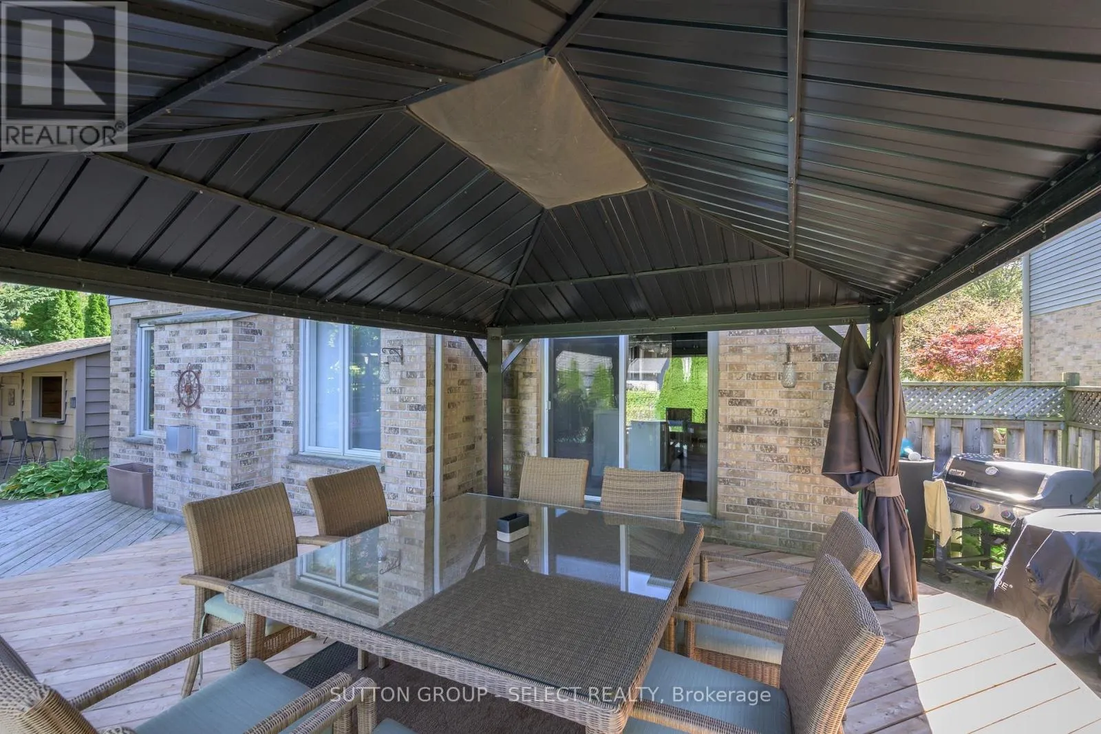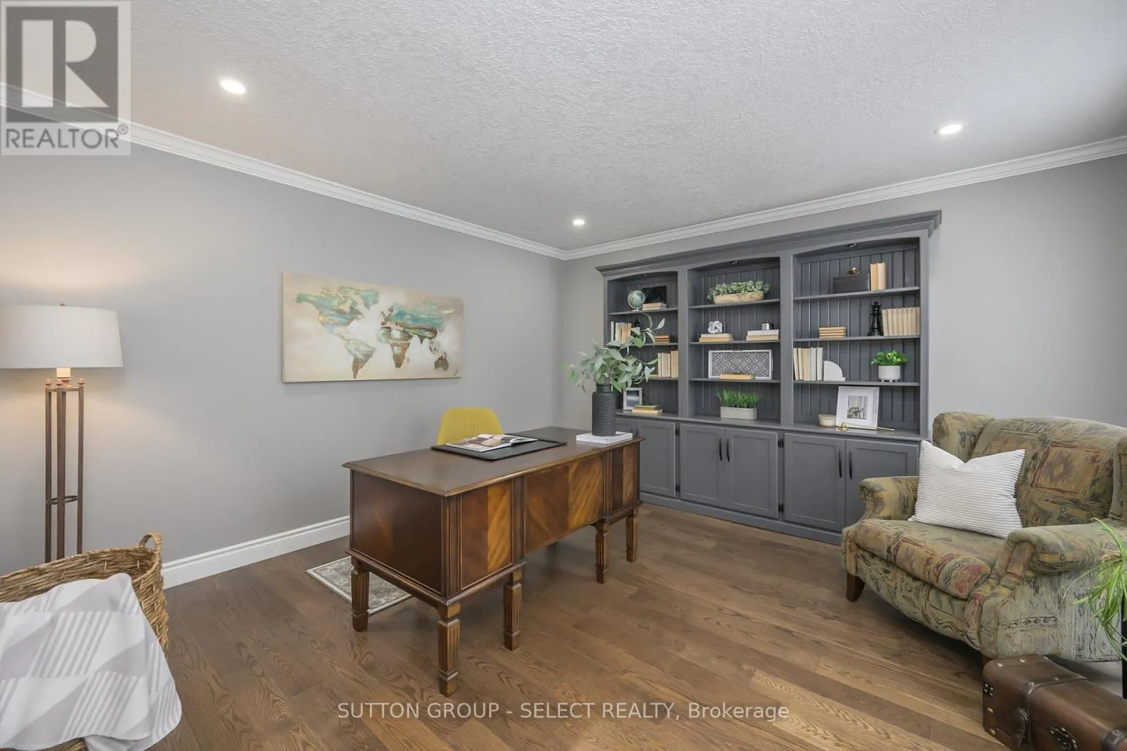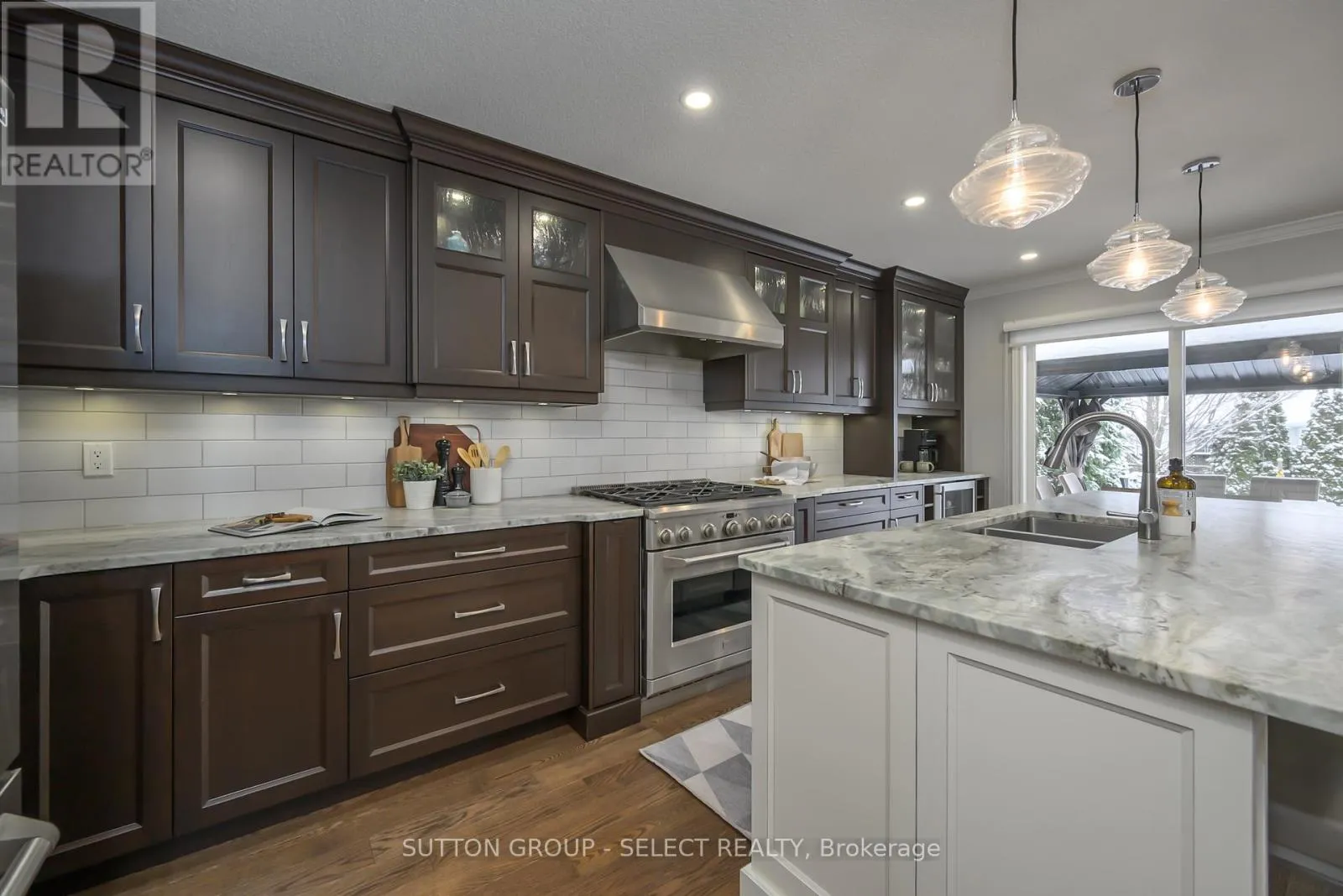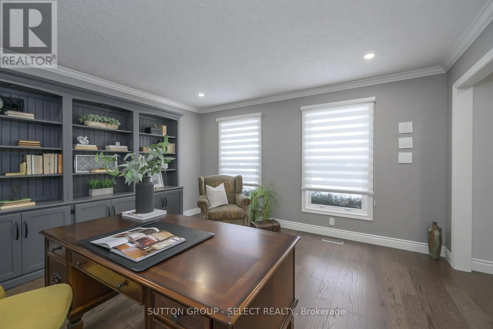 Cross Streets: Ambleside Drive & Marcus Crescent. ** Directions: Derwent Road off of Fanshawe Park Rd W, Ambleside Dr to Marcus Crescent. Set on a quiet crescent in the Masonville Public School catchment, this exquisitely upgraded executive home delivers refined living and a resort-style backyard retreat rarely found in the city. Minutes to Western University, University Hospital, St. Joseph's, Sunningdale Golf, and Ivey, the location is unmatched for academic, medical, and professional families. Playgrounds, community parks, and the Medway Valley Heritage Forest trail system elevate the lifestyle with nature just steps away. Inside, the home offers a warm, polished atmosphere with a gracious foyer, separate dining room, and a sun-filled living room with a fireplace and sweeping backyard views. A main-floor office provides a quiet, private workspace set apart from the principal rooms. Premium window treatments, rich hardwood flooring, and fresh neutral tones underscore the home's elevated aesthetic. The kitchen is a showpiece-designed with intention, luxury, and performance in mind. Wall-to-wall cabinetry creates exceptional storage and prep space. Stainless appliances include an impressive 6-burner gas range, while espresso cabinetry with backlit rain-glass uppers adds dramatic depth. Granite surfaces enhance the space and the contrast-tone, 4-seat island. The laundry/mudroom enhances daily function with built-in cabinetry, a full folding counter, and garage access. Upstairs, the generous primary suite offers a walk-in closet and a spacious ensuite. Three additional bedrooms share a refreshed main bath, and the lower level provides substantial storage and future potential. The backyard is the true showstopper: a heated pool anchors a private outdoor resort with multiple zones for lounging, dining, entertaining, and relaxing. A pergola lounge, tiki hut/bar, dining gazebo, and manicured green space framed by mature trees create a setting that feels worlds away. With a double garage and commanding curb appeal, this home delivers exceptional family living in one of London's most desirable neighbourhoods. (id:27476)