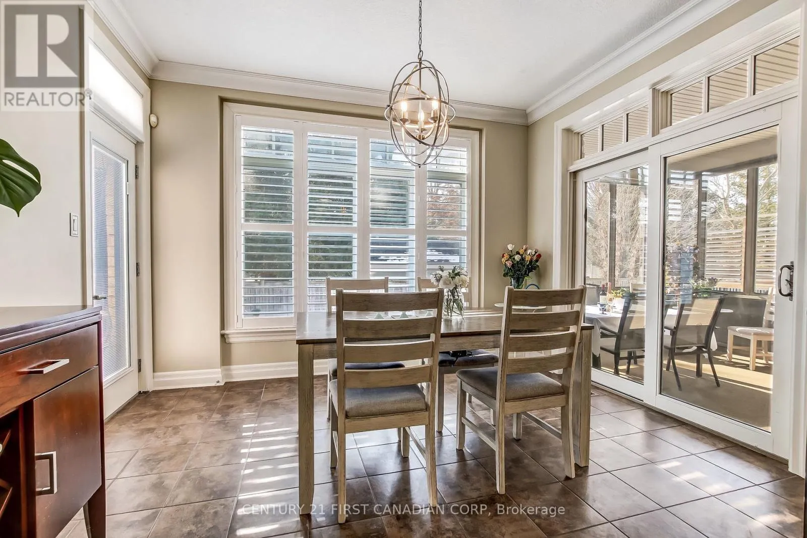 Cross Streets: Plane Tree Dr. ** Directions: From Richmond St, head west on Fanshawe Park Rd W, turn right (north) onto Valleyrun Blvd into the gated community. Welcome to The Enclave at Sunningdale, a sought-after vacant land condo community in North London. This beautifully maintained 2-storey detached home offers approximately 2,700 sq ft above grade plus a versatile lower level. From the moment you enter, you are welcomed by soaring ceilings, elegant crown moulding, wainscoting, gleaming hardwood flooring, and large windows with California shutters throughout the home. A separate formal dining room provides the perfect setting for entertaining, while the living room features a gas fireplace and large south- and east-facing windows that fill the space with natural light. The thoughtfully designed layout includes two bedrooms on the main level, including the primary suite, with an additional two bedrooms on the second floor, offering excellent separation of private living space for family or guests. The well-designed kitchen showcases rich maple cabinetry, quartz countertops, stainless steel appliances, and a spacious centre island. The sun-filled, south-facing eat-in area flows seamlessly into a covered sunroom, perfect for morning coffee or seasonal entertaining. The lower level features a large recreation space and two additional bedrooms, maximizing flexibility for extended family, guests, or hobbies. Enjoy low-maintenance living with condo fees of $340/month covering landscaping, lawn care, and snow removal, conveniently located near Masonville, Western University, shopping, and nature trails. (id:27476)
