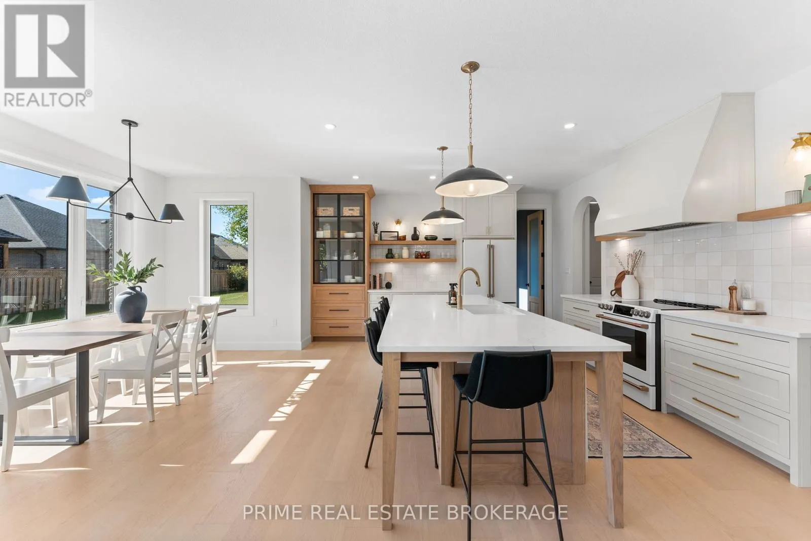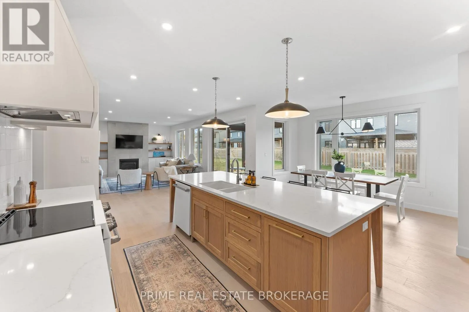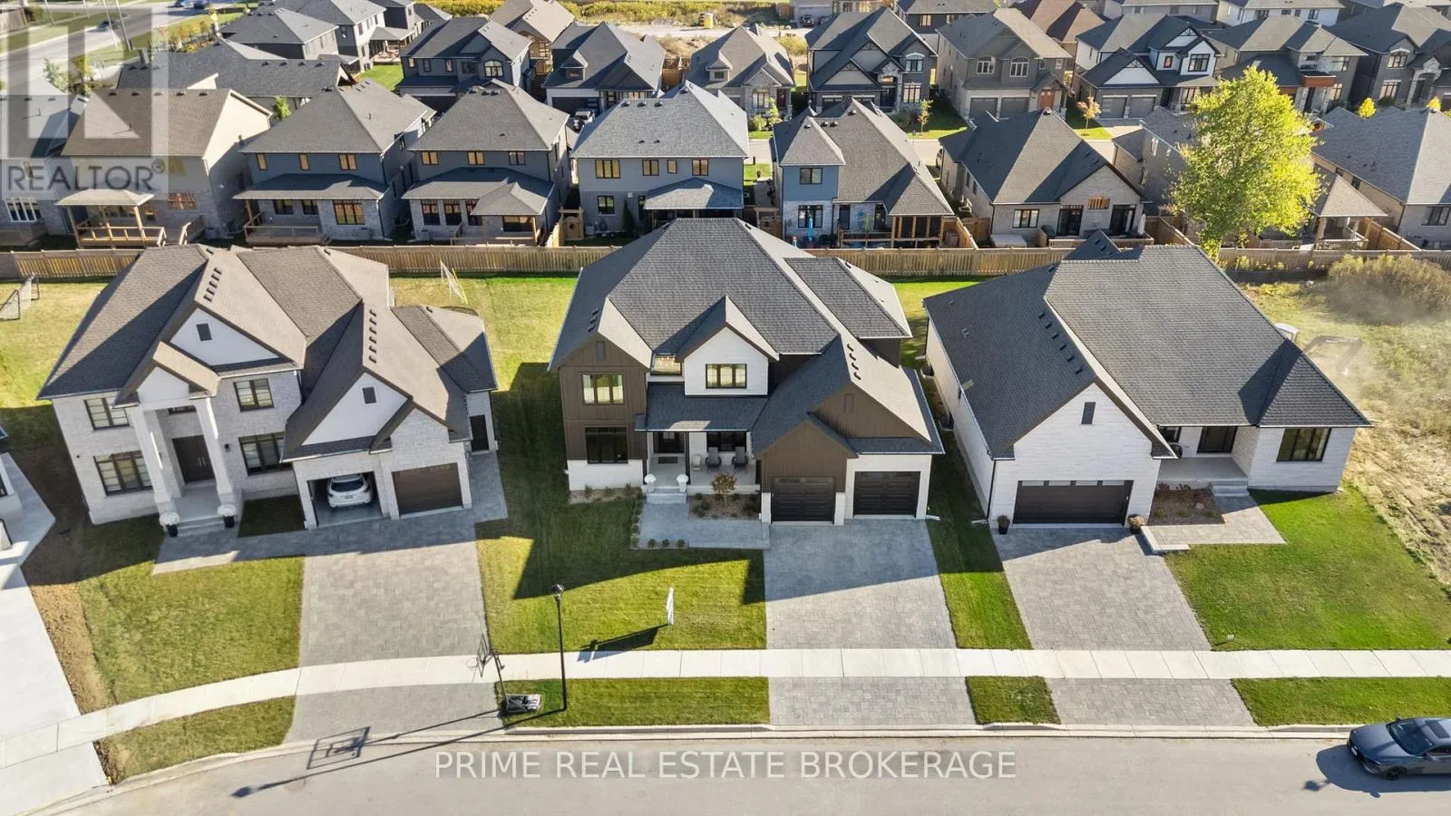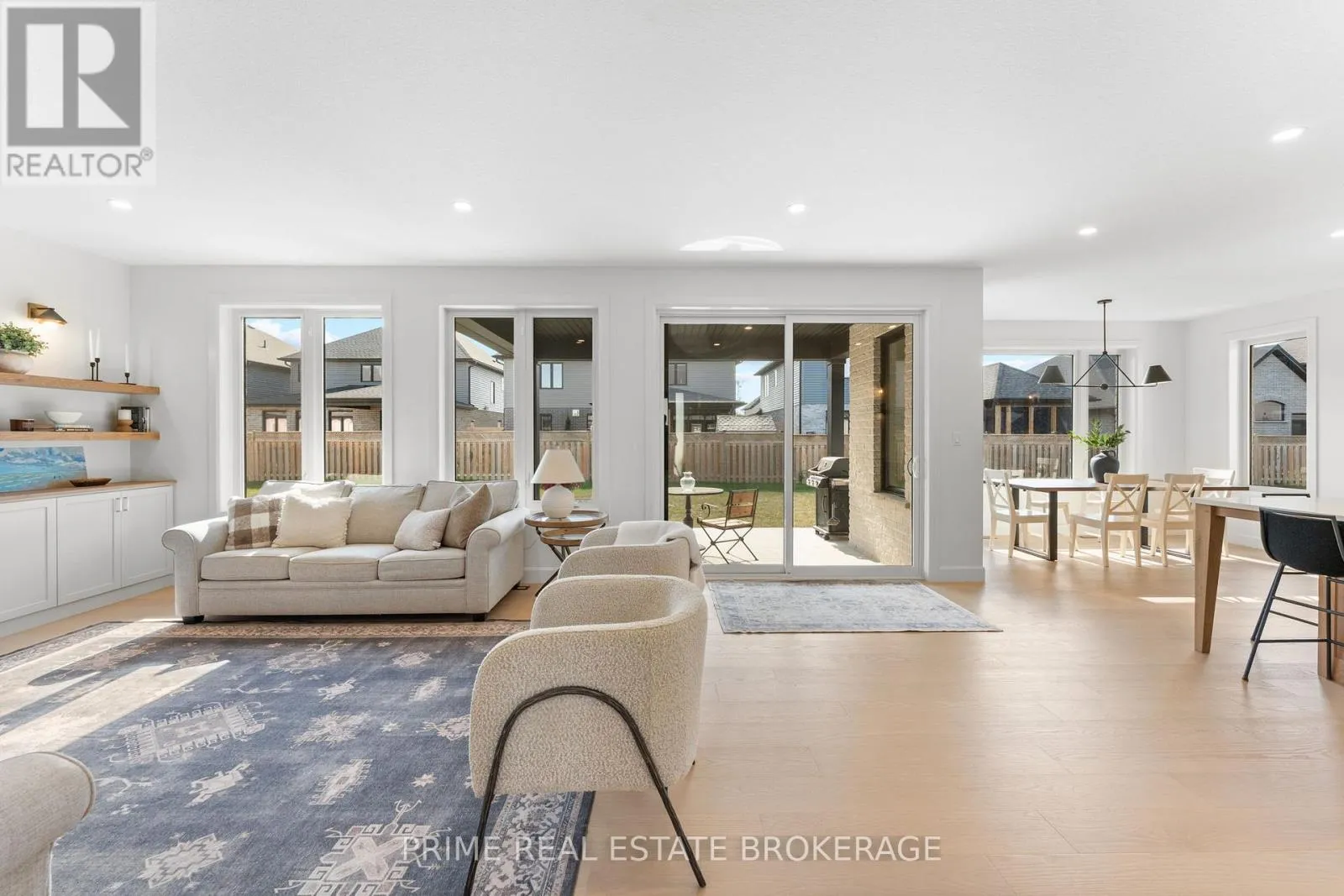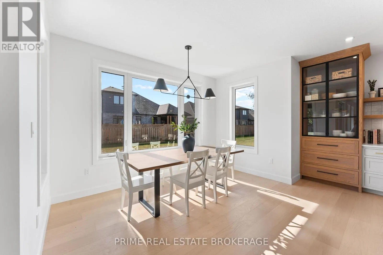 Wonderland and Eagletrace Dr Luxury, scale, and craftsmanship come together on one of Sunningdale Crossing's most desirable streets. Welcome to 1969 Buroak Crescent.Set on a premium oversized lot, this executive home offers over 4,700 sq. ft. of beautifully finished living space. It's the kind of home that feels impressive the moment you pull up, yet incredibly comfortable once you step inside.The exterior combines Arriscraft brick and Hardie board siding for timeless curb appeal.Inside, wide 714-inch engineered hardwood flows throughout the main level. Just off the foyer, French doors open to a private office ideal for working from home while the formal dining room features custom millwork and a built-in beverage fridge by Berry Woodcraft & Design.The main living area is bright and open, with 9-foot ceilings, custom built-ins, and a gas fireplace wrapped in 24x24 tile. A full wall of windows brings in natural light and overlooks the backyard. Eight-foot sliders lead to a covered concrete porch, creating an easy transition between indoor and outdoor living.The kitchen truly anchors the home. Handcrafted solid wood cabinetry by Berry Woodcraft &Design, premium GE Café appliances, and an oversized island make it as functional as it is beautiful. The adjoining dinette offers the perfect spot for everyday meals or morning coffee.Upstairs you'll find four spacious bedrooms and three full bathrooms. The primary suite feels like a retreat, complete with a spa inspired ensuite and a boutique style walk-in closet. One bedroom features its own private ensuite, while the remaining two share a well-designed bathroom with double sinks. A full laundry room with custom built-ins adds everyday practicality.The finished lower level offers even more flexibility with a bright rec room, fifth bedroom, full bath, and flex space that works equally well as a gym, studio, or playroom.1969 Buroak Crescent is a home that balances thoughtful design with real functionality. Built for modern family living. (id:27476)