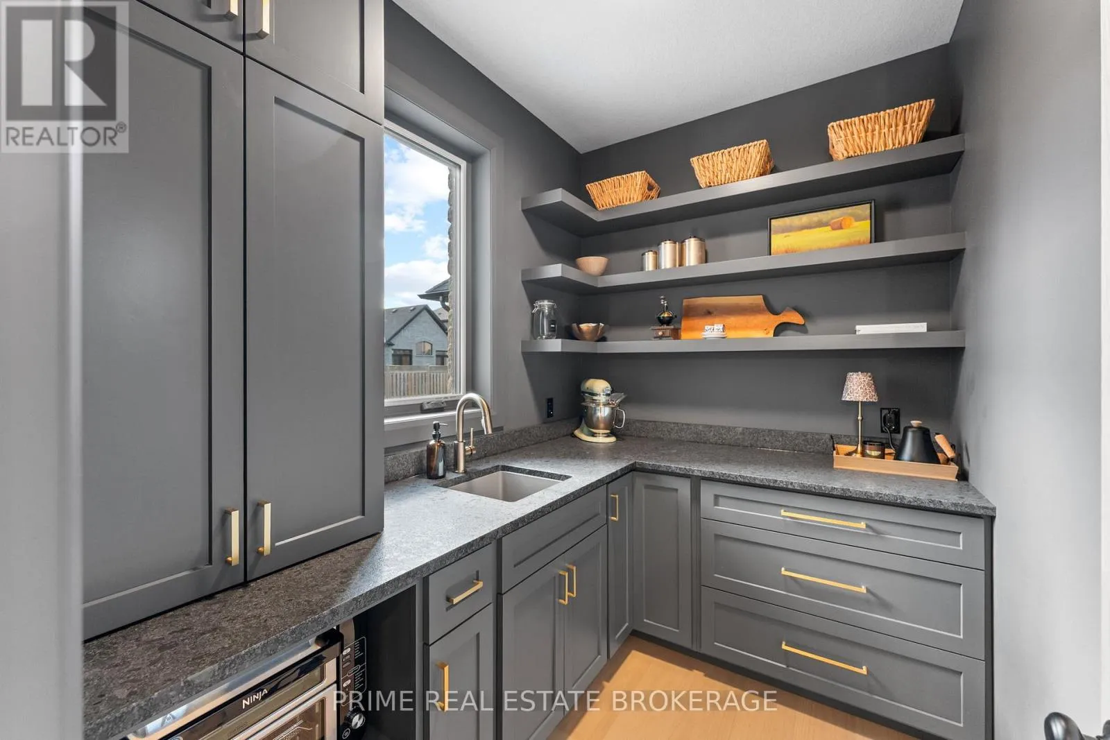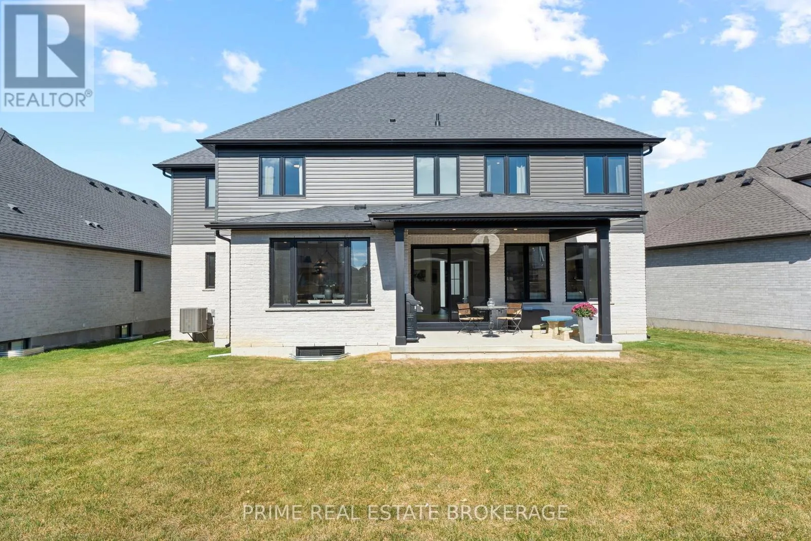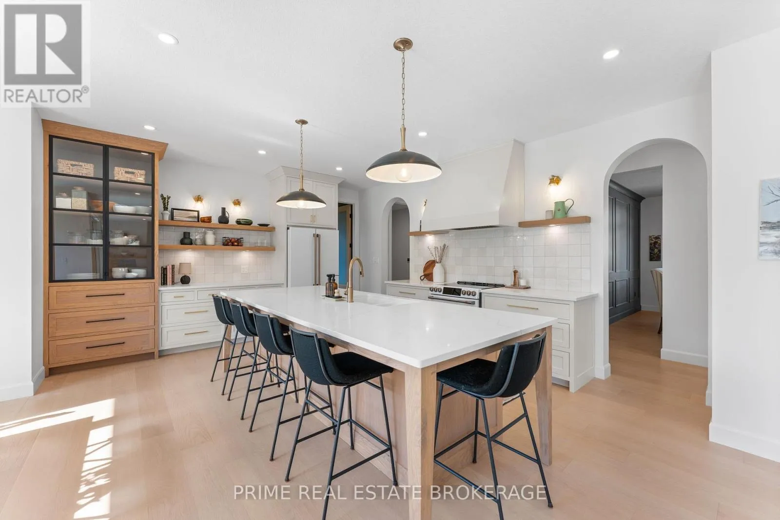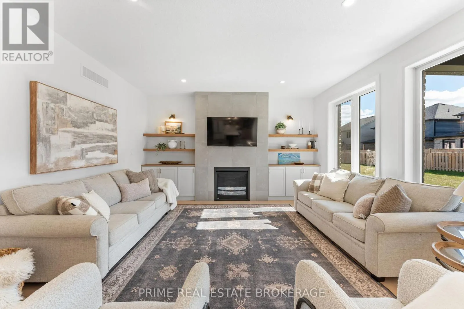 Wonderland and Eagletrace Dr Luxury, scale, and craftsmanship come together on one of Sunningdale Crossing's most desirable streets. Welcome to 1969 Buroak Crescent.Set on a premium oversized lot, this executive home offers over 4,700 sq. ft. of beautifully finished living space. It's the kind of home that feels impressive the moment you pull up, yet incredibly comfortable once you step inside.The exterior combines Arriscraft brick and Hardie board siding for timeless curb appeal.Inside, wide 714-inch engineered hardwood flows throughout the main level. Just off the foyer, French doors open to a private office ideal for working from home while the formal dining room features custom millwork and a built-in beverage fridge by Berry Woodcraft & Design.The main living area is bright and open, with 9-foot ceilings, custom built-ins, and a gas fireplace wrapped in 24x24 tile. A full wall of windows brings in natural light and overlooks the backyard. Eight-foot sliders lead to a covered concrete porch, creating an easy transition between indoor and outdoor living.The kitchen truly anchors the home. Handcrafted solid wood cabinetry by Berry Woodcraft &Design, premium GE Café appliances, and an oversized island make it as functional as it is beautiful. The adjoining dinette offers the perfect spot for everyday meals or morning coffee.Upstairs you'll find four spacious bedrooms and three full bathrooms. The primary suite feels like a retreat, complete with a spa inspired ensuite and a boutique style walk-in closet. One bedroom features its own private ensuite, while the remaining two share a well-designed bathroom with double sinks. A full laundry room with custom built-ins adds everyday practicality.The finished lower level offers even more flexibility with a bright rec room, fifth bedroom, full bath, and flex space that works equally well as a gym, studio, or playroom.1969 Buroak Crescent is a home that balances thoughtful design with real functionality. Built for modern family living. (id:27476)