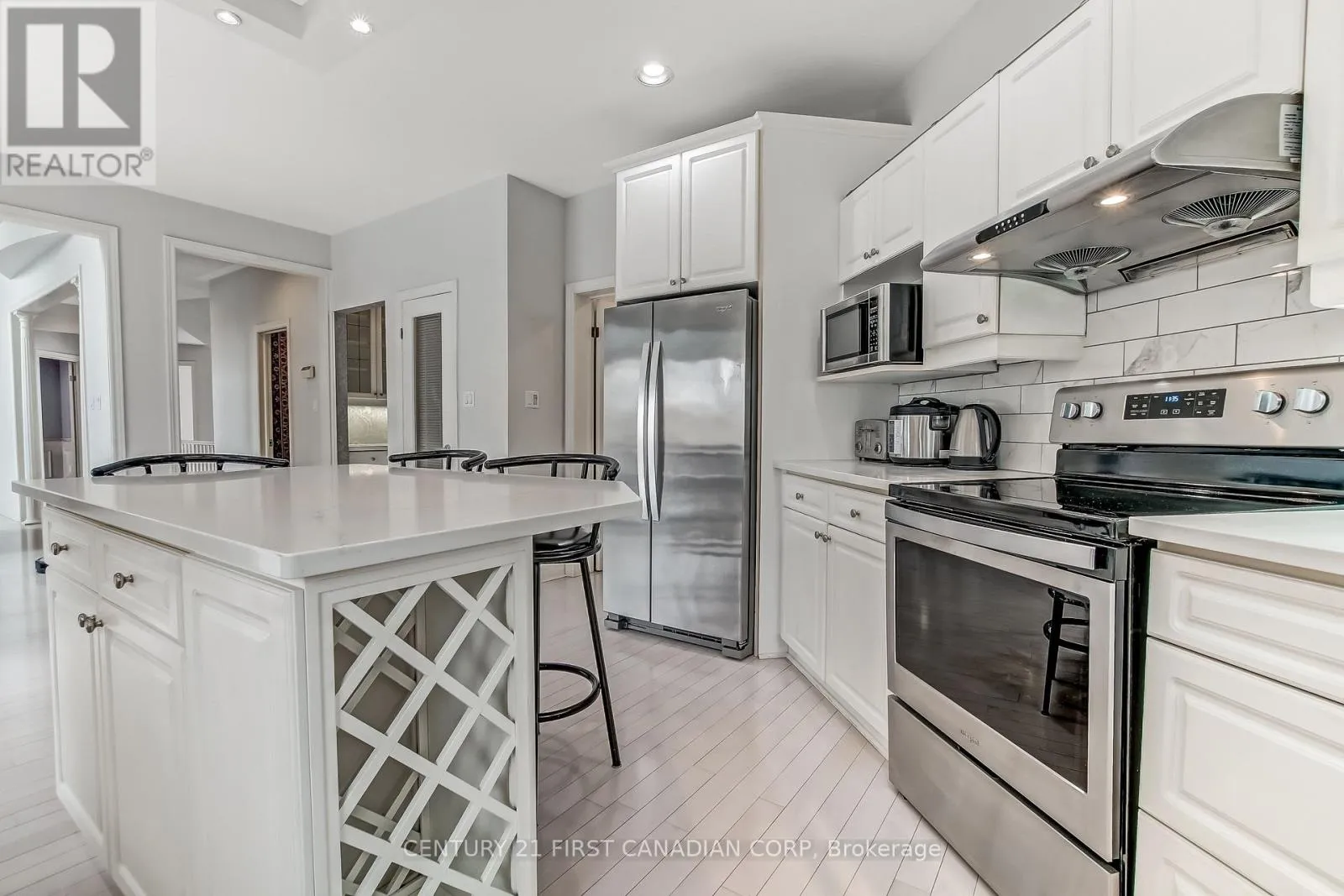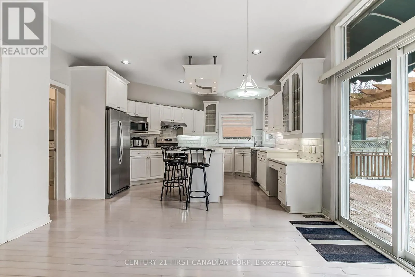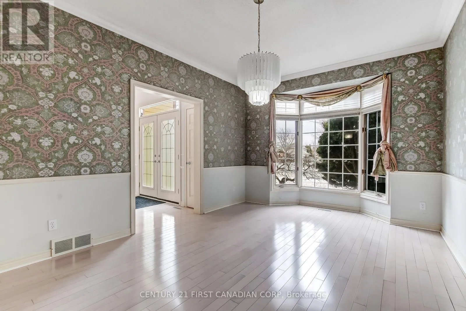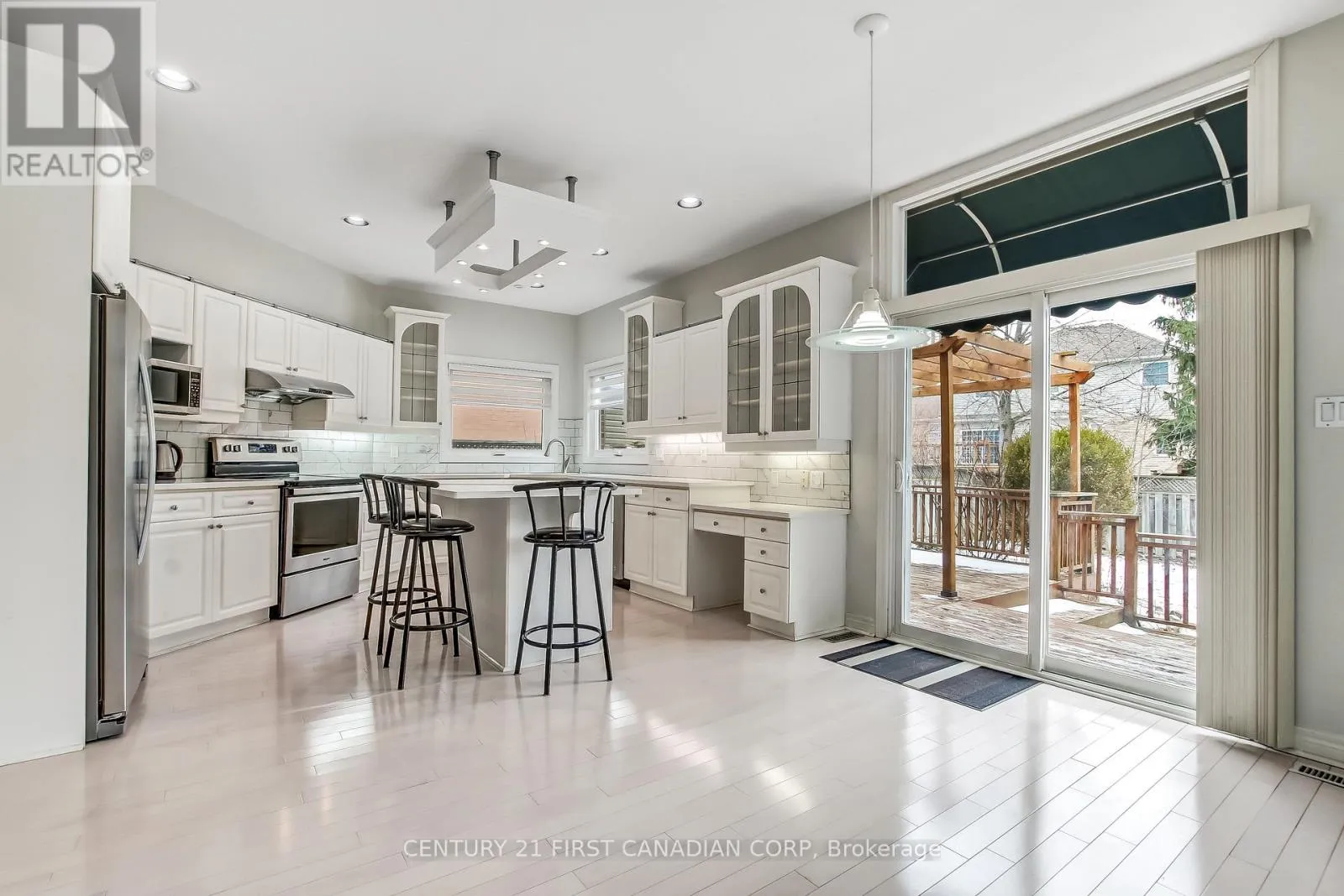 Cross Streets: Fanshawe and Wonderland. ** Directions: Turn onto Derwent Rd from Fanshawe Park rd W. Tucked away on a quiet street in one of North London's most prestigious neighborhoods, this elegant 4-bedroom, 2.5-bath two-storey home with pool offers over 3,200 sq ft plus a finished lower level of beautifully designed living space. Located in a top-ranked school district and minutes from Masonville, it offers the perfect balance of space, comfort, and convenience for family living. An impressive two-storey foyer and grand staircase create a striking first impression. Hardwood floors, crown molding, and timeless finishes flow throughout the home. The main floor features a private office, a formal dining room with wainscotting and bar area, and a dramatic two-storey great room with wall of windows and gas fireplace. The open-concept kitchen showcases quartz countertops, white cabinetry, stylish backsplash, and stainless steel appliances, seamlessly connecting to the bright dinette and outdoor space. Step outside to your private west-facing backyard retreat, complete with a large deck with pergola, wraparound patio, and kidney-shaped pool, plus generous greenspace and gardens-perfect for relaxing or entertaining. Upstairs, the spacious primary suite offers a walk-in closet and spa-inspired ensuite with soaker tub, walk-in shower, and double vanity. Three additional bedrooms and a full bath complete the second floor. The finished lower level adds flexible living space with a family room, study, recreation area, and room for future expansion. Ideally located near Masonville Place, Western University, Ivey Business School, and University Hospital, this home offers refined living in one of North London's most sought-after communities. (id:27476)