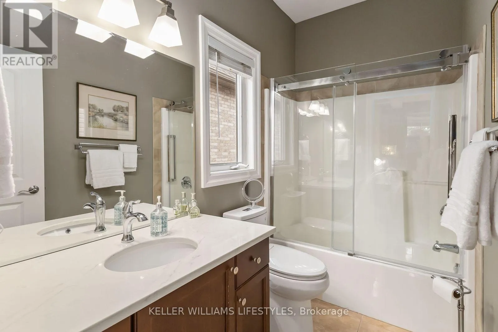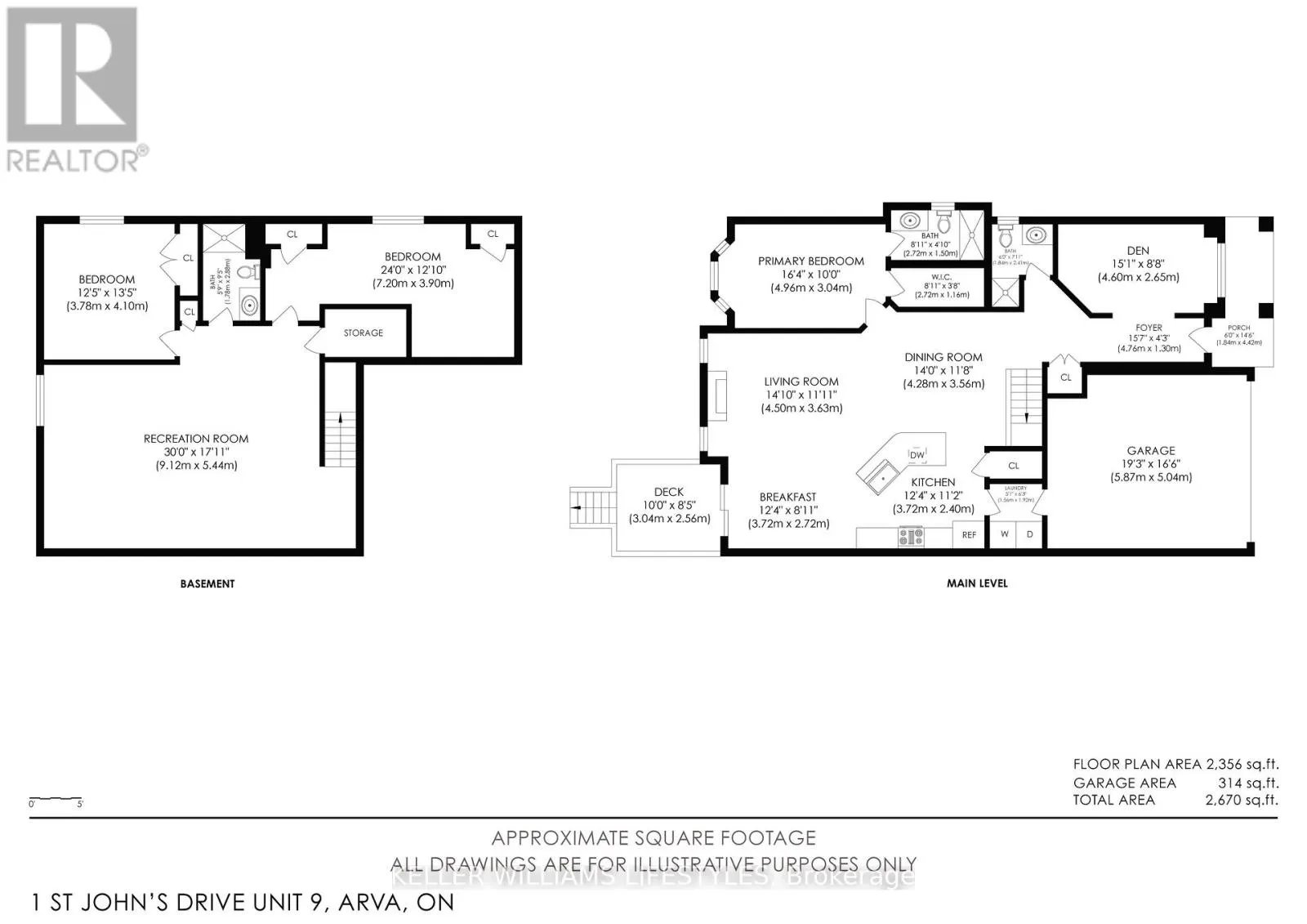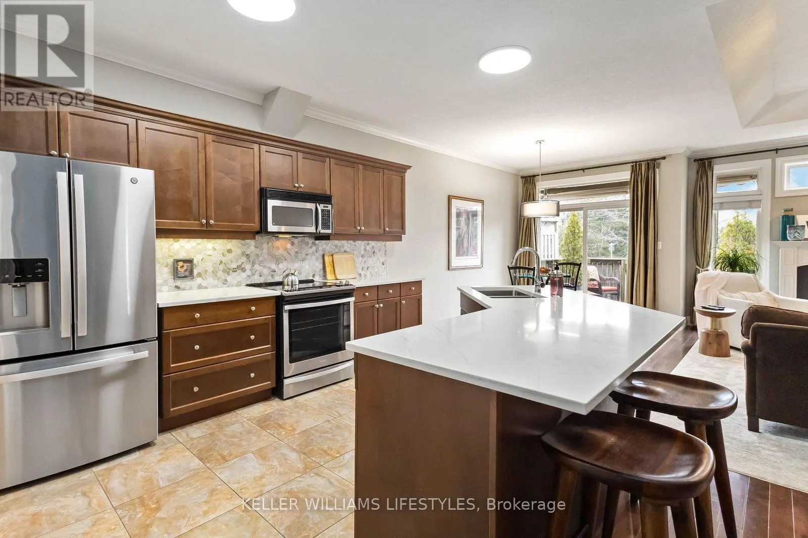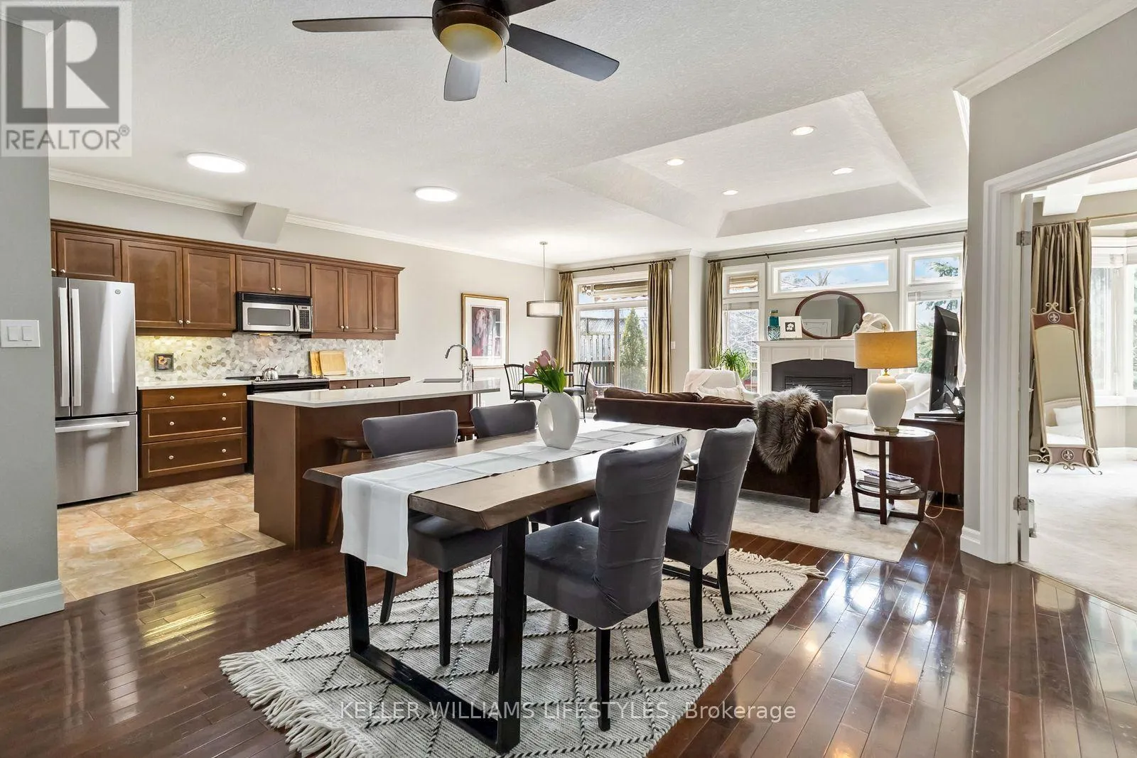 Cross Streets: Richmond Street. ** Directions: North on Richmond Street to Arva, right on St. John's Drive. Where country serenity meets city convenience. Welcome to King's Gate on the Park, nestled in the sought-after Arva enclave. This updated end unit offers 2+2 bedroom, 3-bathroom bungalow townhome offers effortless one-floor living, within steps to the scenic greenery of Weldon Park. Designed with both style and practicality in mind, the main level features hardwood floors, tray ceilings, main-floor laundry, and a versatile den that can be enclosed for a second bedroom. The open-concept living space is warmed by a cozy gas fireplace and flows seamlessly into the updated kitchen-complete with quartz countertops, stainless steel appliances and a breakfast bar overlooking a bright, sun-filled dinette. Step out onto the west-facing deck to enjoy sunset views. The primary suite offers a spacious walk-in closet and a private 4-piece ensuite. The fully finished lower level extends your living space with two generously sized bedrooms, a 3-piece bath and a large family room-perfect for a home theatre, games area or entertaining. New carpeting (2026) adds comfort to the family room and one of the bedrooms. Roofs replaced 2025. Enjoy the benefits of Arva's lower property taxes and modest condo fees, all just minutes from Masonville Mall, University Hospital and Western University. (id:27476)