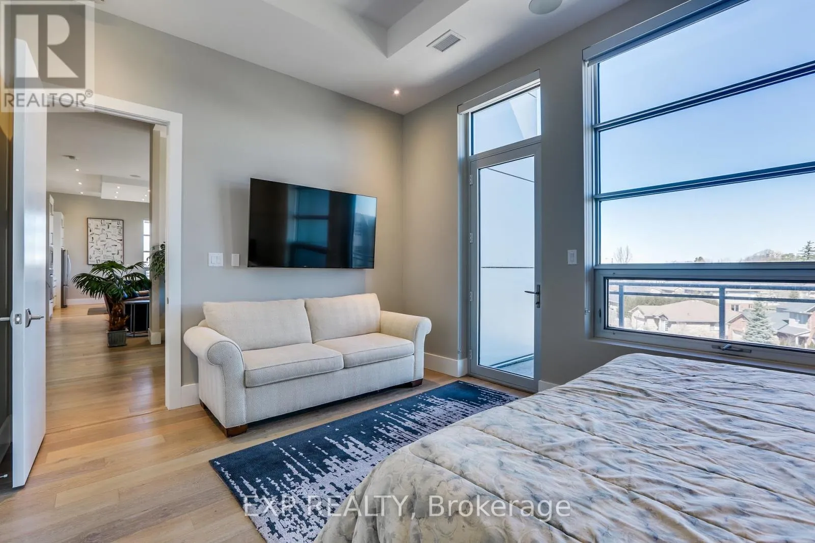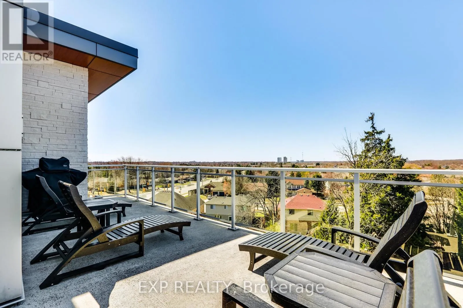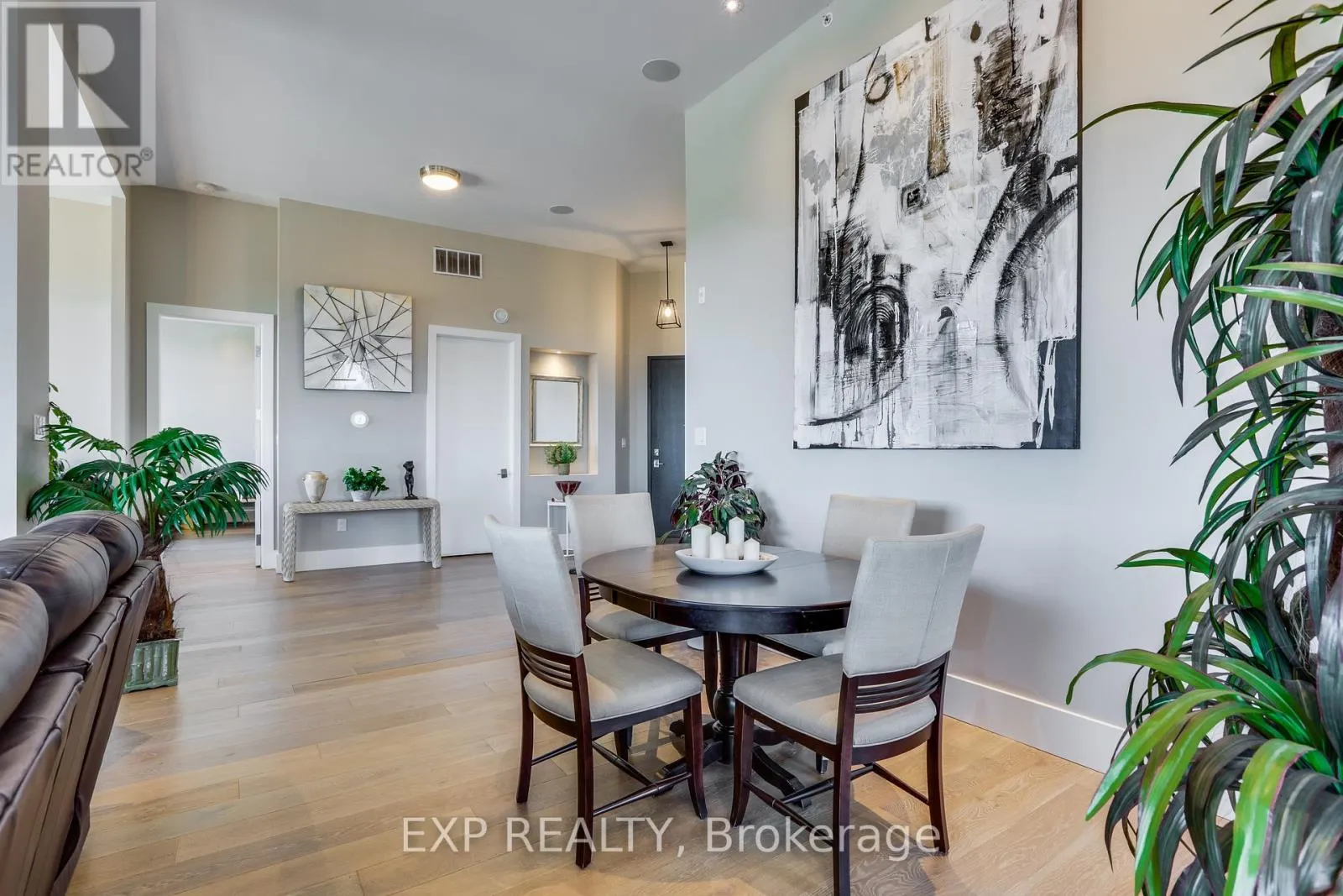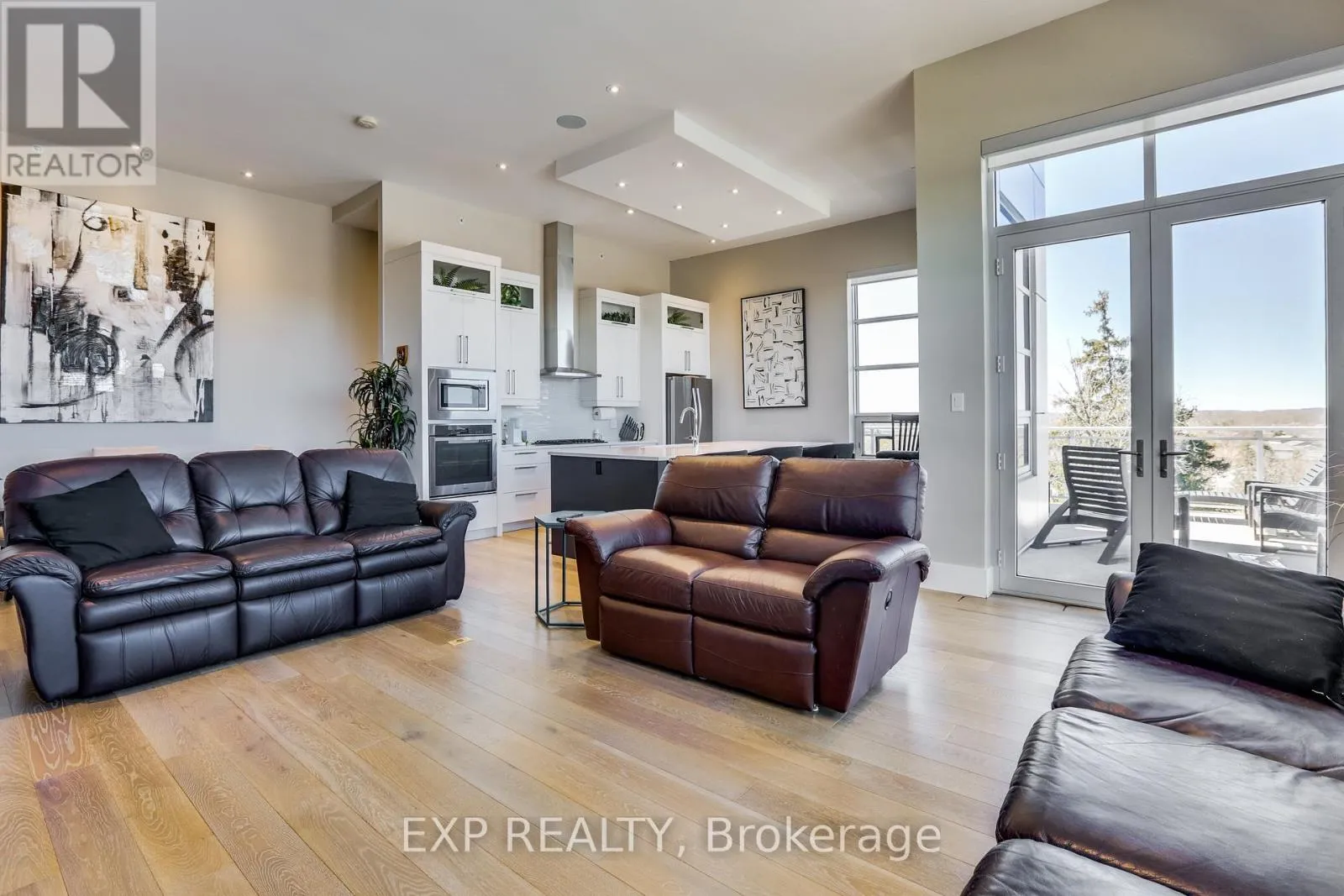 Cross Streets: Butternut. ** Directions: North on Louise, East on Butternut, to Fiddlehead. Rare opportunity to own one of the largest penthouse residences at NorthPoint, offering an impressive 1,980 square feet of elegant living space, soaring 12-foot ceilings, and exceptional outdoor living. Ideally located in sought-after northwest London, this upscale condominium is just minutes from shopping at CF Masonville Place, as well as Western University and London Health Sciences Centre - University Hospital.Designed for both comfortable daily living and stylish entertaining, the open concept great room is filled with natural light from expansive windows and features remote-controlled blinds, a cozy fireplace, and dramatic ceiling heights rarely found in condominium living. The beautifully appointed kitchen showcases quartz countertops, built-in Whirlpool appliances including oven and microwave, gas cooktop burners, and generous workspace ideal for the home chef.A standout feature of this penthouse is the expansive corner balcony, perfectly positioned to capture both north and east exposures and enjoy beautiful morning light along with sweeping views. A second private balcony off the primary bedroom provides a peaceful retreat to start or end the day.The spacious primary suite offers excellent closet space and a luxurious ensuite bath, while the second bedroom is well suited for guests. Additionally, enjoy the convenience of a home office or den. Throughout the residence, rooms are pre-wired for ceiling speakers, allowing seamless integration of whole-home audio.Additional highlights include two underground parking spaces, exclusive storage locker, and a secure, well-managed building in one of North London's most desirable condominium communities.Offering generous space, luxury features and an exceptional location, this penthouse presents a rare opportunity for those seeking refined condominium living without compromise. (id:27476)