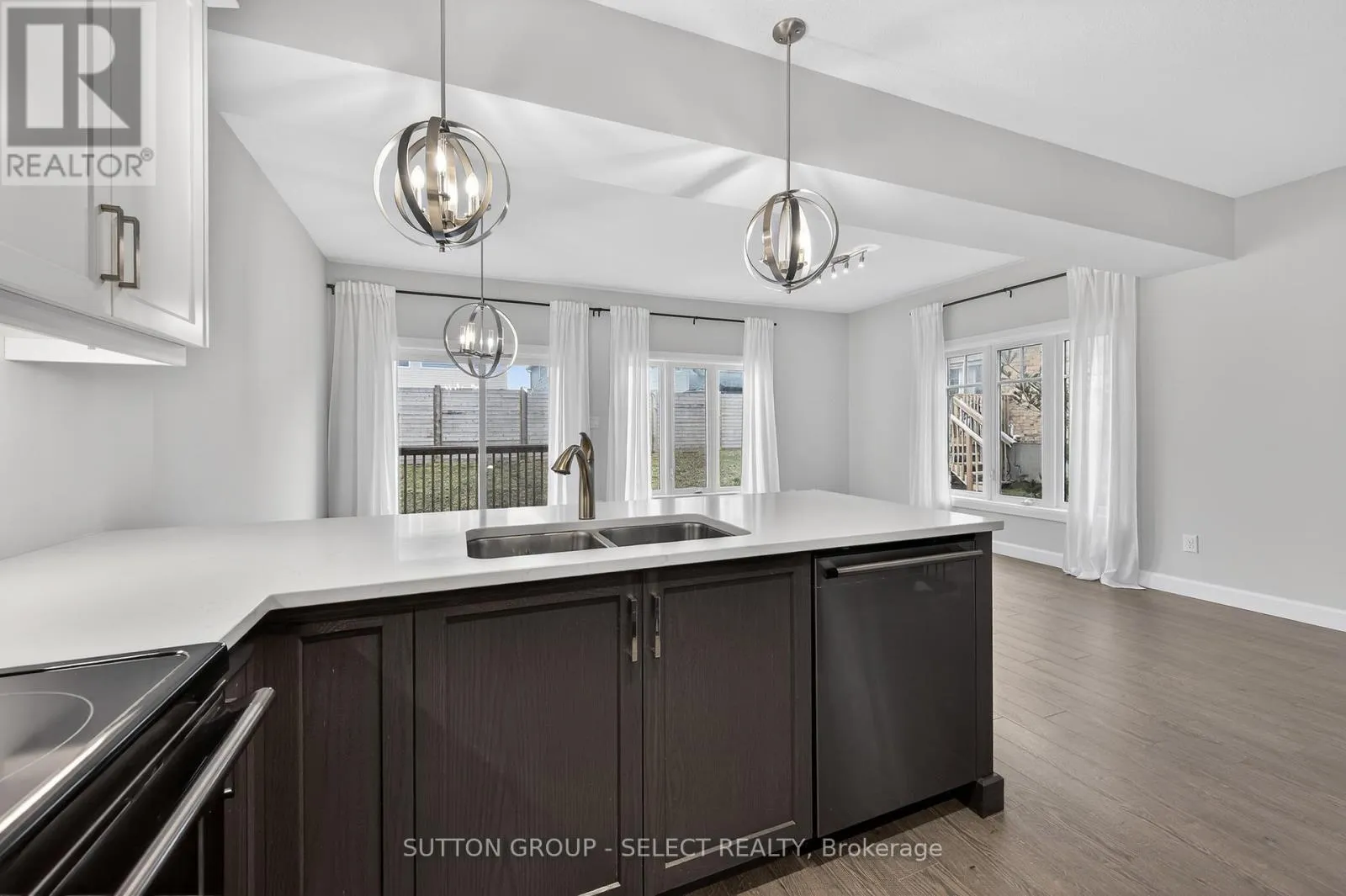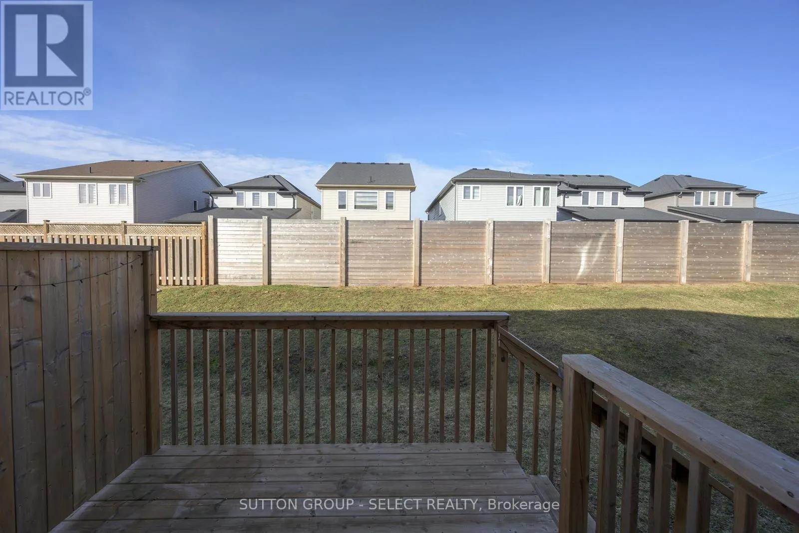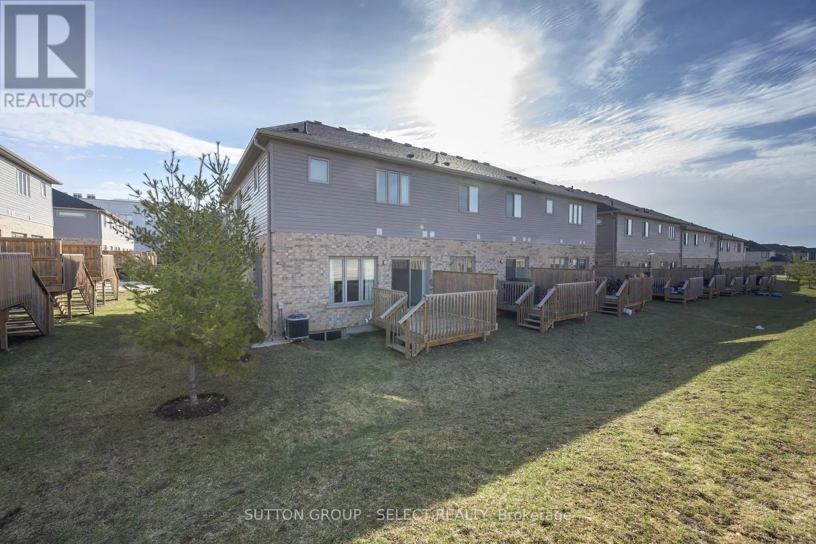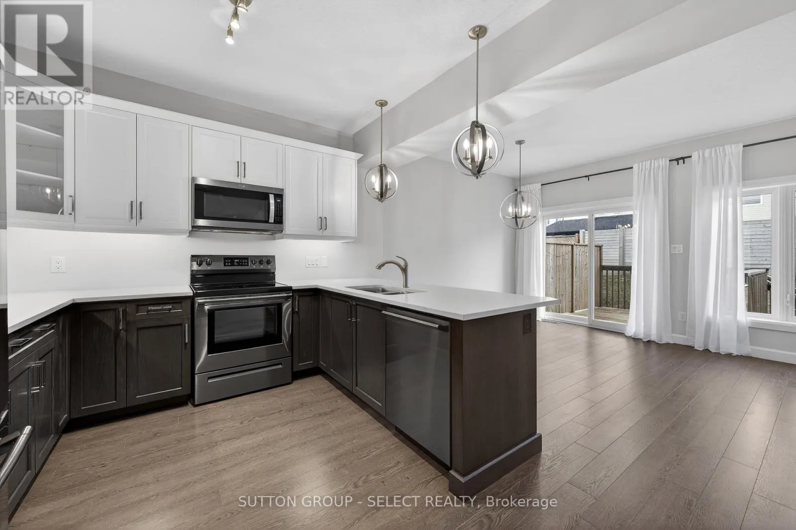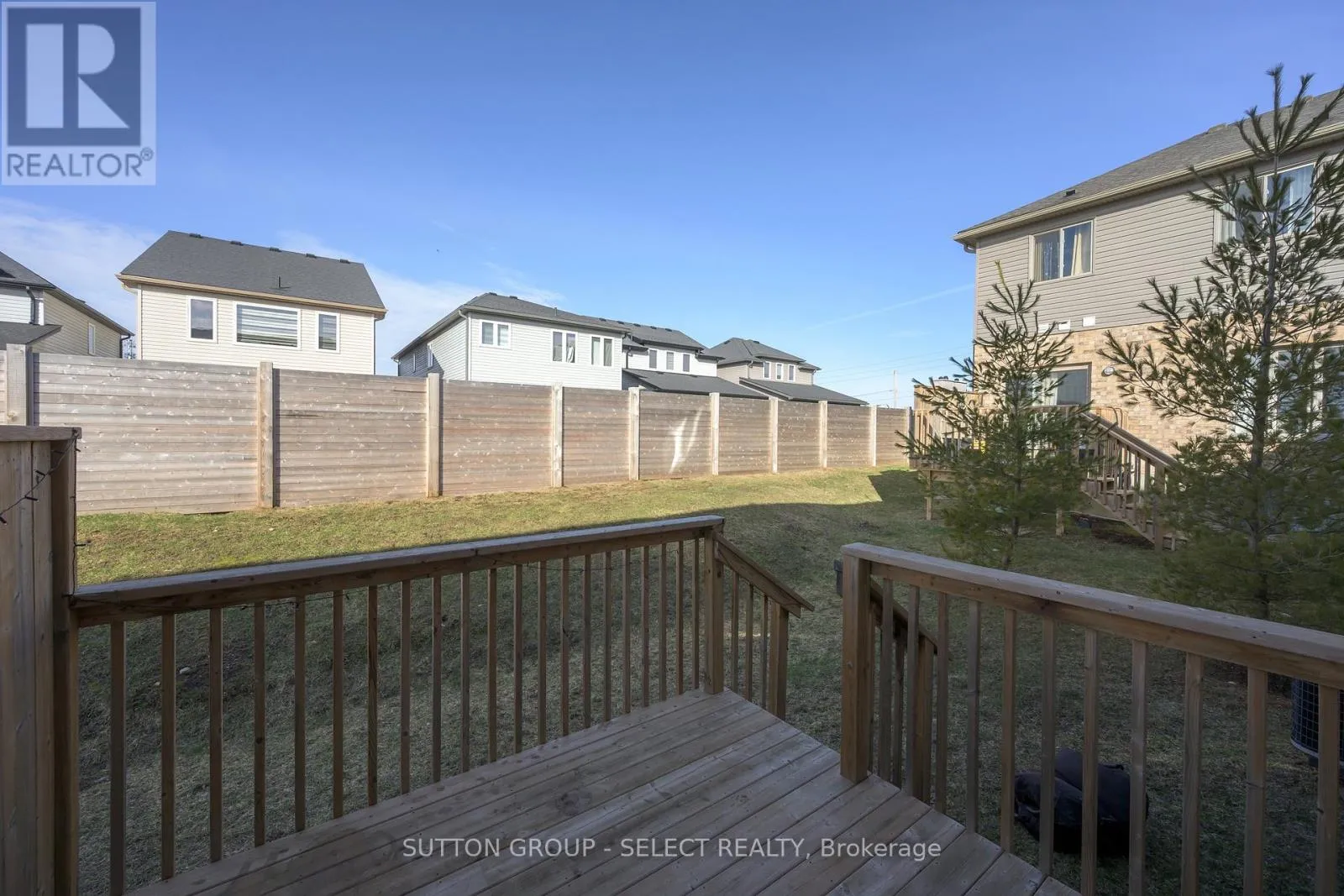 Cross Streets: Fanshawe Pk Rd E & Cedarhollow Blvd. ** Directions: East on Fanshawe Park Rd East, South on Cedarhollow Blvd, turn on Guiness Way. Welcome home at 29-600 Guiness Way in sought after Cedar Hollow! This 2021 Auburn Built property at the peak of the elevation in the subdivision is sure to impress. Sleek finishes, contemporary paint tones, and loads of natural sunlight from various large windows throughout. Foyer offers a powder and a front-hall closet. The bright main floor offers a gracious living area, dining space, and eat-in kitchen with contrast dark, charcoal-grey and crisp-white cabinetry, upgraded pendant lighting over the quartz peninsula and surfaces, Black stainless steel appliances and built-in microwave. Step up the modern staircase to a landing with a built-in desk for an easy office space, a common 4pc tiled bath, 3 spacious bedrooms including the Primary suite that offers a deep walk-in closet and a 3pc tiled ensuite. The yard offers a lovely step-down deck for morning coffee in warm weather. Side yard on this corner unit boasts trees that offer privacy and green views. Lower level is yours to create! This beautiful home is close to the new Stoney Creek shopping plaza, trails & access to Thames Valley Parkway, Fanshawe Conservation area, excellent schools, and fantastic access to the 401. Quiet, newer subdivision in a excellent location. Images of rooms with furniture & decor are virtually staged. (id:27476)