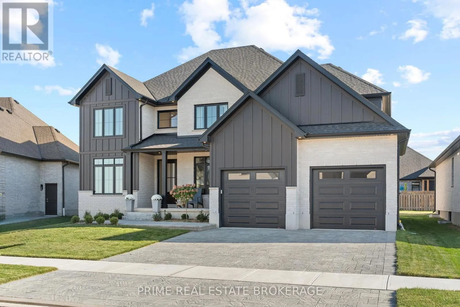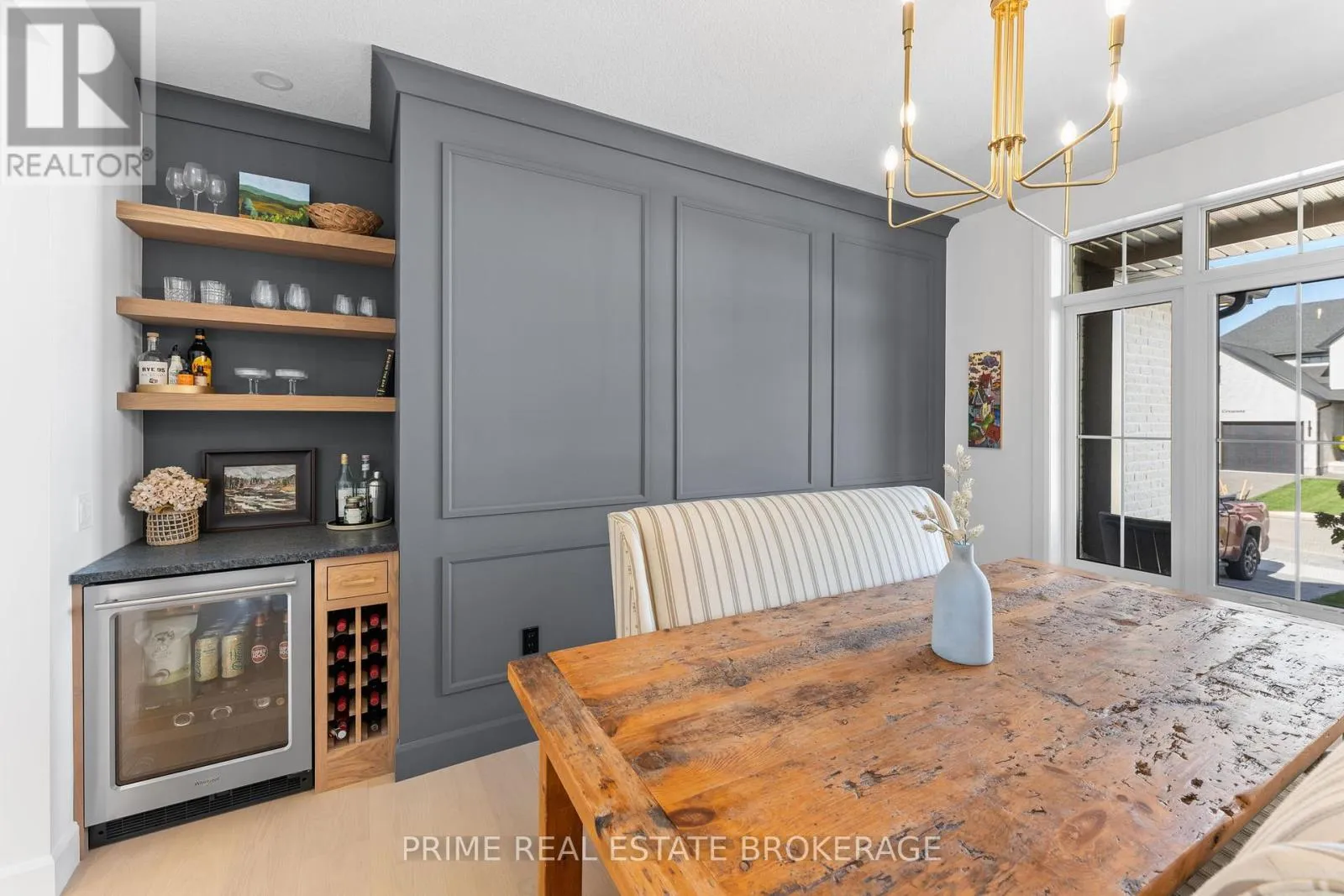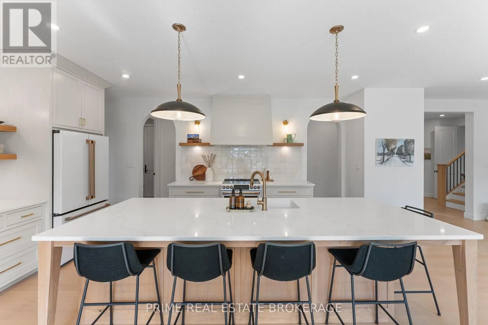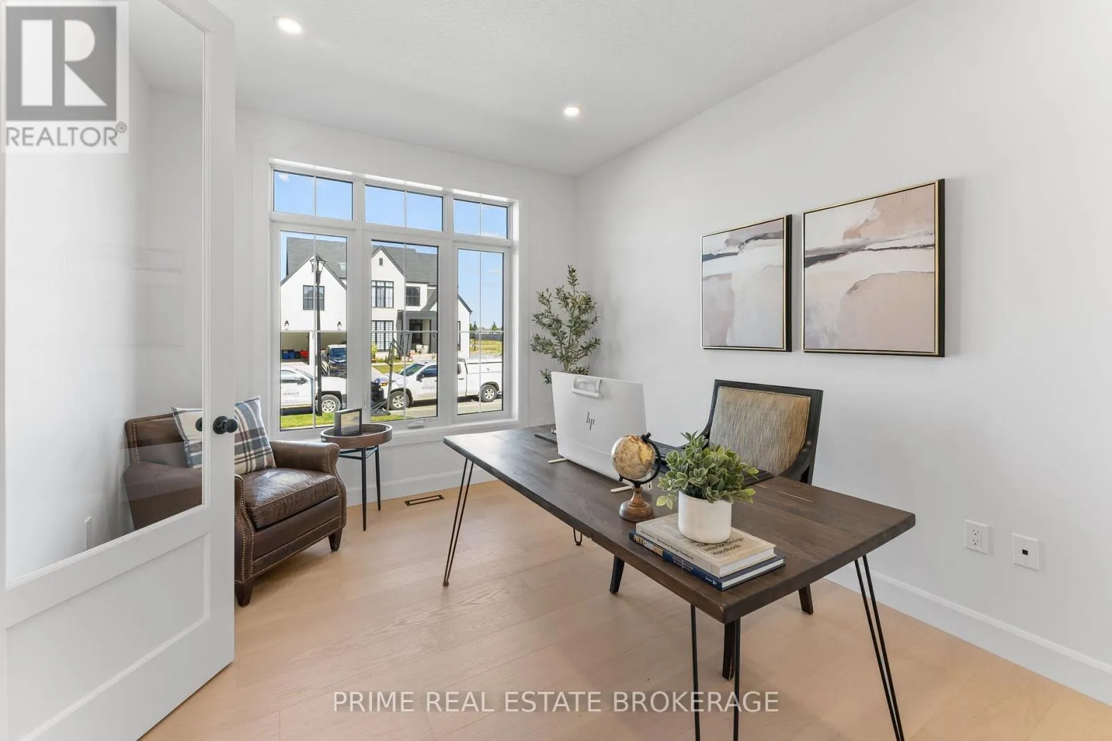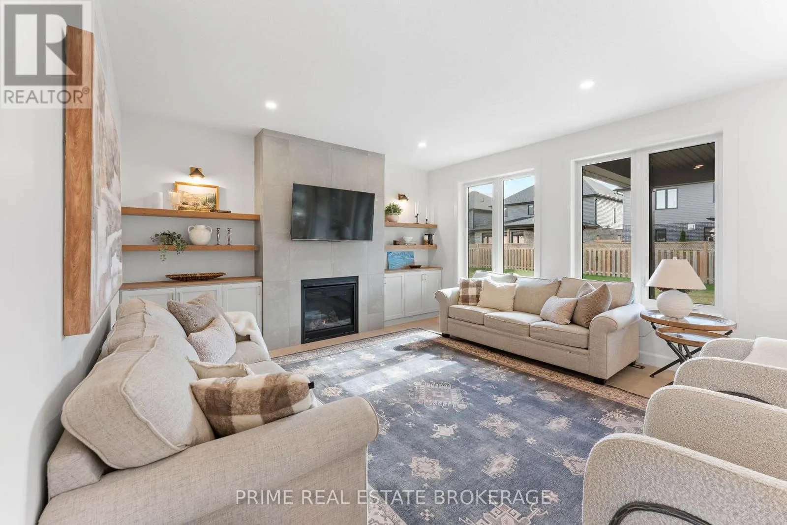 Wonderland and Eagletrace Dr Luxury, scale, and craftsmanship come together on one of Sunningdale Crossing's most desirable streets. Welcome to 1969 Buroak Crescent.Set on a premium oversized lot, this executive home offers over 4,700 sq. ft. of beautifully finished living space. It's the kind of home that feels impressive the moment you pull up, yet incredibly comfortable once you step inside.The exterior combines Arriscraft brick and Hardie board siding for timeless curb appeal.Inside, wide 714-inch engineered hardwood flows throughout the main level. Just off the foyer,French doors open to a private office ideal for working from home while the formal dining room features custom millwork and a built-in beverage fridge by Berry Woodcraft & Design.The main living area is bright and open, with 9-foot ceilings, custom built-ins, and a gas fireplace wrapped in 24x24 tile. A full wall of windows brings in natural light and overlooks the backyard. Eight-foot sliders lead to a covered concrete porch, creating an easy transition between indoor and outdoor living.The kitchen truly anchors the home. Handcrafted solid wood cabinetry by Berry Woodcraft & Design, premium GE Café appliances, and an oversized island make it as functional as it is beautiful. The adjoining dinette offers the perfect spot for everyday meals or morning coffee.Upstairs you'll find four spacious bedrooms and three full bathrooms. The primary suite feels like a retreat, complete with a spa inspired ensuite and a boutique style walk-in closet. One bedroom features its own private ensuite, while the remaining two share a well-designed bathroom with double sinks. A full laundry room with custom built-ins adds everyday practicality.The finished lower level offers even more flexibility with a bright rec room, fifth bedroom, full bath, and flex space that works equally well as a gym, studio, or playroom.1969 Buroak Crescent is a home that balances thoughtful design with real functionality. Built for modern family living. (id:27476)