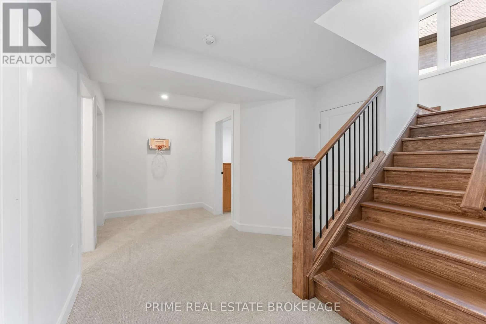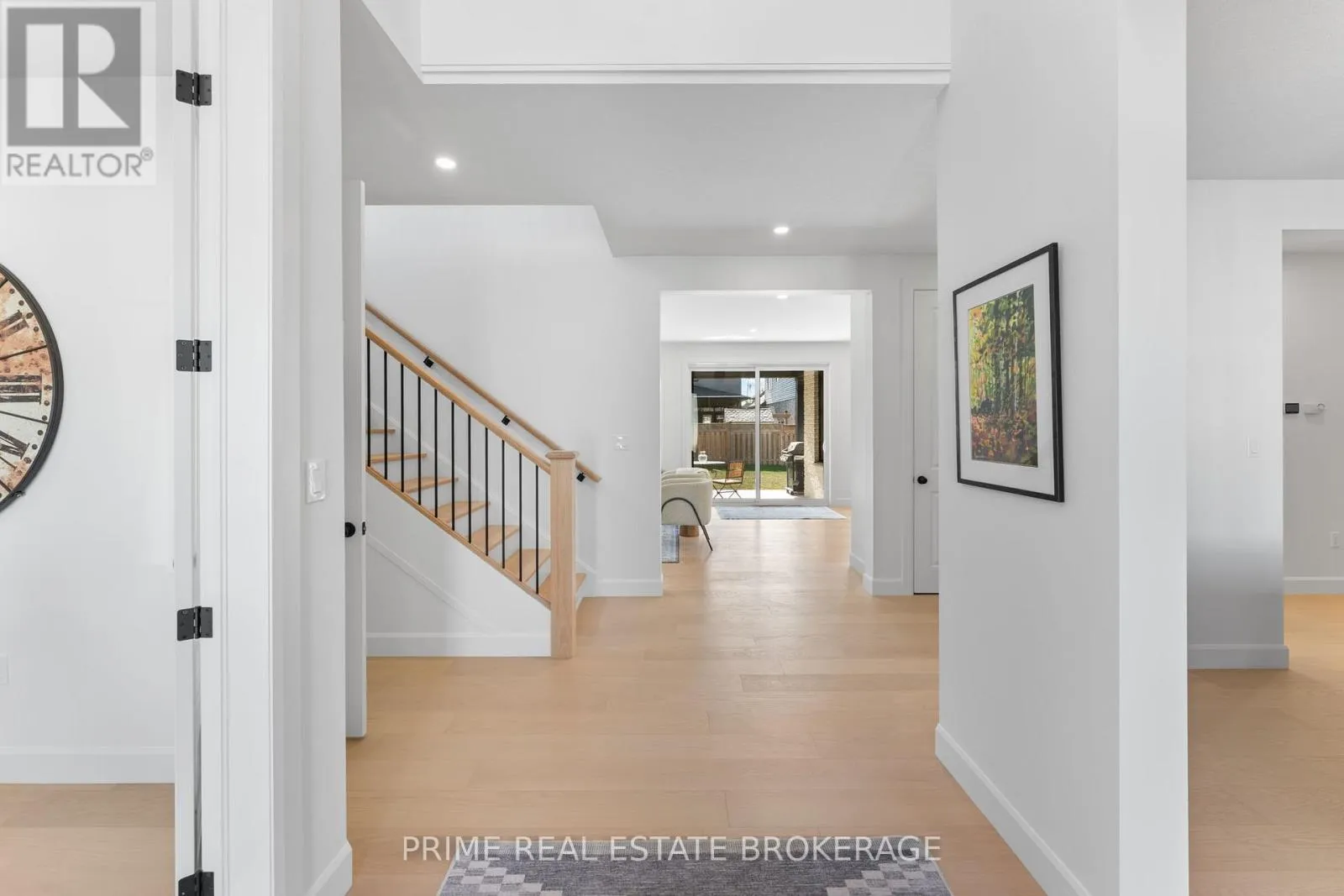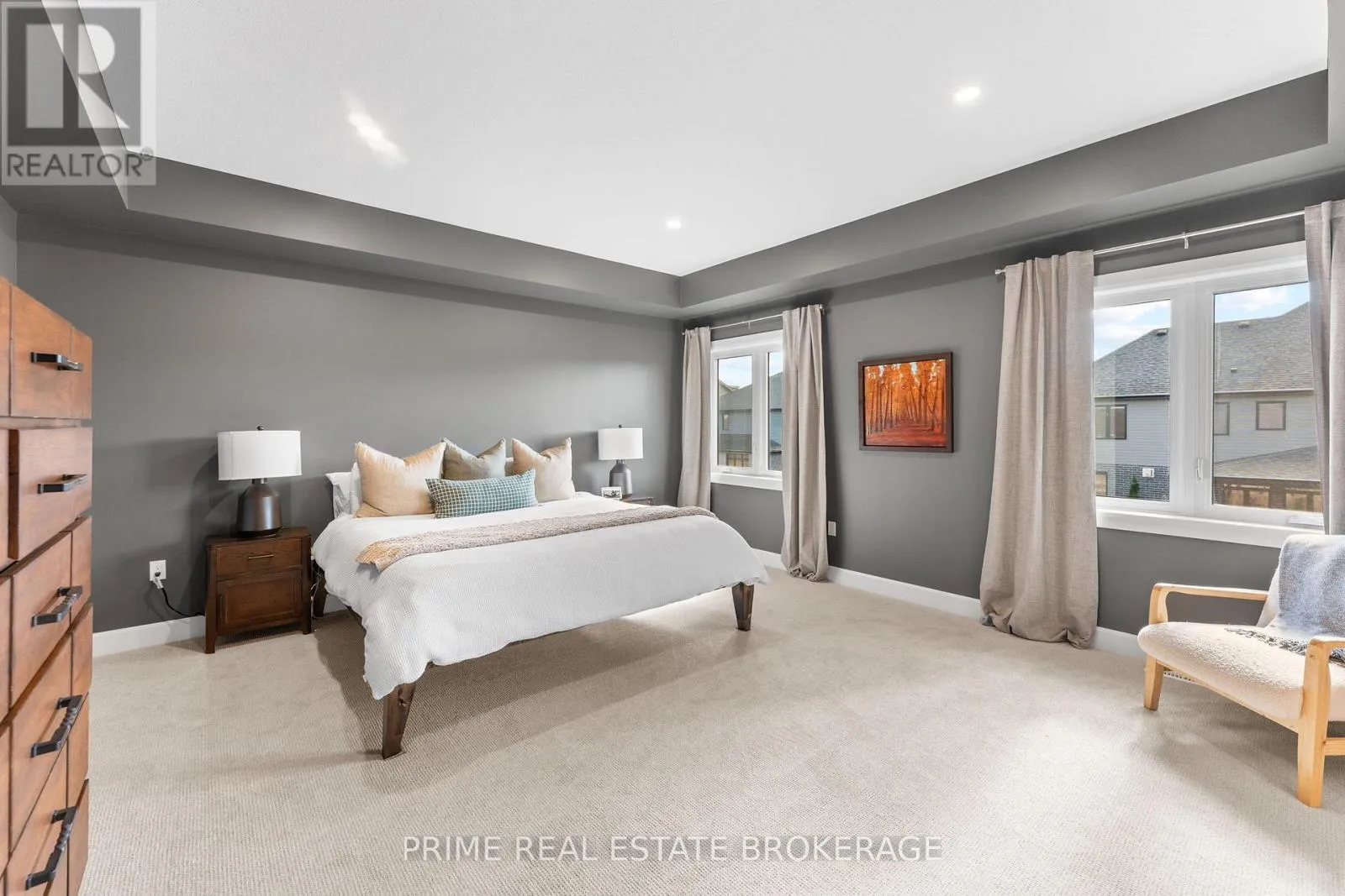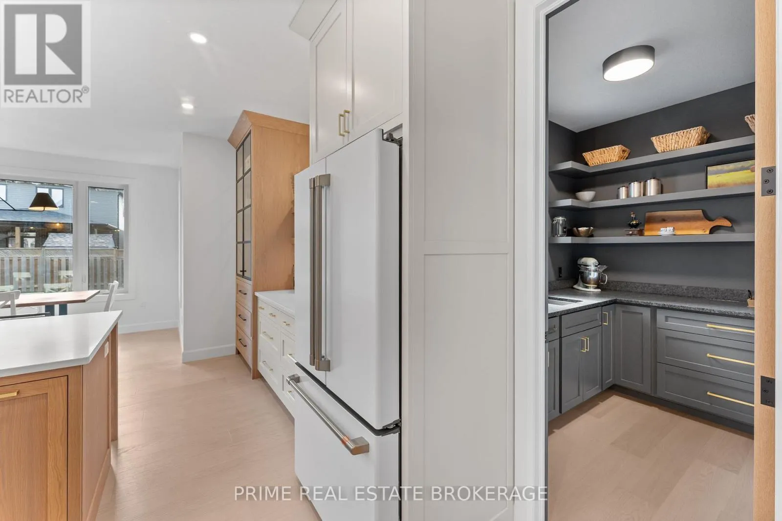Wonderland and Eagletrace Dr Luxury, scale, and craftsmanship come together on one of Sunningdale Crossing's most desirable streets. Welcome to 1969 Buroak Crescent.Set on a premium oversized lot, this executive home offers over 4,700 sq. ft. of beautifully finished living space. It's the kind of home that feels impressive the moment you pull up, yet incredibly comfortable once you step inside.The exterior combines Arriscraft brick and Hardie board siding for timeless curb appeal.Inside, wide 714-inch engineered hardwood flows throughout the main level. Just off the foyer,French doors open to a private office ideal for working from home while the formal dining room features custom millwork and a built-in beverage fridge by Berry Woodcraft & Design.The main living area is bright and open, with 9-foot ceilings, custom built-ins, and a gas fireplace wrapped in 24x24 tile. A full wall of windows brings in natural light and overlooks the backyard. Eight-foot sliders lead to a covered concrete porch, creating an easy transition between indoor and outdoor living.The kitchen truly anchors the home. Handcrafted solid wood cabinetry by Berry Woodcraft & Design, premium GE Café appliances, and an oversized island make it as functional as it is beautiful. The adjoining dinette offers the perfect spot for everyday meals or morning coffee.Upstairs you'll find four spacious bedrooms and three full bathrooms. The primary suite feels like a retreat, complete with a spa inspired ensuite and a boutique style walk-in closet. One bedroom features its own private ensuite, while the remaining two share a well-designed bathroom with double sinks. A full laundry room with custom built-ins adds everyday practicality.The finished lower level offers even more flexibility with a bright rec room, fifth bedroom, full bath, and flex space that works equally well as a gym, studio, or playroom.1969 Buroak Crescent is a home that balances thoughtful design with real functionality. Built for modern family living. (id:27476)