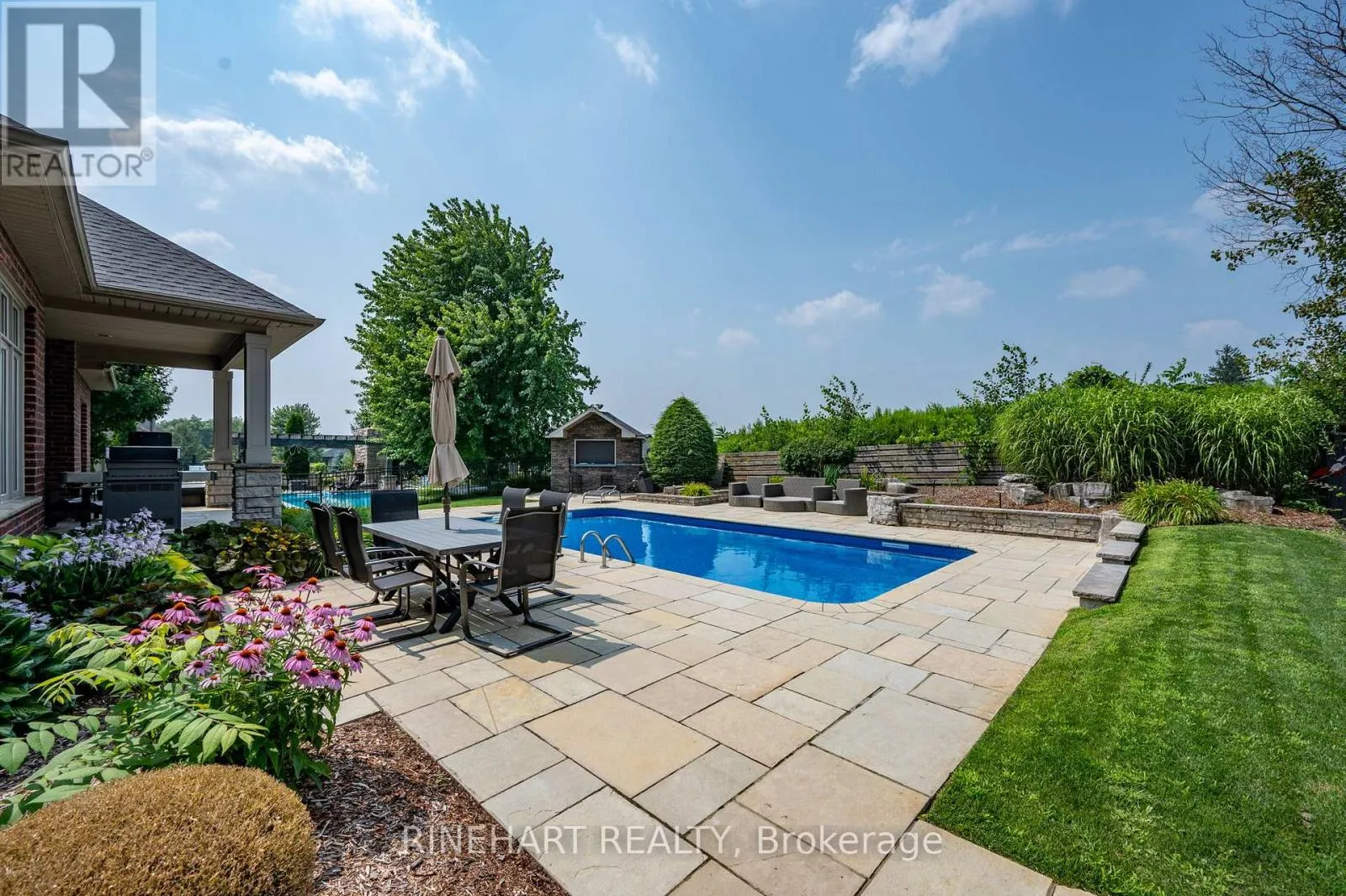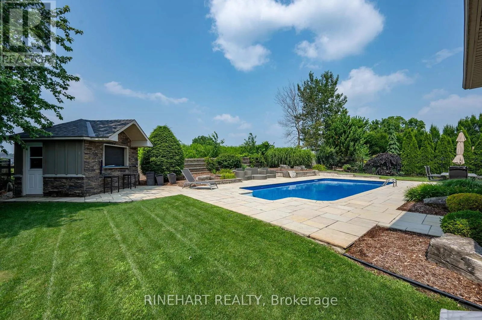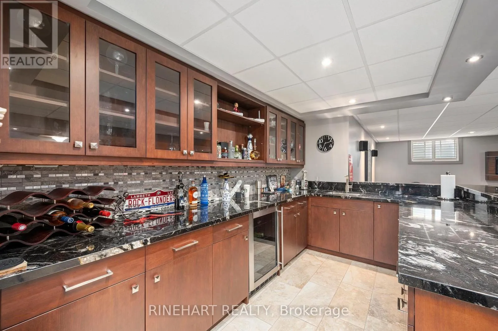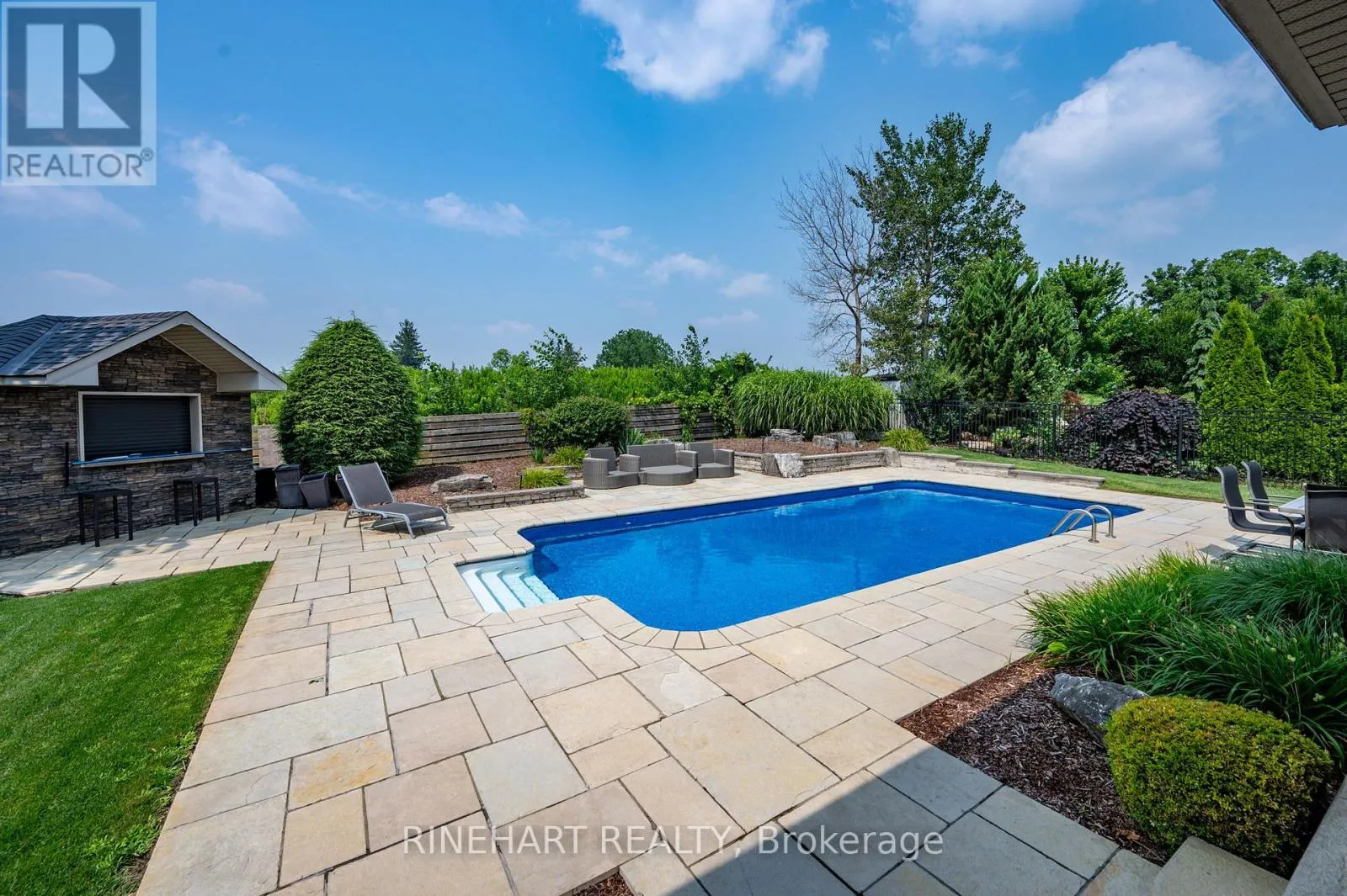 Cross Streets: Colonel Talbot Rd. ** Directions: Head North on Colonel Talbot Rd, Turn Left onto Clayton Walk, House is on the Right. Welcome to 6968 Clayton Walk, a beautifully maintained all-brick bungalow tucked away in one of South London's most desirable communities. From the moment you arrive, the curb appeal impresses with its manicured landscaping, wide driveway, and stately double garage. Step inside and you are greeted by a bright and welcoming foyer with warm natural light, setting the tone for a home that feels both refined and inviting.The front office and formal dining room offer the perfect balance of function and elegance, while the heart of the home lies just beyond. Here, an open-concept living room with an indoor fireplace flows seamlessly into a stunning kitchen and breakfast area. Rich dark wood cabinetry, tiled floors, a central island, walk-in pantry, and generous storage make this space as practical as it is stylish.The main floor is thoughtfully laid out with a spacious laundry room, a 2-piece guest bath, and three large bedrooms. The primary suite is a true retreat, complete with a luxurious five-piece ensuite, walk-in wardrobe closet, and direct walkout to your private backyard oasis. The two additional bedrooms share a beautifully designed five-piece bathroom with dual access.Downstairs, the massive finished basement offers incredible versatility. A spacious rec room, wet bar, fitness area, and a fourth bedroom with its own three-piece bath provide the ideal layout for entertaining, relaxing, or accommodating guests in comfort.Step outside and enjoy a backyard built for summer living, featuring a low-maintenance yard, an in-ground swimming pool, a charming pool house, and an indoor-outdoor fireplace that creates a perfect atmosphere day or night. Surrounded by bike paths, top-rated schools, and just minutes to Lambeth, parks, and restaurants, this home truly has it all. And with professional property maintenance already covered for the rest of 2025, your time here is yours to enjoy. Don't miss out and book your showing today! (id:27476)