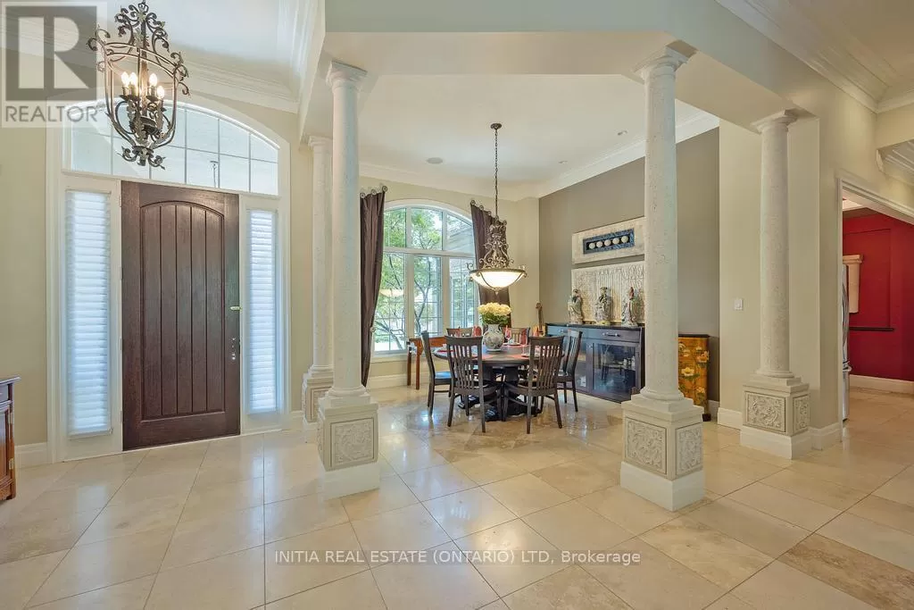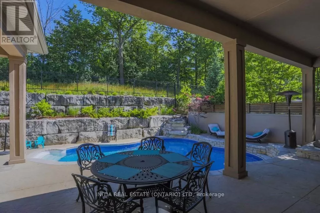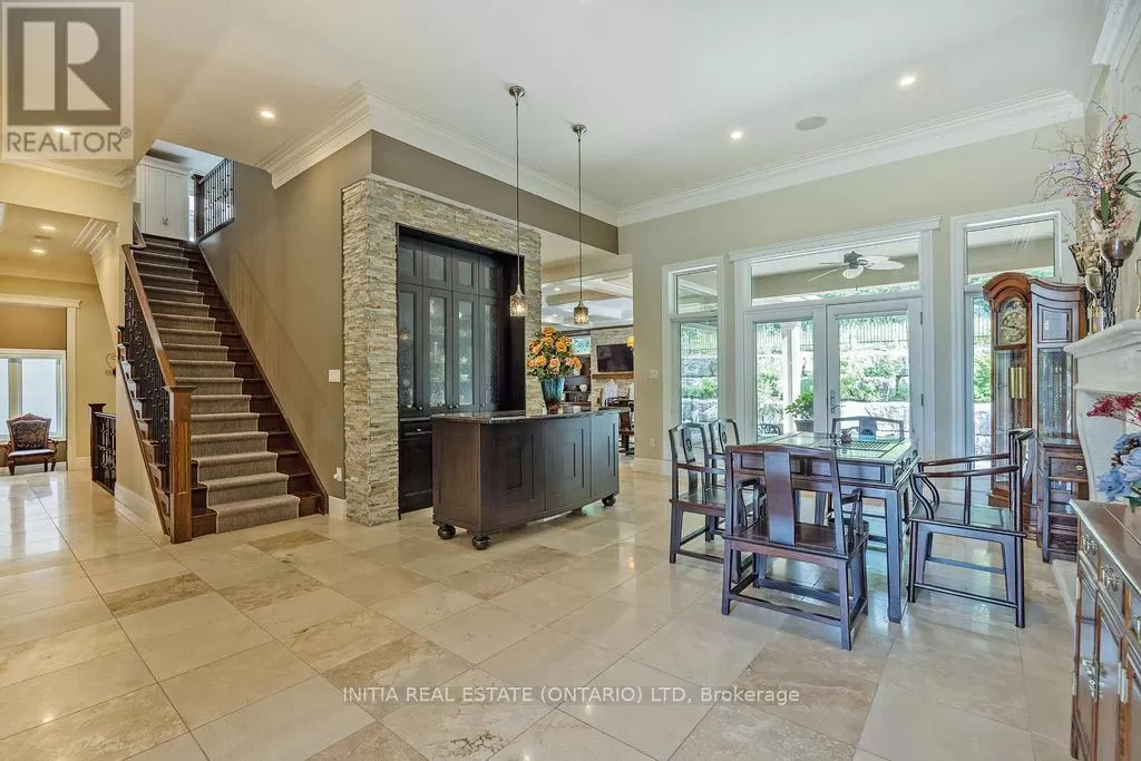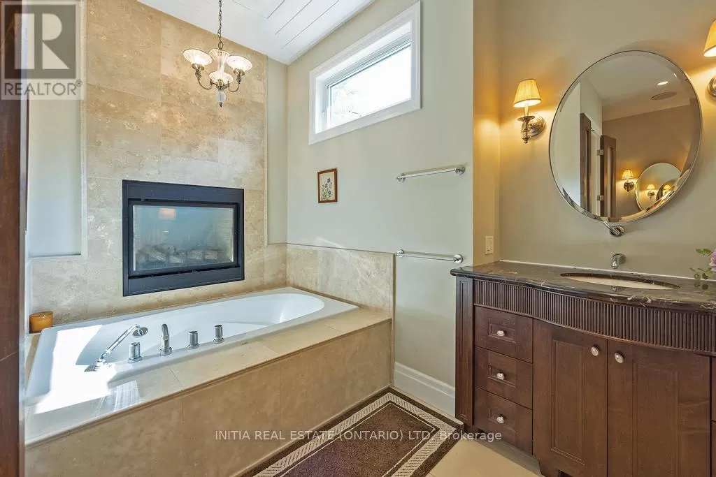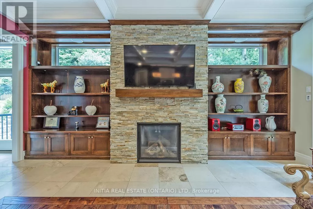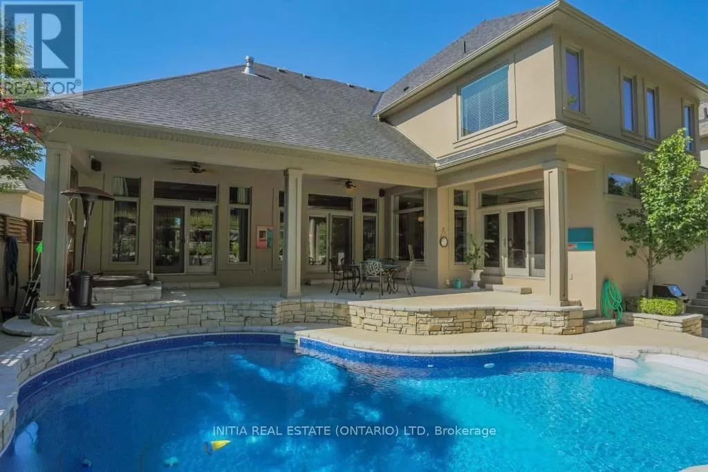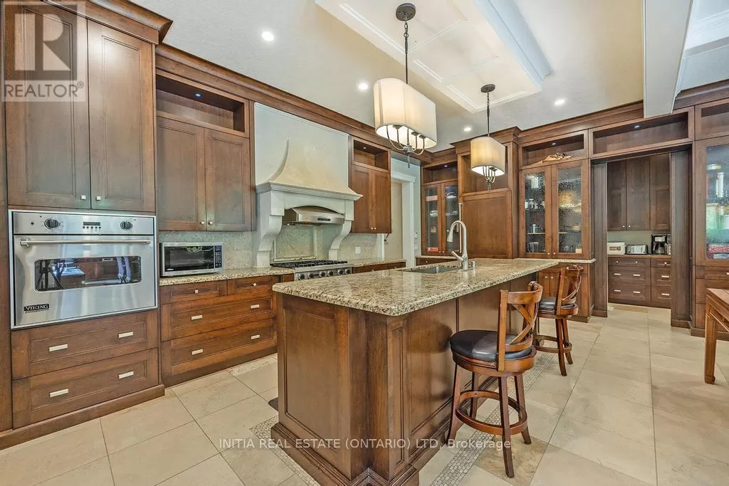 Cross Streets: Oxford & Commissioners. ** Directions: Oxford St to Kains Rd to Shore RdOxford St to Kains Rd to Shore Rd. Stunning luxury executive on Shore Road w/high-end finishes provides 3995sqf (above grade)open concept design of 2 family rooms on main & upstairs, 5 bedrooms,5 baths ,12' ceiling foyer , Martini Bar with one Lime Stone Fireplace(totally 4 fireplaces) ,great room offers hardwood flooring ,coffered ceiling & Herringbone inlay, direct access to covered hot tub from master ensuite on main floor with 2 programmable shower heads, private dressing room walk-in closet, walk-in shower, & separate toilet room; heated-floor kitchen with Butlers Pantry, maple cabinetry, stone range hood echoes Viking gas stove, wall oven, the granite countertops and sub zero fridge. Backing onto trees, the sod-free back yard has covered stamped concrete patio, heated saltwater in-ground pool, hot tub & lounge area & outdoor fireplace! (id:27476)