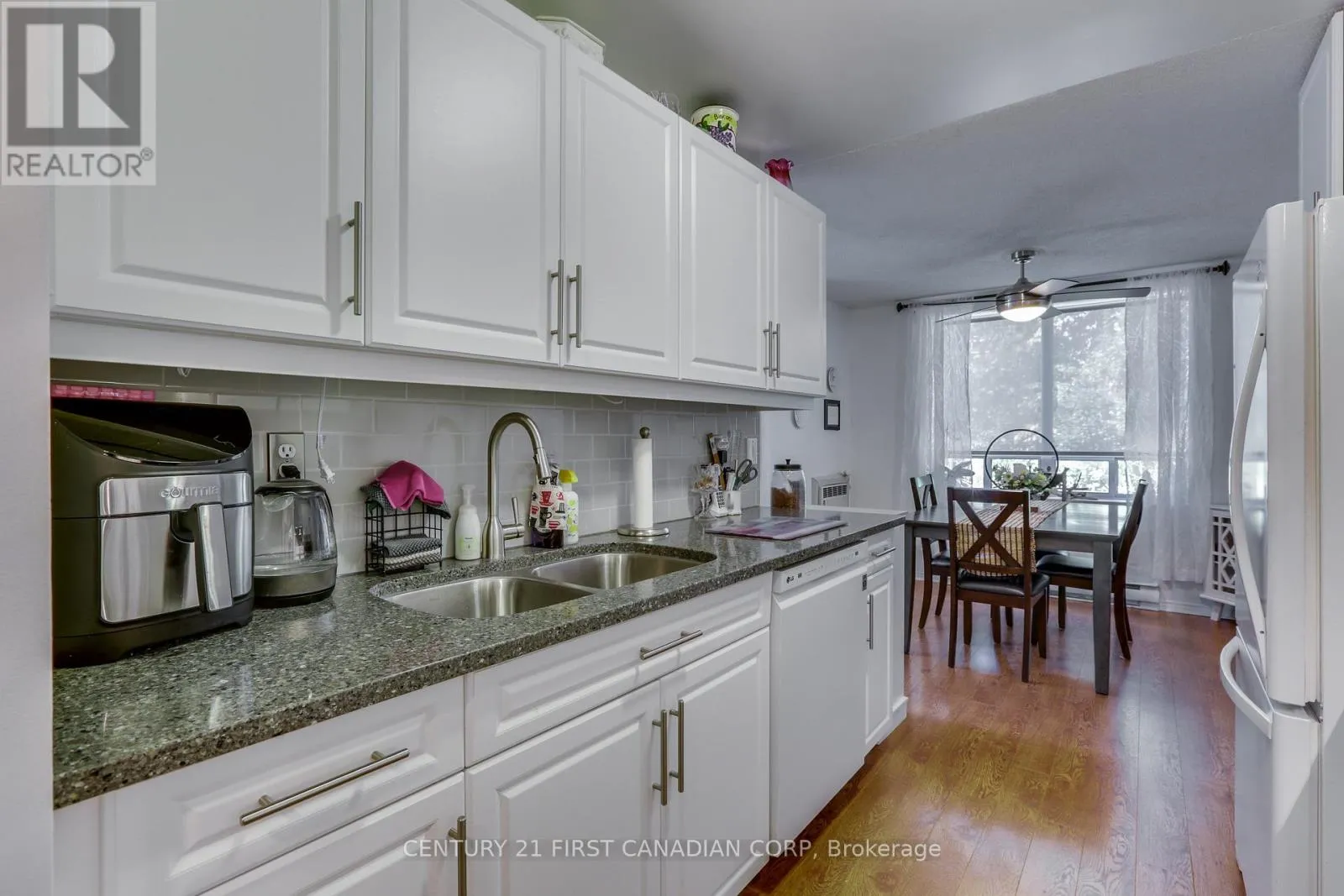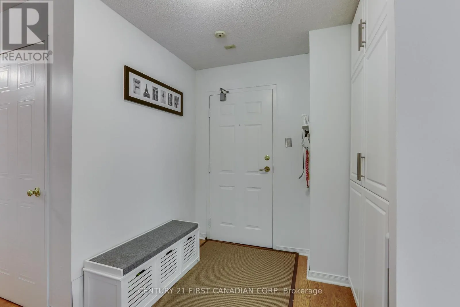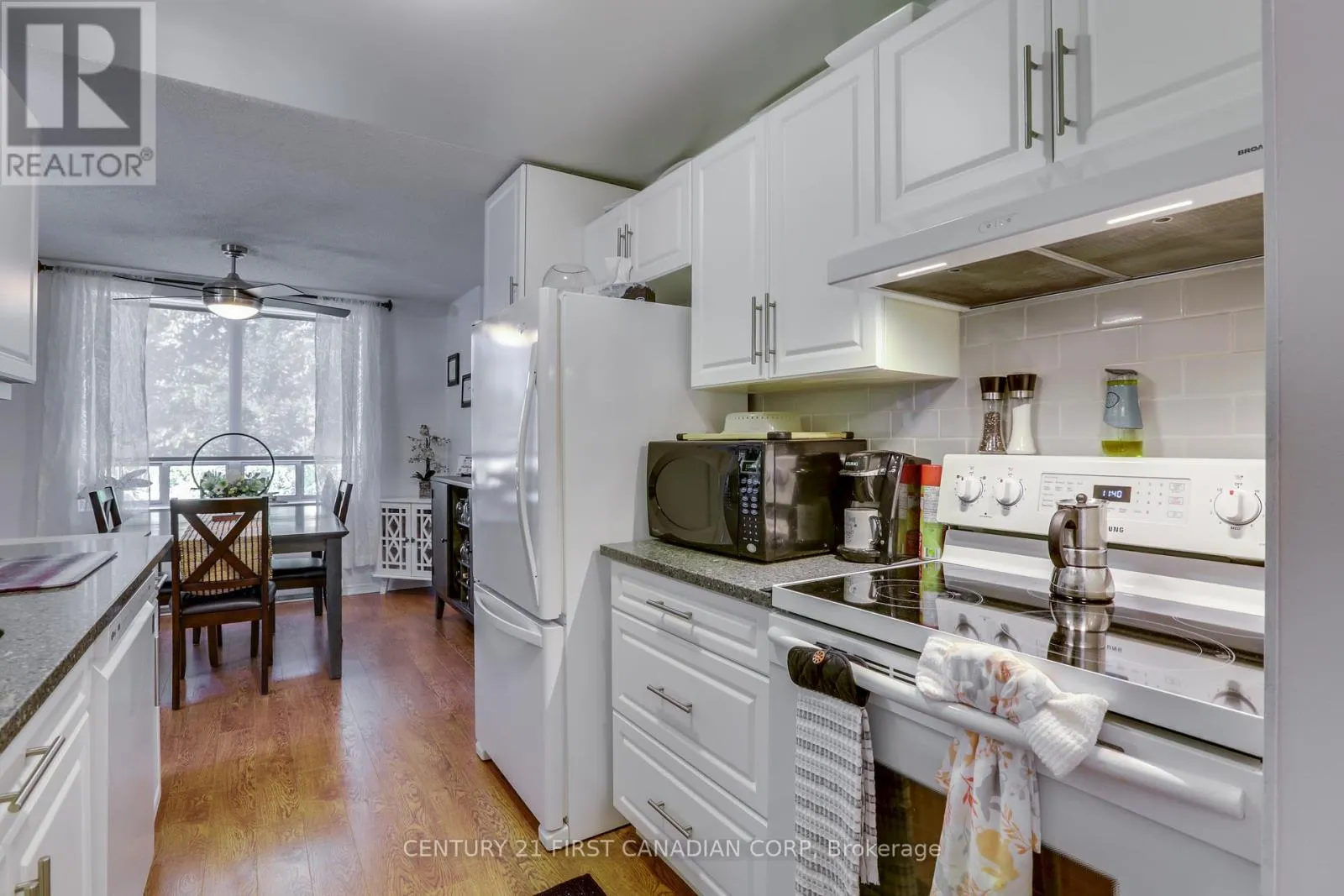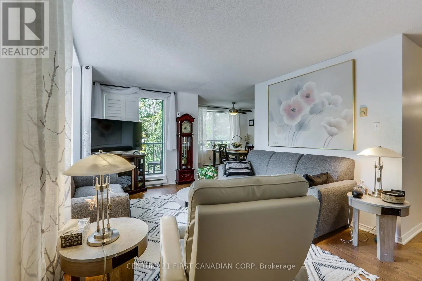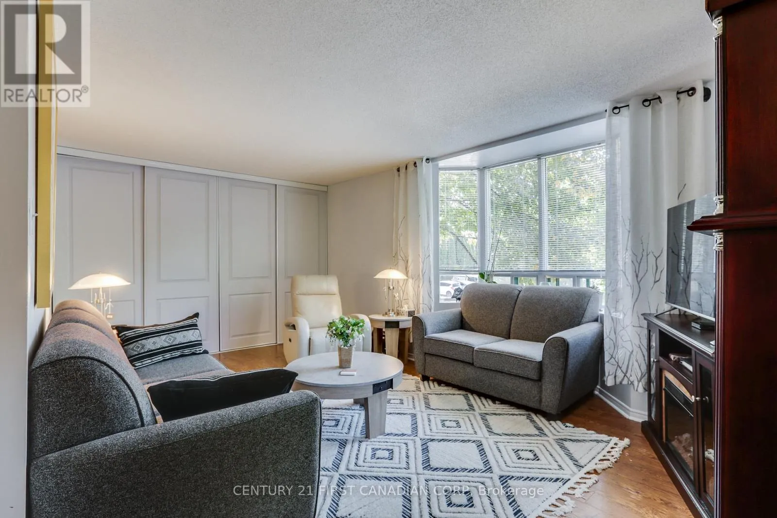 Cross Streets: Wharncliffe Rd. N and Baseline Rd.W. ** Directions: Wharncliffe Rd. N turn right onto Baseline Rd. W. Turn-key 2-bedroom, 2-bathroom, corner unit condo in London South! Welcome to this beautifully maintained second-floor condo corner unit at 201-76 Base Line Rd. W. Bright and inviting with a large bay window and loads of natural light, this carpet-free home offers plenty of upgrades throughout. The kitchen features refaced cabinetry, quartz countertops, a stylish backsplash, soft-close cupboards, and a custom pantry. Both bathrooms were updated in 23' with modern vanities, while the unit also boasts new laminate flooring 20'. Custom built-in storage with sleek sliding doors is found in the foyer and along the full width of the living room, adding both function and style. California shutters added in 23' in the bedrooms and patio door further enhance the space. Step out to a generous private balcony to enjoy the outdoors! The spacious primary suite offers a walk-in closet and ensuite, while convenient in-suite laundry is located in the main hallway. Building amenities include an exercise room, sauna, controlled entry, and plenty of parking. Fantastic location close to shopping, restaurants, parks, public transit, and so much more! Book your showing today! (id:27476)