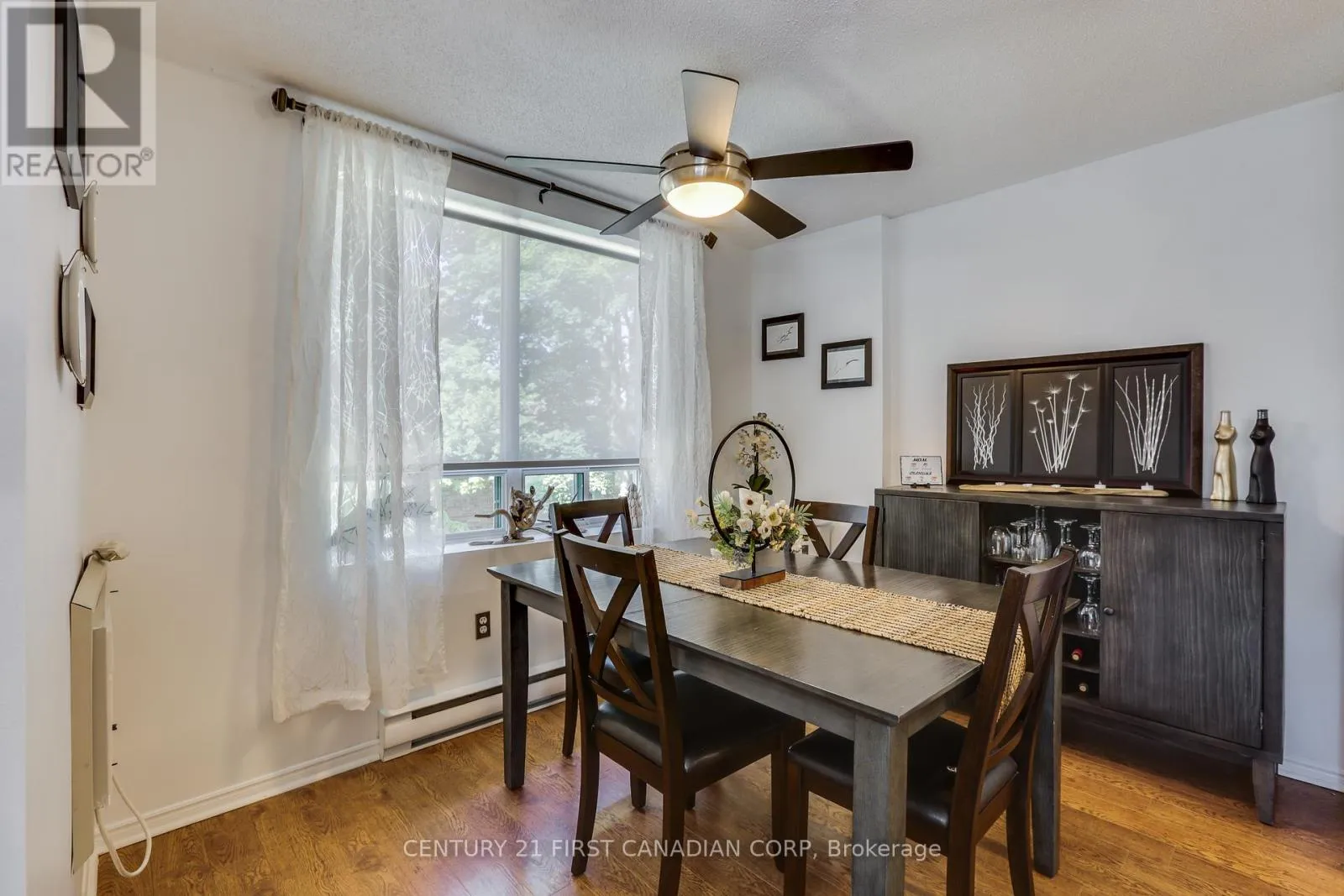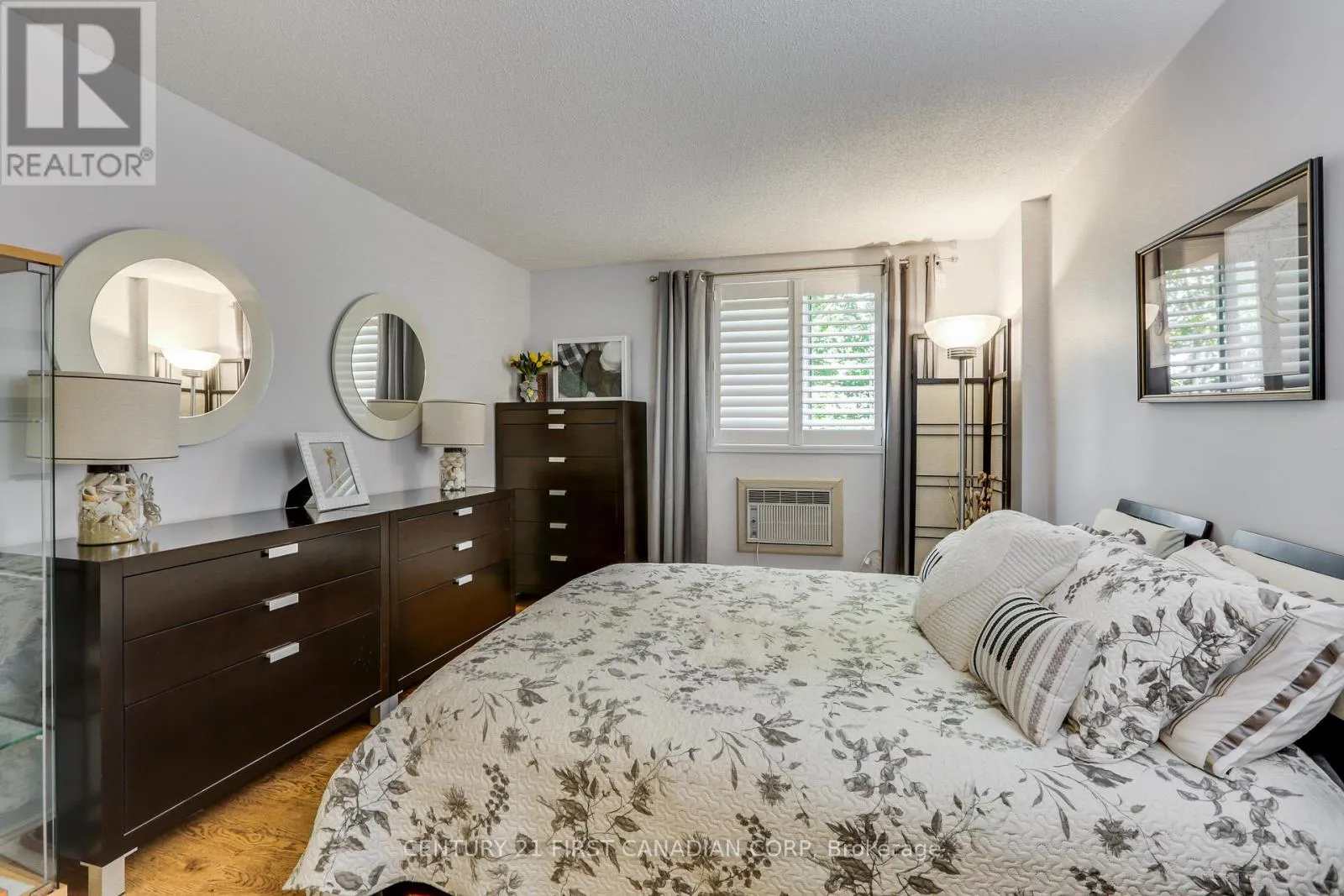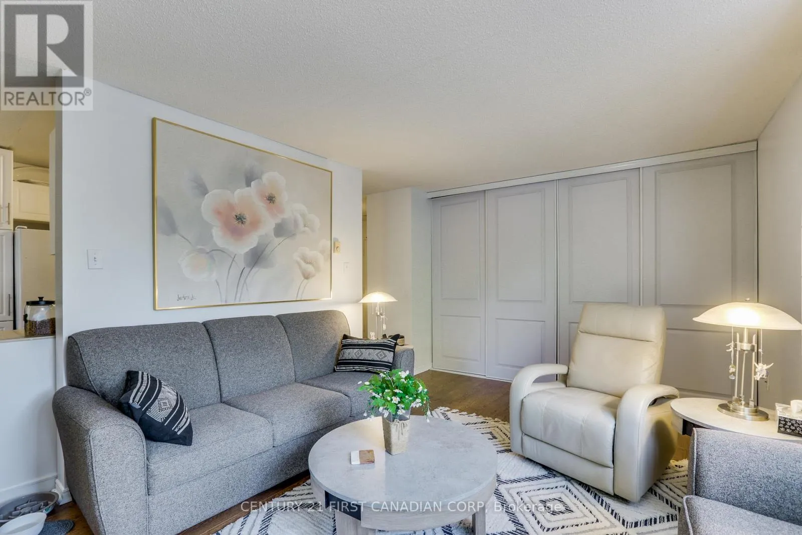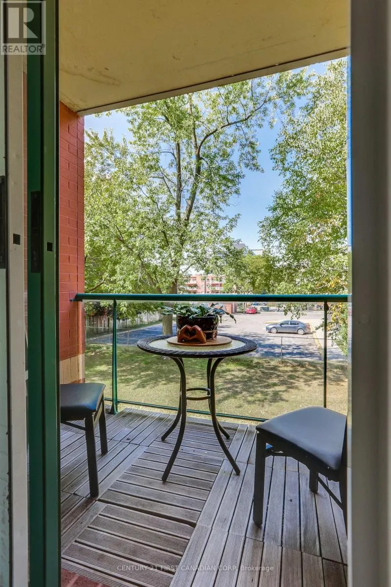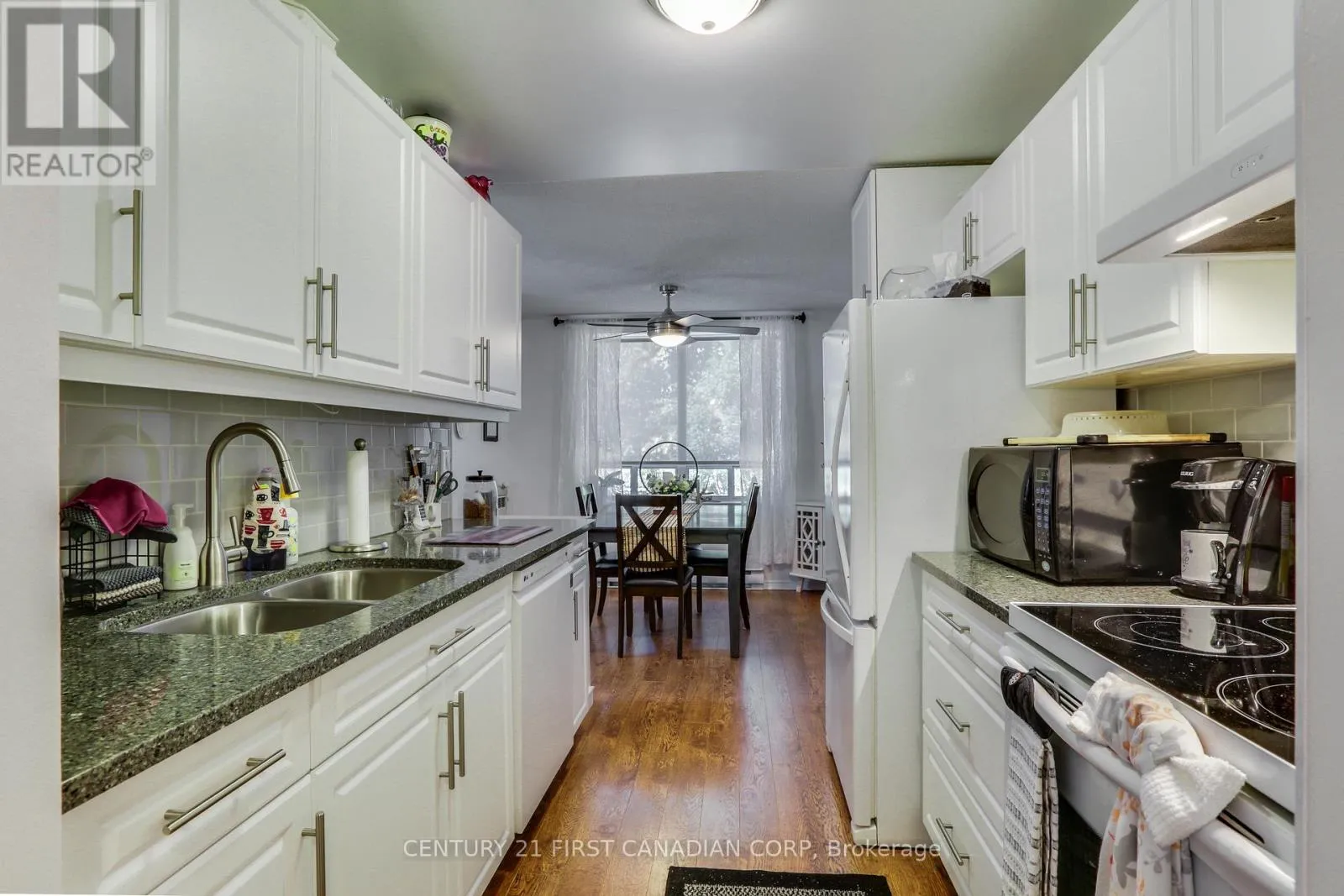 Cross Streets: Wharncliffe Rd. N and Baseline Rd.W. ** Directions: Wharncliffe Rd. N turn right onto Baseline Rd. W. Turn-key 2-bedroom, 2-bathroom, corner unit condo in London South! Welcome to this beautifully maintained second-floor condo corner unit at 201-76 Base Line Rd. W. Bright and inviting with a large bay window and loads of natural light, this carpet-free home offers plenty of upgrades throughout. The kitchen features refaced cabinetry, quartz countertops, a stylish backsplash, soft-close cupboards, and a custom pantry. Both bathrooms were updated in 23' with modern vanities, while the unit also boasts new laminate flooring 20'. Custom built-in storage with sleek sliding doors is found in the foyer and along the full width of the living room, adding both function and style. California shutters added in 23' in the bedrooms and patio door further enhance the space. Step out to a generous private balcony to enjoy the outdoors! The spacious primary suite offers a walk-in closet and ensuite, while convenient in-suite laundry is located in the main hallway. Building amenities include an exercise room, sauna, controlled entry, and plenty of parking. Fantastic location close to shopping, restaurants, parks, public transit, and so much more! Book your showing today! (id:27476)