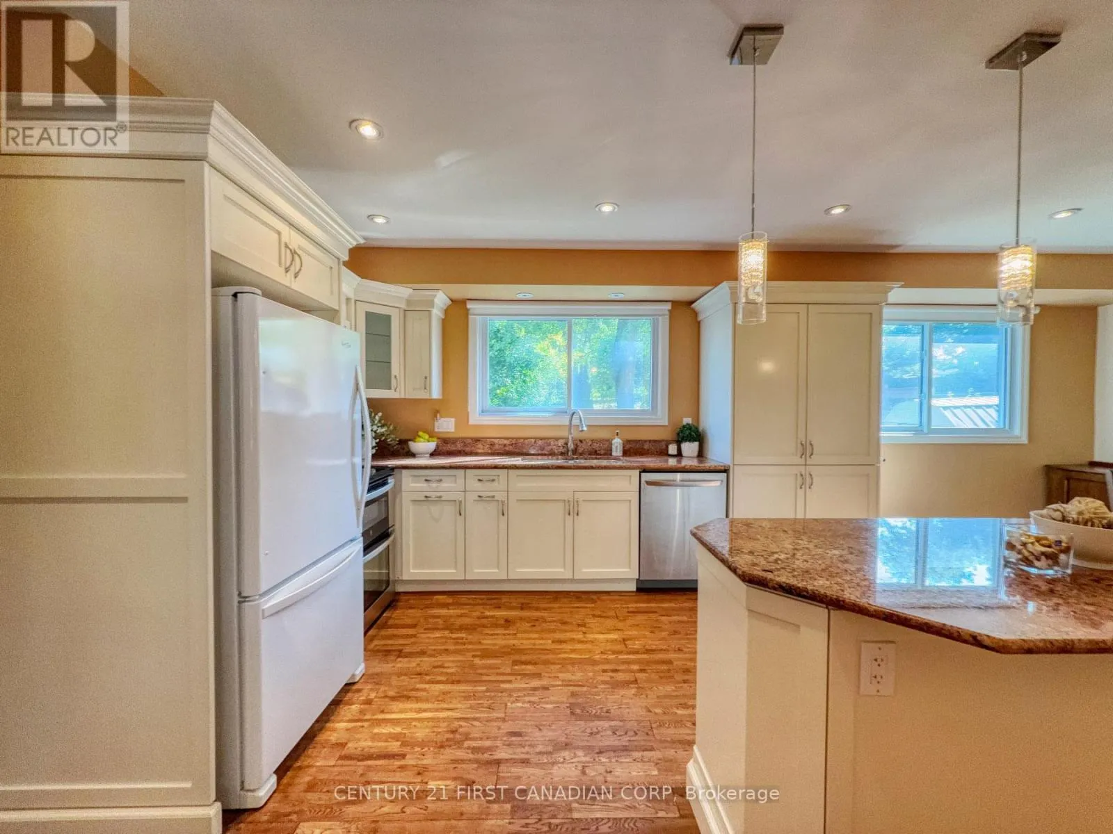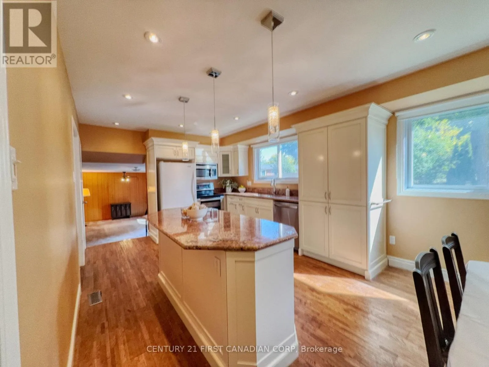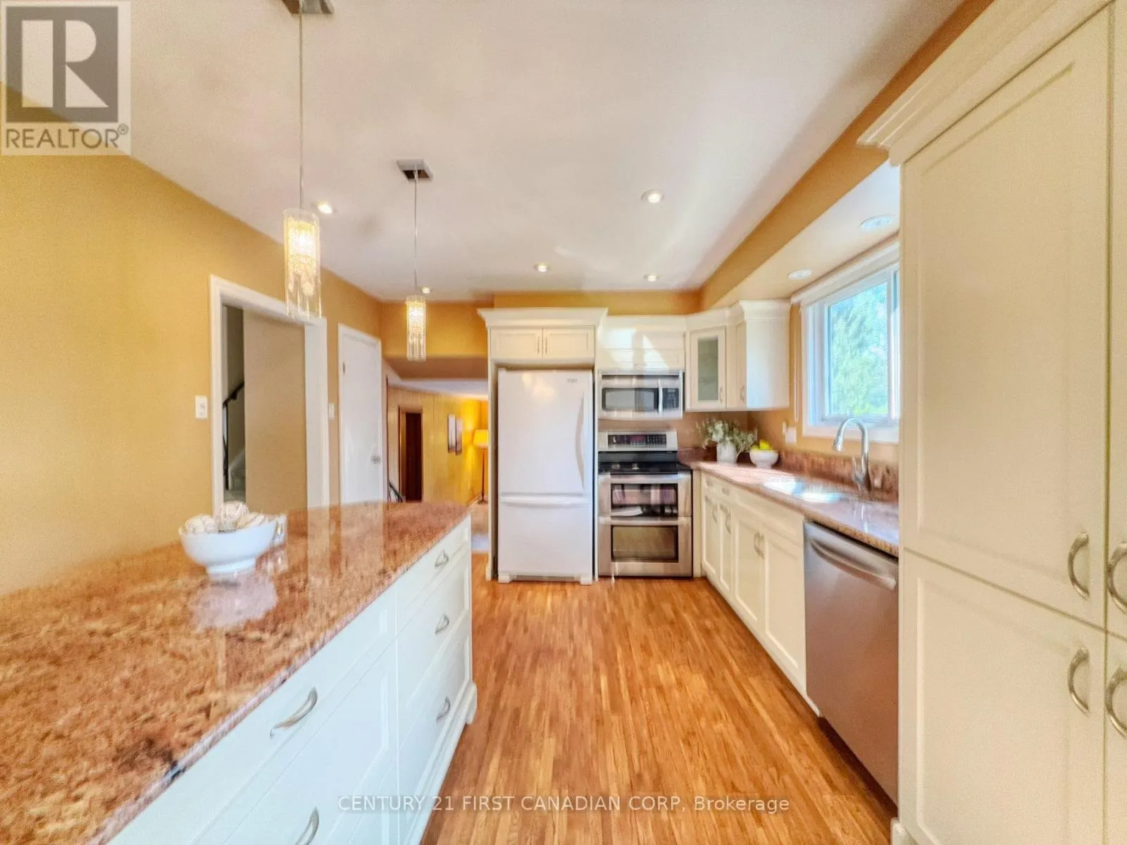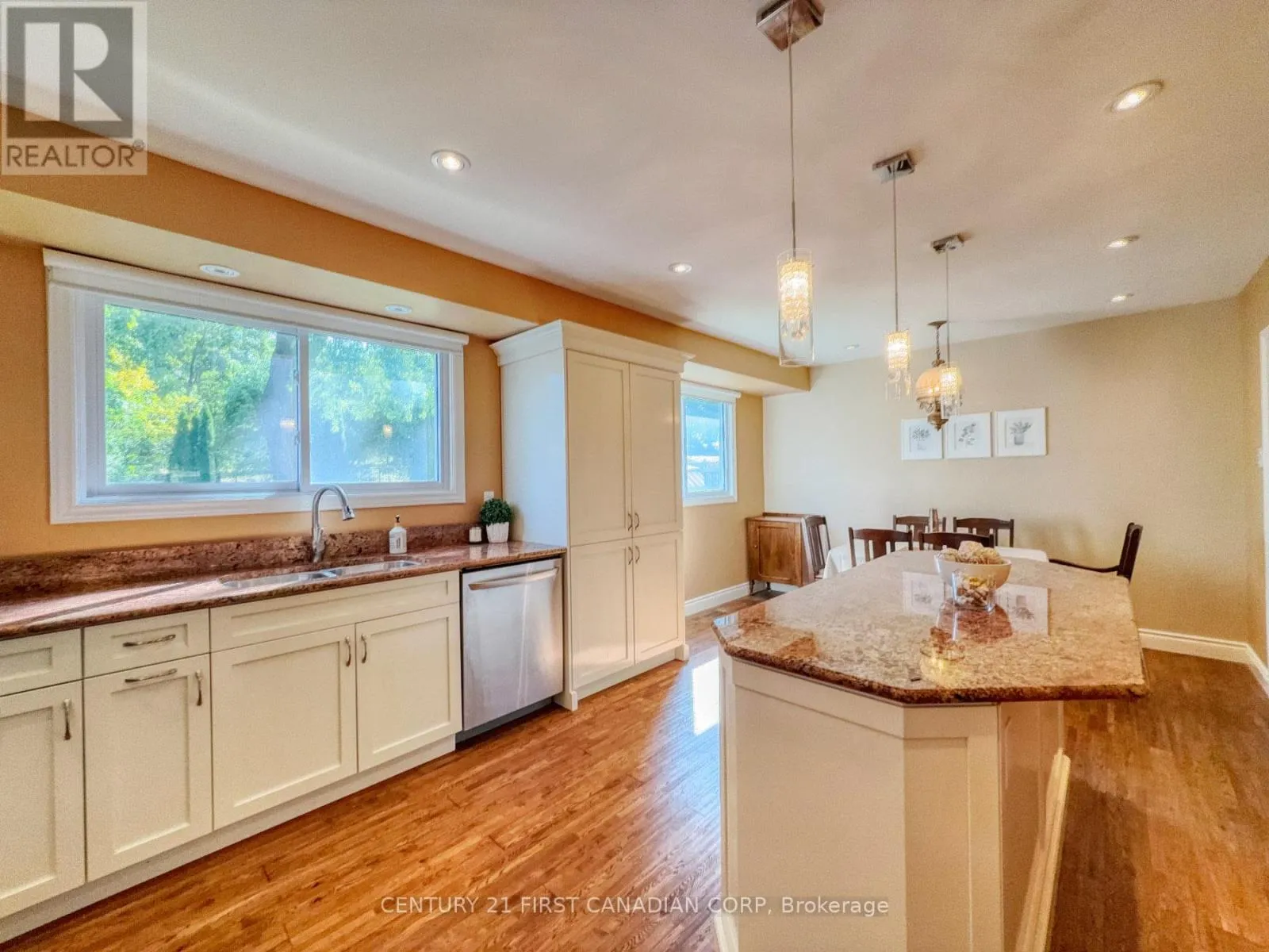 Cross Streets: Commissioner Rd. W & Viscount Rd. ** Directions: From Commissioner Rd W. Turn South Onto Viscount Road. Welcome to 628 Viscount Road a spacious classic 4 level sidesplit with 2326sqft of total living area as per MPAC. Tucked away in the heart of Westmount, this well-maintained 4-bedroom, 3-bathroom side-split offers a rare chance to create a forever home in one of London's most sought-after neighborhoods. Inside, the homes layout is designed for flexibility. Enter into the spacious foyer and up a few steps to the roomy front living room, featuring a newer charming bay window (2019) and cozy wood-burning stove, flows into a generous eat-in kitchen and dining area perfect for gathering with family and friends. The spacious kitchen was thoughtfully replaced in 2005 with modern appliances (like a double oven), plenty of pull out cupboards, pot drawers, flooring, large island, lighting and granite countertops, offering both style and function. A cozy family room just features a patio door that opens directly to a large deck and fenced backyard backing onto open space, a seamless extension of living space that invites summer barbecues, outdoor play, and evenings under the stars. The ground floor also includes a bedroom and ensuite 3pc bath, ideal for family living, an in-law suite, or creating a private guest retreat. Upstairs, three additional bedrooms and a beautifully renovated bathroom (2010) provide plenty of space for everyone. The lower level offers a rec room, two-piece bath, laundry, and generous storage. This home has been carefully updated over the years: most windows replaced between 1990-2000, the shingles replaced in 2019, chimney repointed in 2019, and the furnace was replaced in 2022, offering peace of mind for years to come. Fall in love with the walkable trails, nearby park like Arthur Ford park, and close access to schools and shopping. With an easy commute to the 401, this location makes daily living simple and connected. Discover the potential of 628 Viscount Road, book your private showing today. (id:27476)