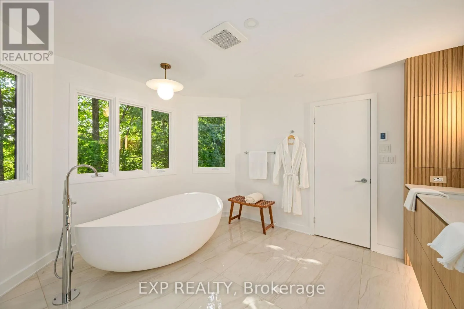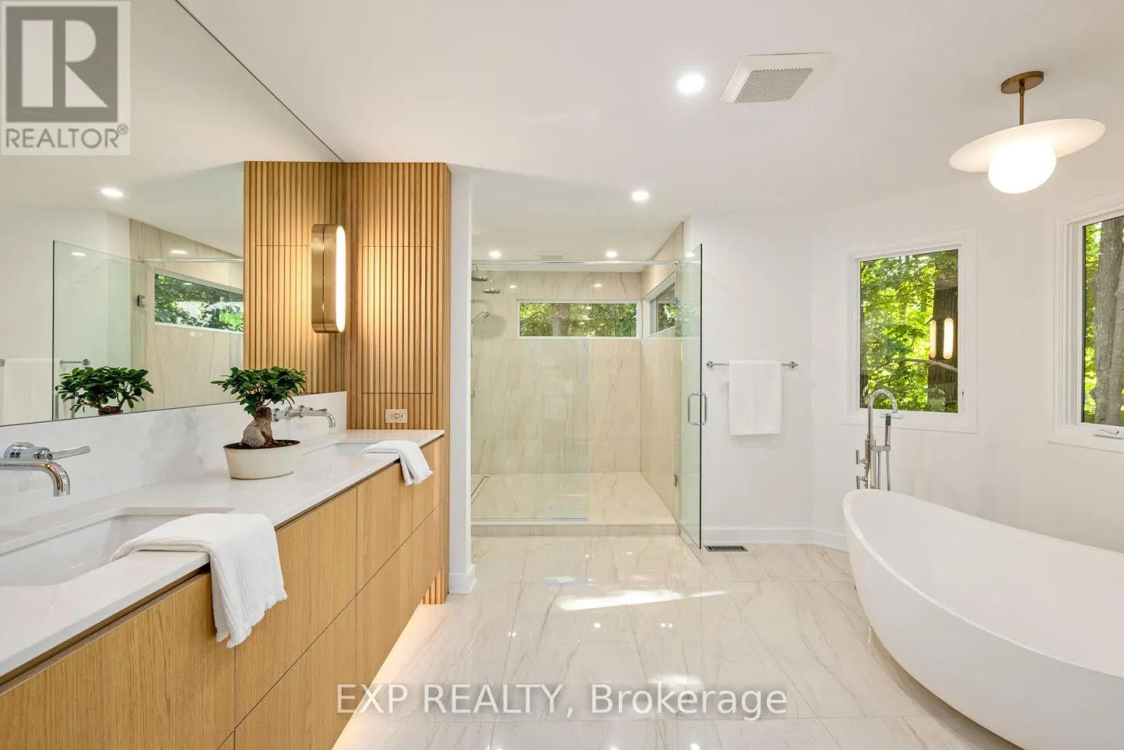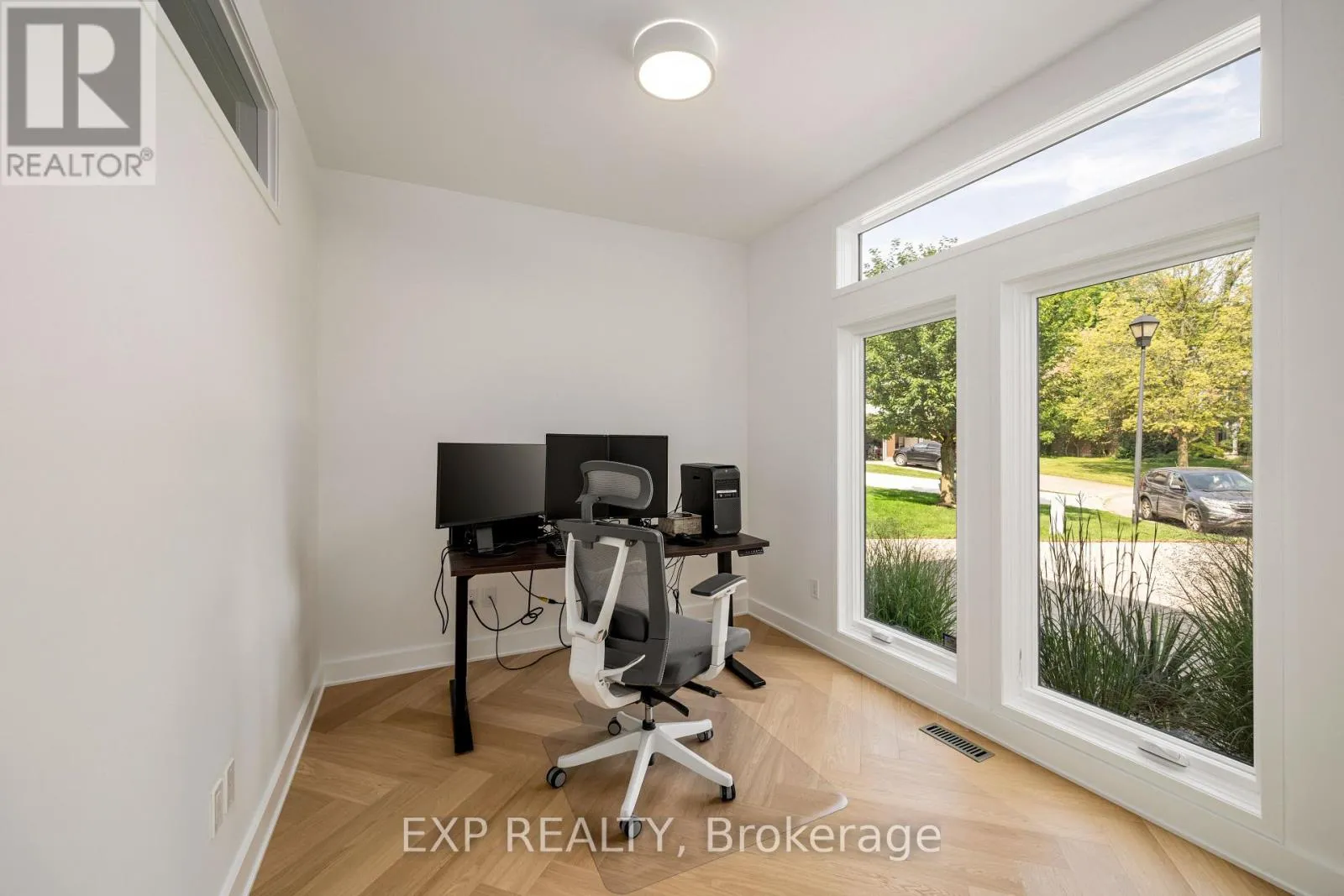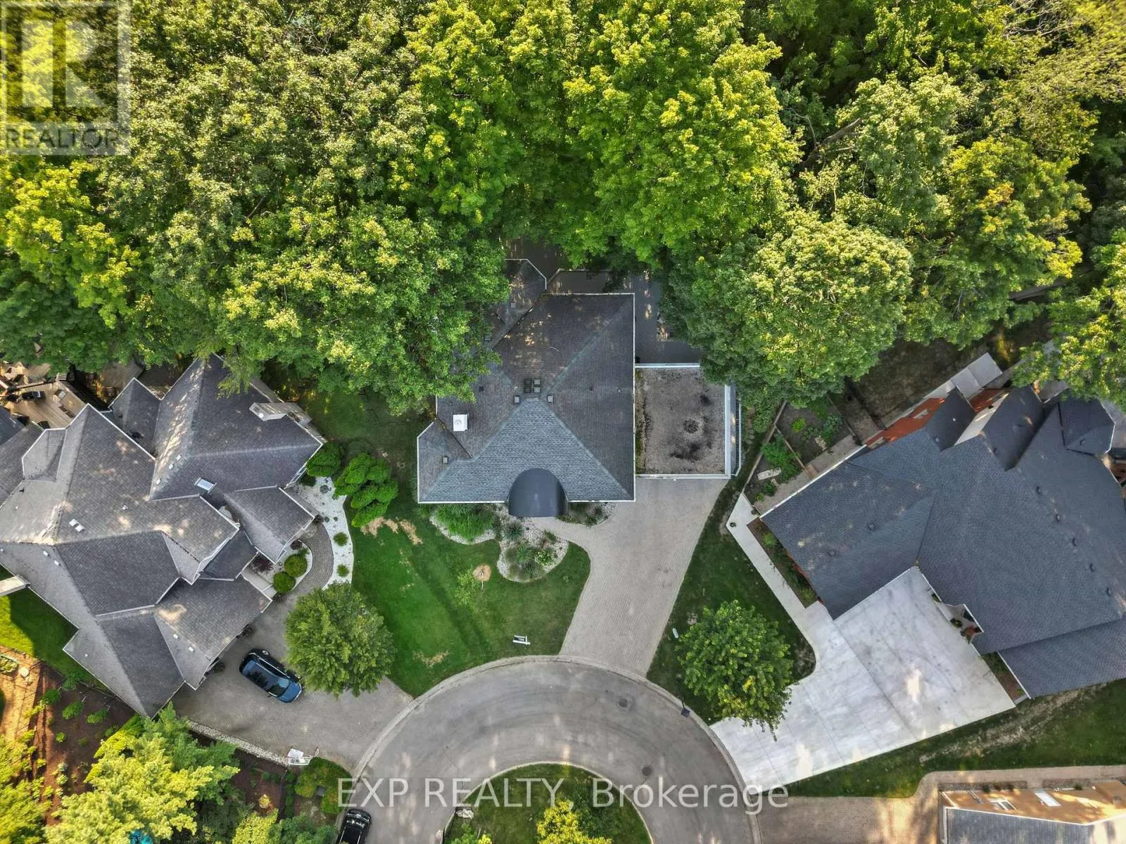Cross Streets: Barclay Road. ** Directions: Turn left onto Crankbrook Rd, Turn right onto Barclay Rd, Turn right onto Birchmount Walk, property will be on the right. California-modern showpiece at the end of a private cul-de-sac, rebuilt from the studs up and bathed in sunlight all day. Framed by mature trees in one of Southwest London's most established neighbourhoods, 52 Birchmount Walk blends sleek design with natural privacy. With windows on all four sides, this home flows effortlessly between indoor and outdoor living. The refinished stucco exterior, custom black metal-and-glass awning, and modern double doors open to a spacious two-storey foyer with soaring transom windows. The foyer features a sculptural spiral staircase, an Italian-designed pendant, and adjoins a bright office space ideal for working from home. The main floor, re-imagined for seamless flow, is anchored by herringbone white oak and framed by lush greenery for privacy. Wired for Ethernet and Power-over-Ethernet outdoor security system cameras, the home was re-insulated and upgraded with state-of-the-art HVAC, central vacuum, and on-demand hot water for optimal comfort and efficiency. The custom flat-panelled Martin Jesko kitchen includes Fisher & Paykel panelled fridge/freezer columns, Miele induction cooktop, built-in speed oven/microwave combo, wall oven, dishwasher, Italian porcelain counters, and a dual temperature wine fridge. A backsplash window opens to the oversized two-tier patio - perfect for entertaining. A walk-in pantry and mudroom with garage access complete the design. Upstairs, each bedroom has a private ensuite with Martin Jesko cabinetry. The primary retreat includes a custom walk-in closet with direct laundry access, a spa-like bath with radiant in-floor heat, Rubinet fixtures, freestanding Silk Stone tub, TOTO smart toilet, and oversized dual shower framed by treetop transom windows. The finished walkout basement adds a rec room, bedroom/office, and garage-access flex space. Ideal for professionals, families, and those who love to entertain. Minutes to Highways 401/402 and a short drive to London's major hospitals. (id:27476)