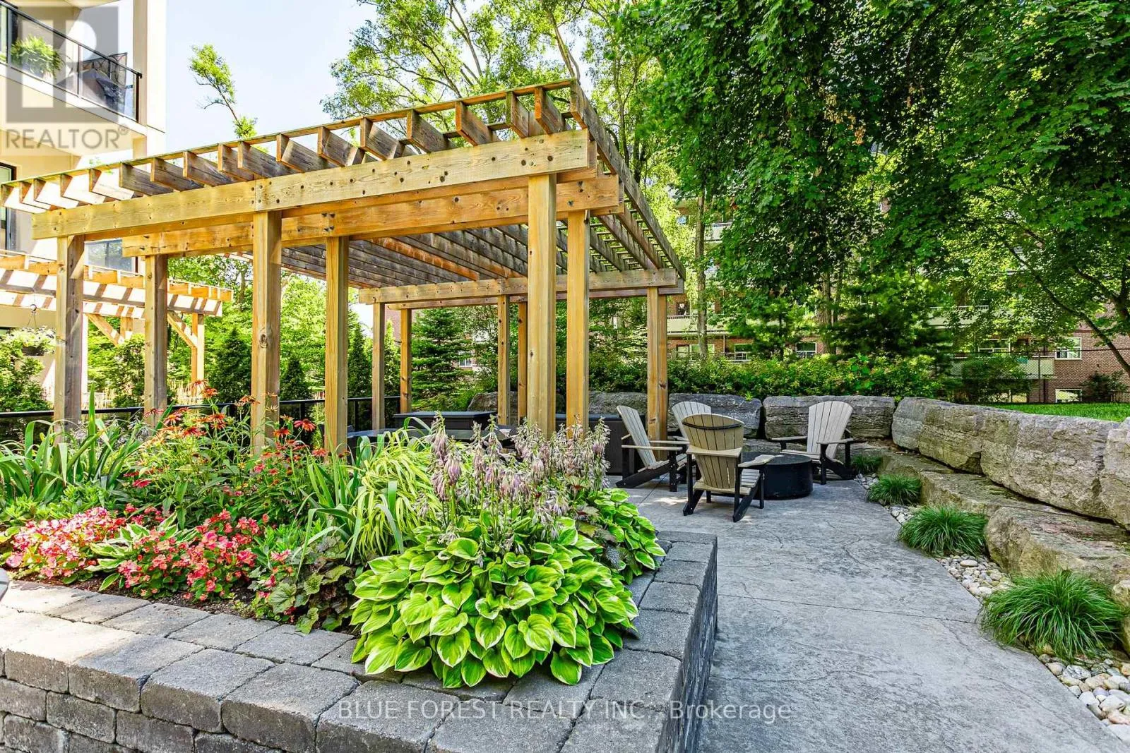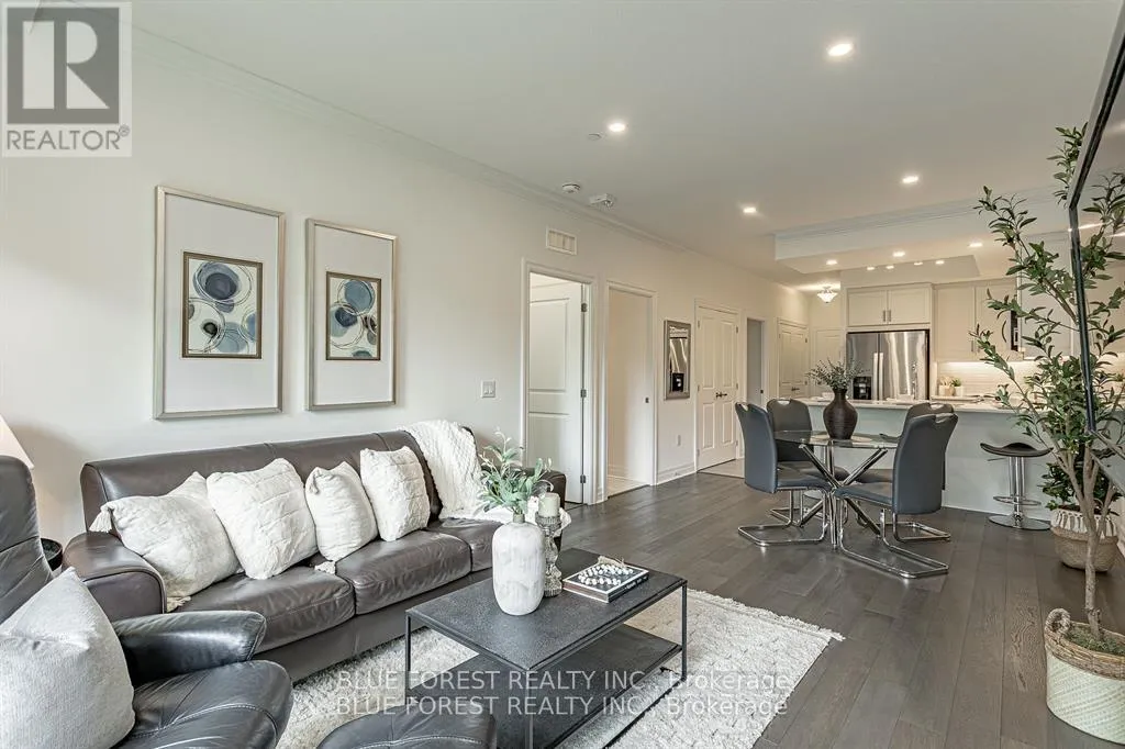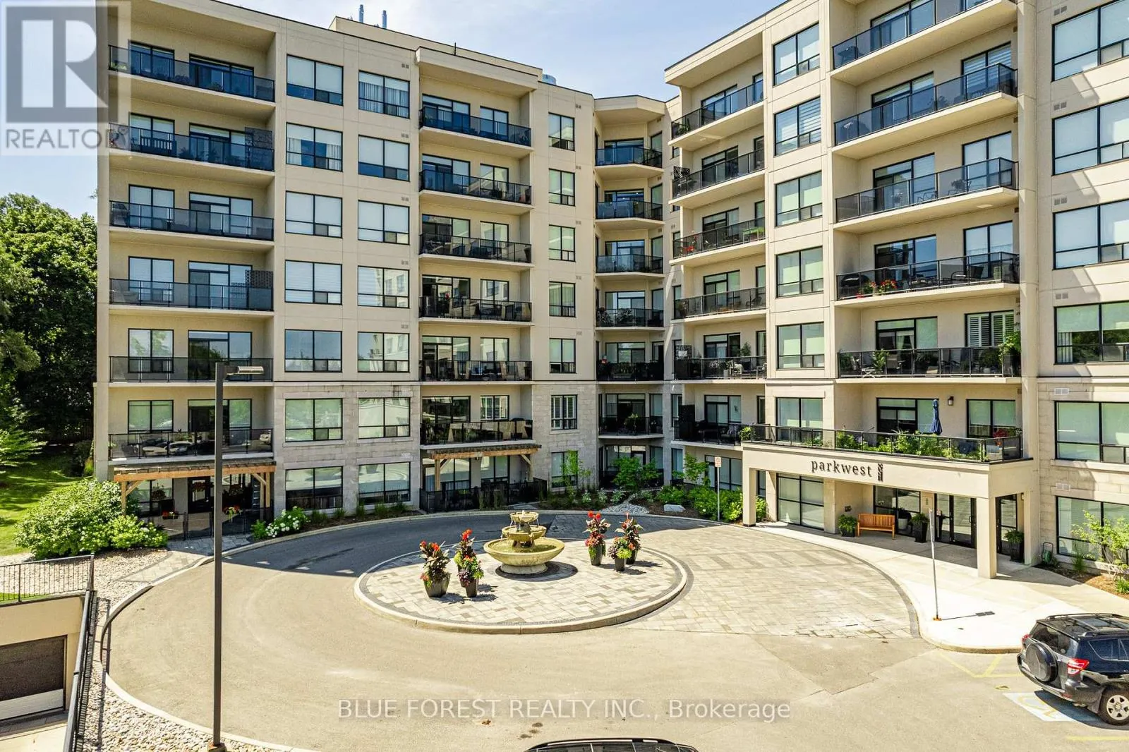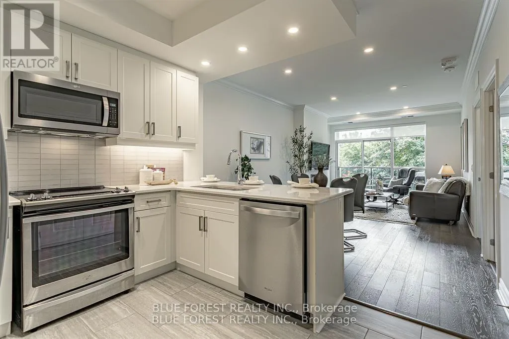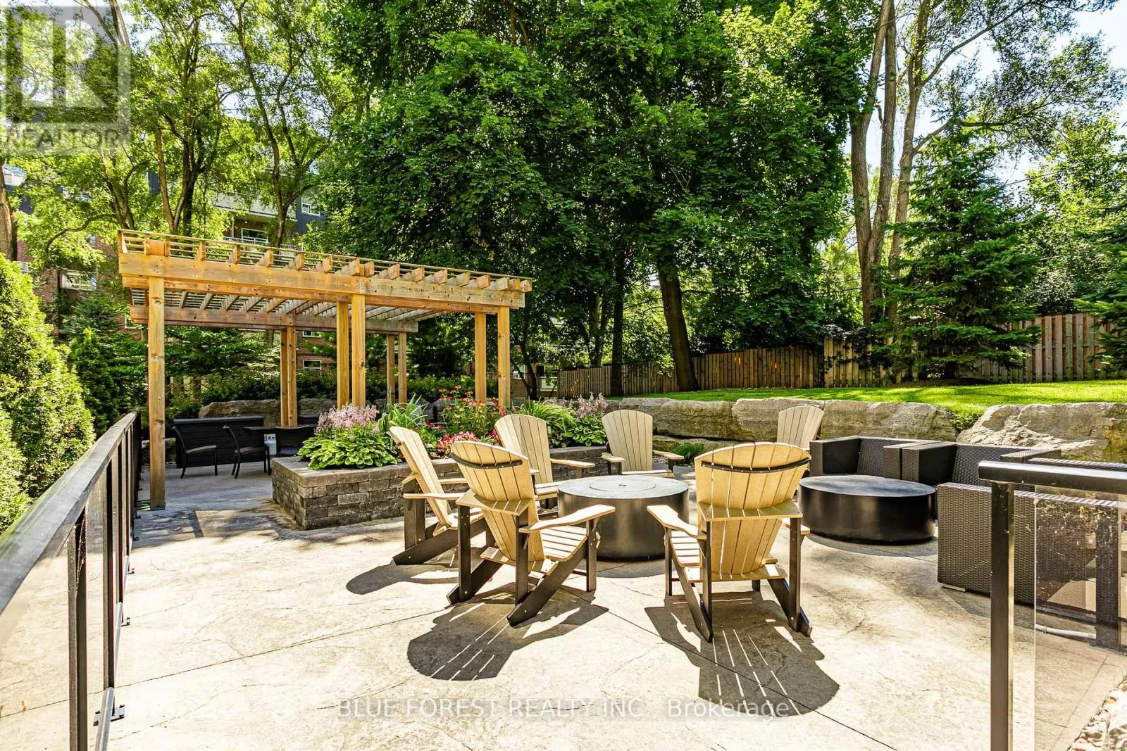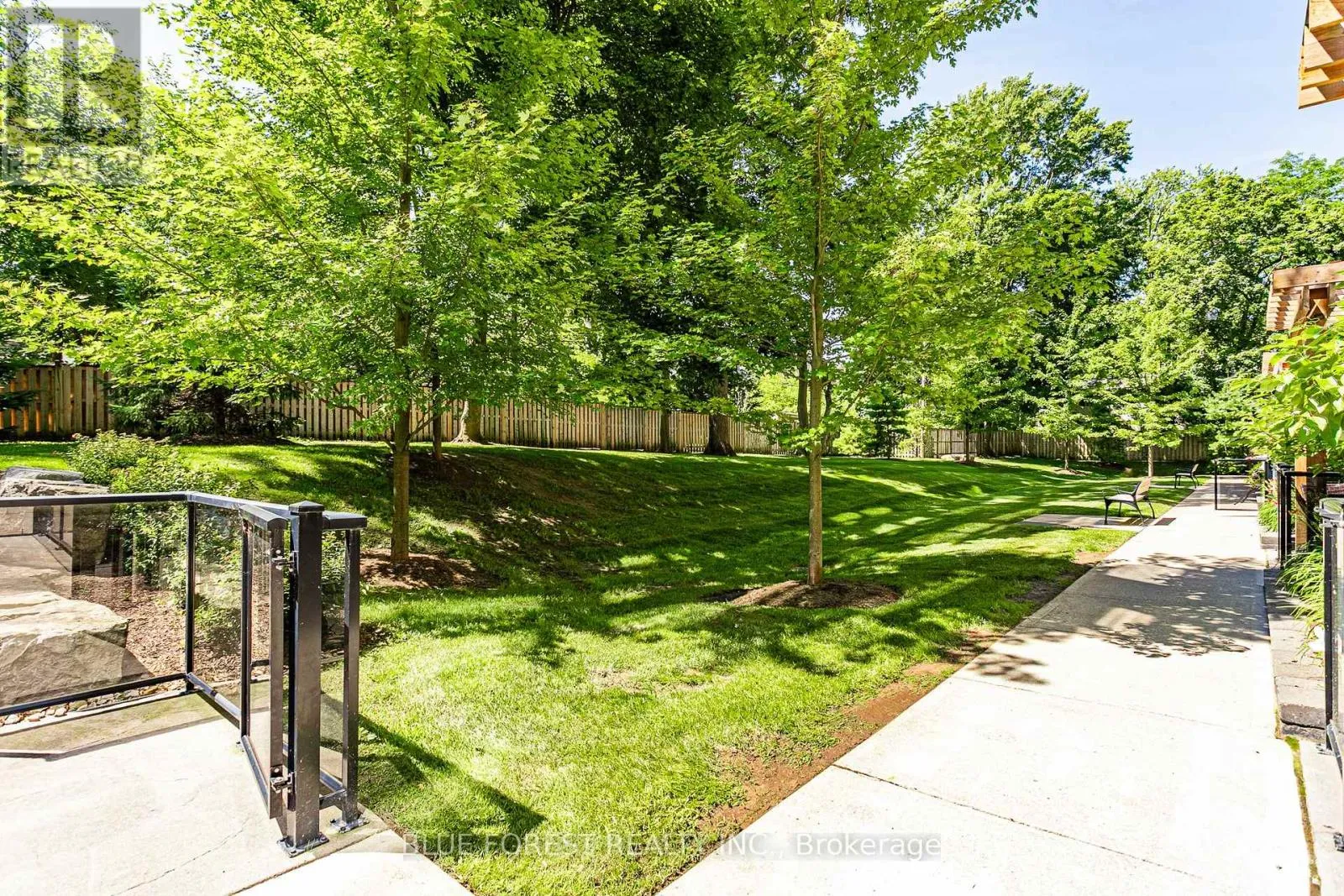 Cross Streets: Boler Road and Commissioners Rd, W. ** Directions: Commissioners Road West toward Byron. Stylish and modern 6-year-old condo perfectly situated across from the scenic Springbank Park in highly sought-after Byron. The bright, contemporary kitchen is thoughtfully designed for both style and function, featuring crisp white cabinetry, stainless steel appliances, quartz countertops, tile flooring, and a convenient breakfast bar that opens to the main living area. The open-concept layout flows effortlessly into the dining and living spaces, finished with warm laminate flooring and anchored by a sleek electric fireplace. The South facing unit enjoys sunshine throughout most of the day, creating a warm and inviting atmosphere year round. Step out onto your private balcony, surrounded by mature trees, an ideal spot to enjoy morning coffee or unwind in peace. The spacious primary bedroom boasts a professionally designed walk-in closet and large windows that flood the room with natural light. A versatile den provides the perfect flex space for a home office, guest room, or reading nook. The oversized 5-piece bathroom is both elegant and functional, offering double sinks, quartz countertops, large tub, and a glass-enclosed shower. Additional features include in-suite laundry, owned underground parking space, and a private storage locker. Residents enjoy exceptional amenities, including a stylish party room with pool table, kitchen and lounge area; a fully equipped fitness room, two outdoor patios, a guest suite, and even a private golf simulator room. Ample visitor parking. Enjoy direct access to the park with walking trails along the Thames River. Walking distance to shopping, restaurants, and bus stop. For those avid skiers, Boler Mountain is just minutes away. Condo fees include heating, air conditioning, water, building insurance, and outdoor maintenance making for effortless living in a truly exceptional location. (id:27476)