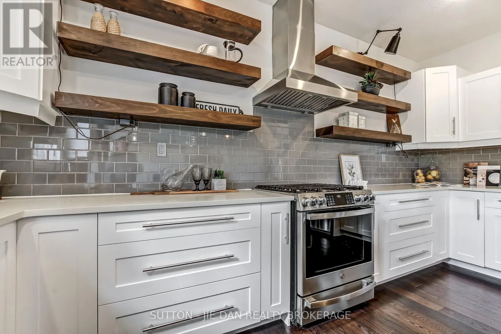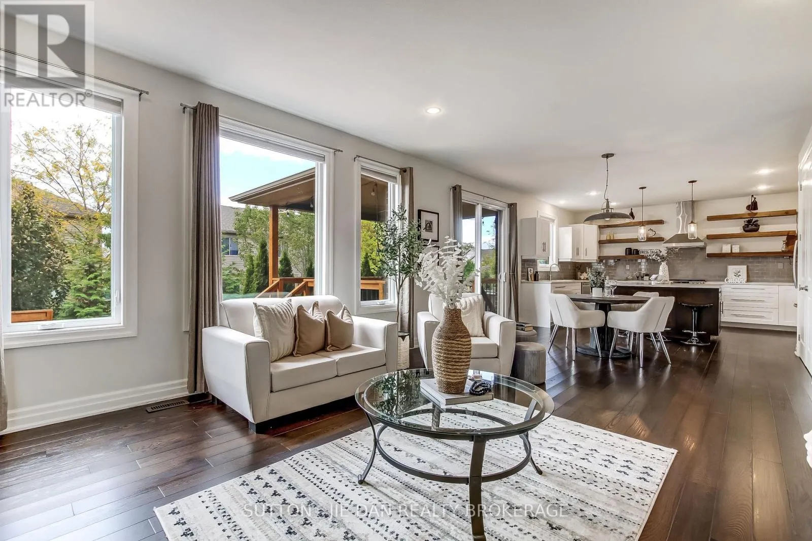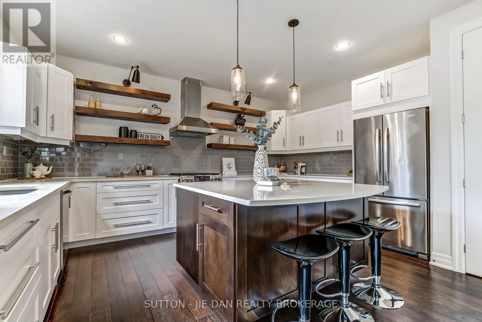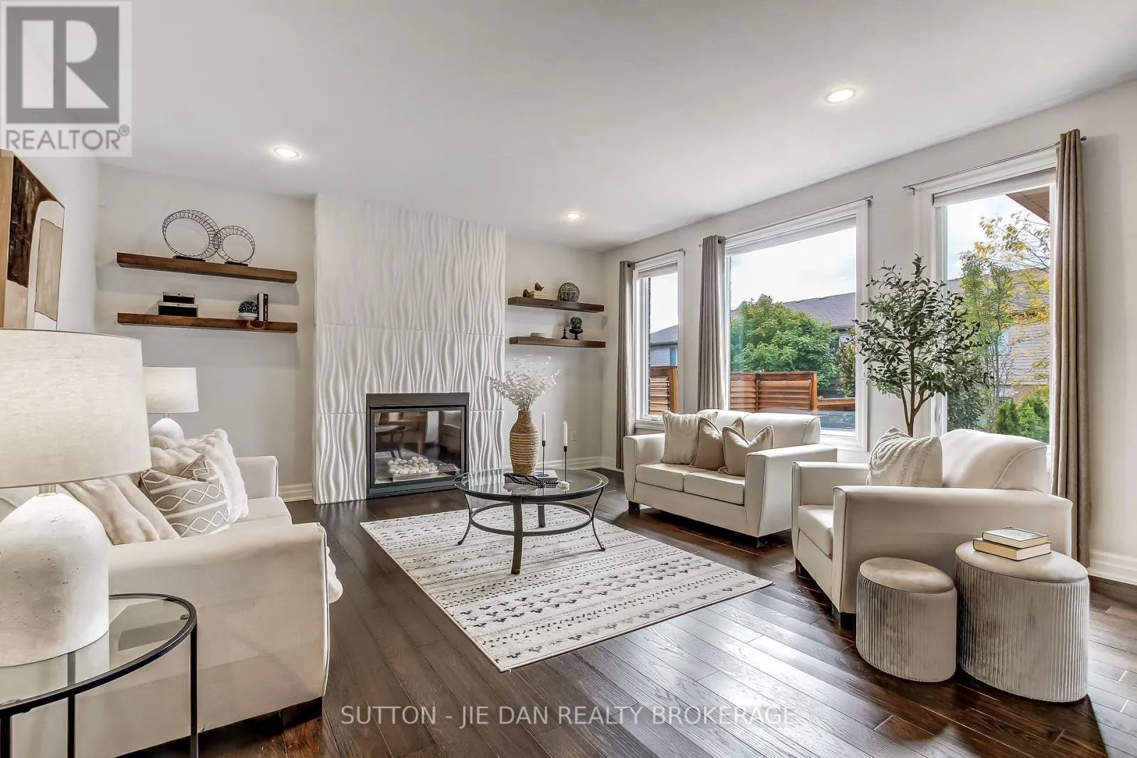 Cross Streets: Oxford Street West to Kains Road to Shore Road to Kains Woods Terrace. ** Directions: SHORE/KAINS. Your search ends here! Discover this exceptional family home in the highly sought-after Riverbend/Hunt Club West community. Ideally located near trails, parks, golf, skiing, shopping, and top restaurants. 2385 SqFt above grade & 899 SqFt finished basement. This 4+1 bedroom, 3.5-bathroom home blends functionality with designer finishes.Step into the welcoming two-story foyer that leads to an inviting main floor layout. The chefs kitchen is a dream for cooking and entertaining, featuring a newer gas stove, quartz counters, large island, drop hood vent, and floating shelves. The bright family room, complete with a gas fireplace and custom floating shelves, is perfect for gatherings, while the front room offers flexible use as a living room, dining area, or home office, enhanced by a stylish plaster accent wall.Outside, enjoy multi-tiered decks designed for privacy and aesthetic appeal, a covered porch with a cozy gazebo feel, a hot tub, and a fire pitall surrounded by lush trees. The primary suite boasts a large walk-in closet and a 5-piece ensuite with a soaker tub, walk-in glass shower, double sinks, and quartz counters. A charming loft-like bedroom over the garage adds character and versatility.The professionally finished basement is thoughtfully designed, featuring a spacious rec room with another gas fireplace, a large bedroom with walk-in closet, and a designer 3-piece bathroom. Practical upgrades include freshly re-laid paver stones in the driveway for years of worry-free maintenance. (id:27476)
