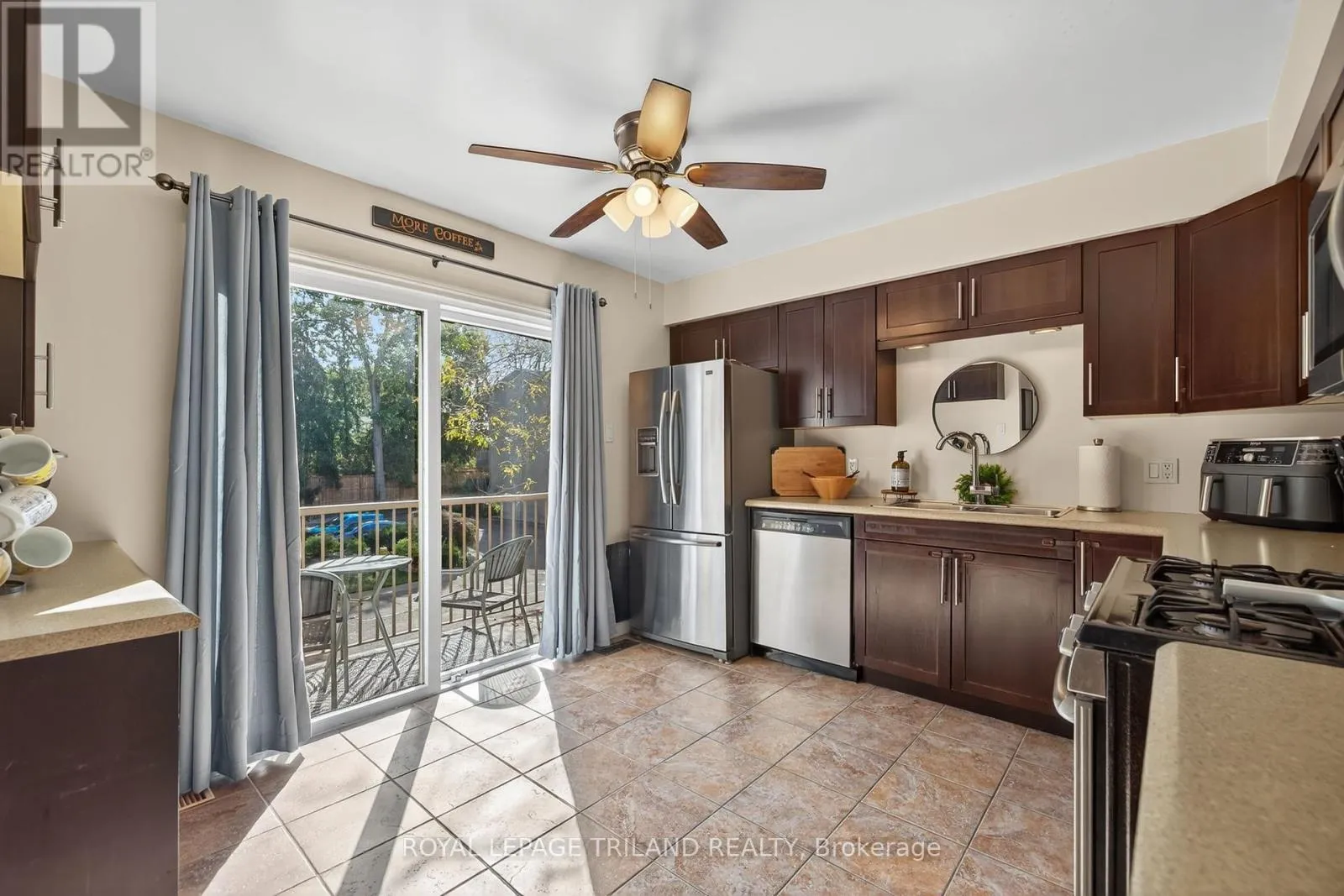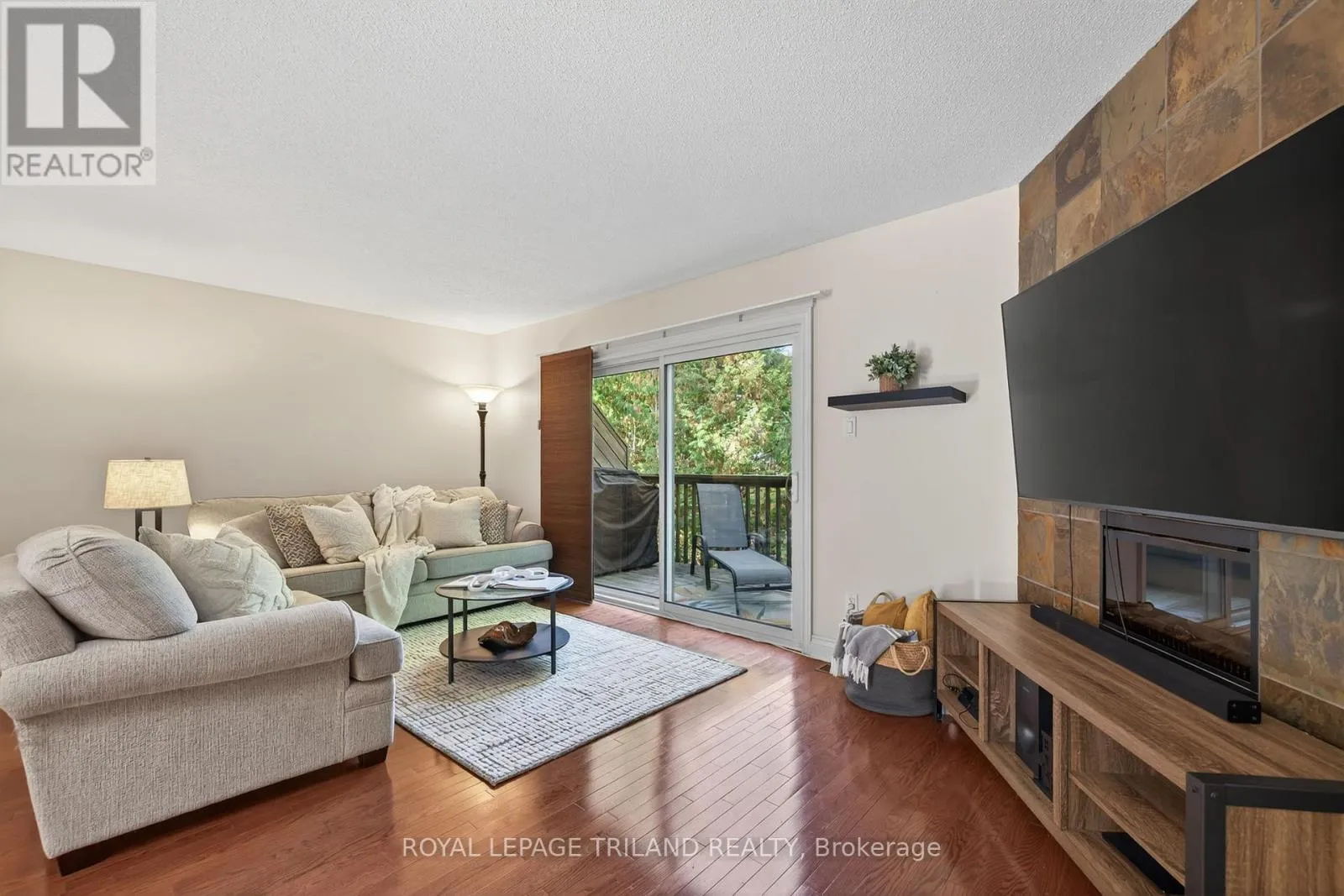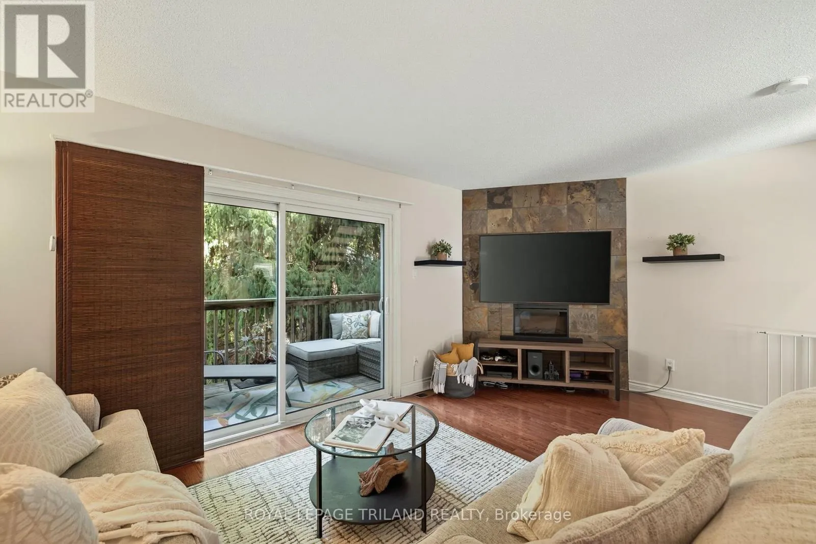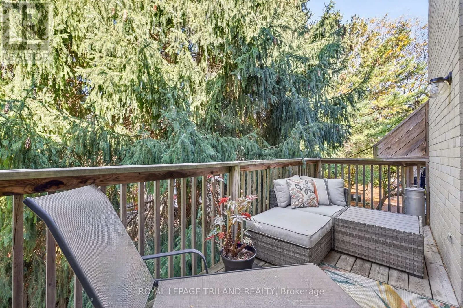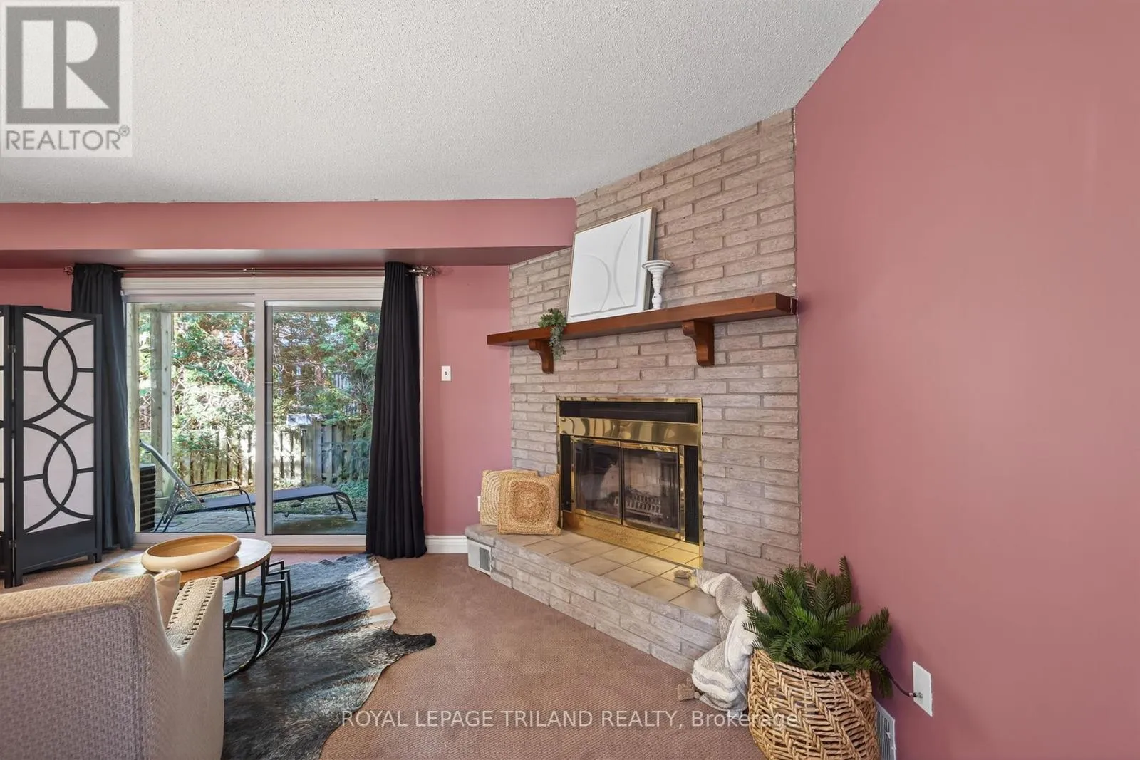 Commissioners and Reynolds Rd. Welcome to this bright and inviting 3-bedroom, 2-bathroom townhouse condo with three levels of comfortable living all in the heart of Byron, offering a warm chalet-style vibe. Head up to the main level, where you'll find an open-concept living and dining area featuring hardwood flooring, fresh paint, and an electric fireplace. The updated kitchen boasts newer stainless steel appliances, while two separate balconies one off the kitchen and another off the living room offer perfect spots for your morning coffee or evening unwind. A convenient 2-piece bath completes this level. The upper floor includes three bedrooms and a4-piece bath, with the primary bedroom featuring a walk-in closet for added storage and comfort. The ground-level walkout leads to a cozy back patio, perfect for enjoying the quiet surroundings, while inside, a wood-burning fireplace adds warmth and charm. Additional highlights include a Lennox furnace (2019),A/C (2016), and an owned water heater (2019), plus an attached garage for added convenience. Ideally located within walking distance to Springbank Park, close to Boler Mountain, and near great schools and local amenities, this move-in-ready home combines warmth, style, and an unbeatable Byron location. Book your showing today! (id:27476)