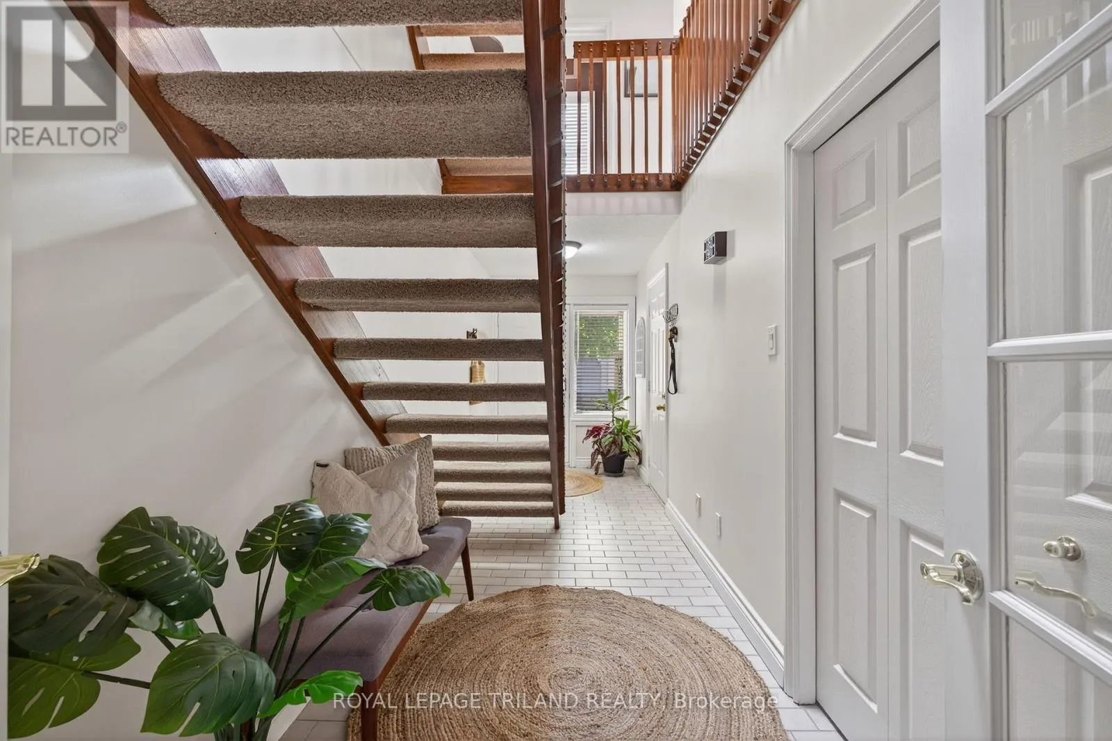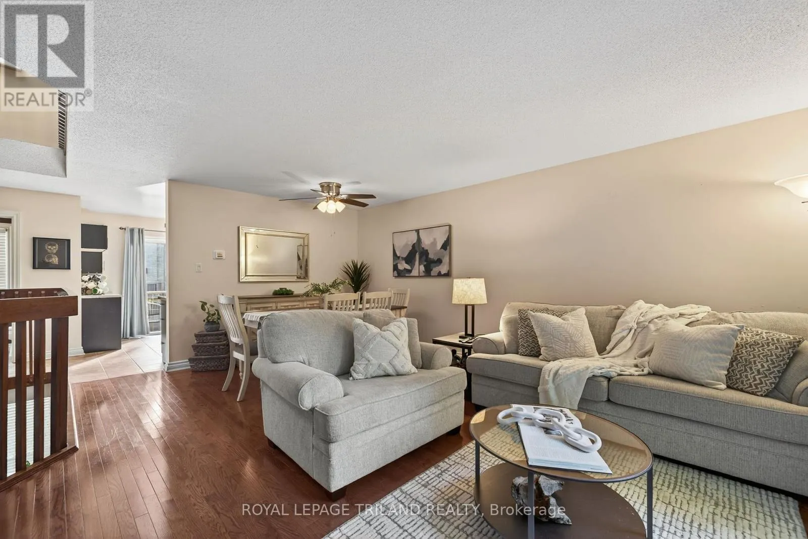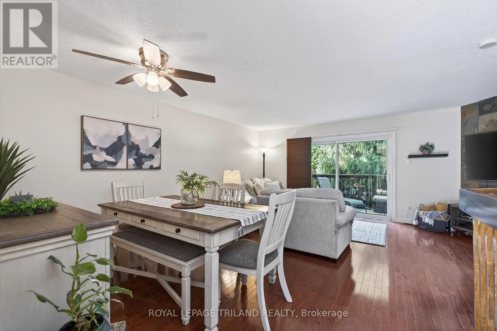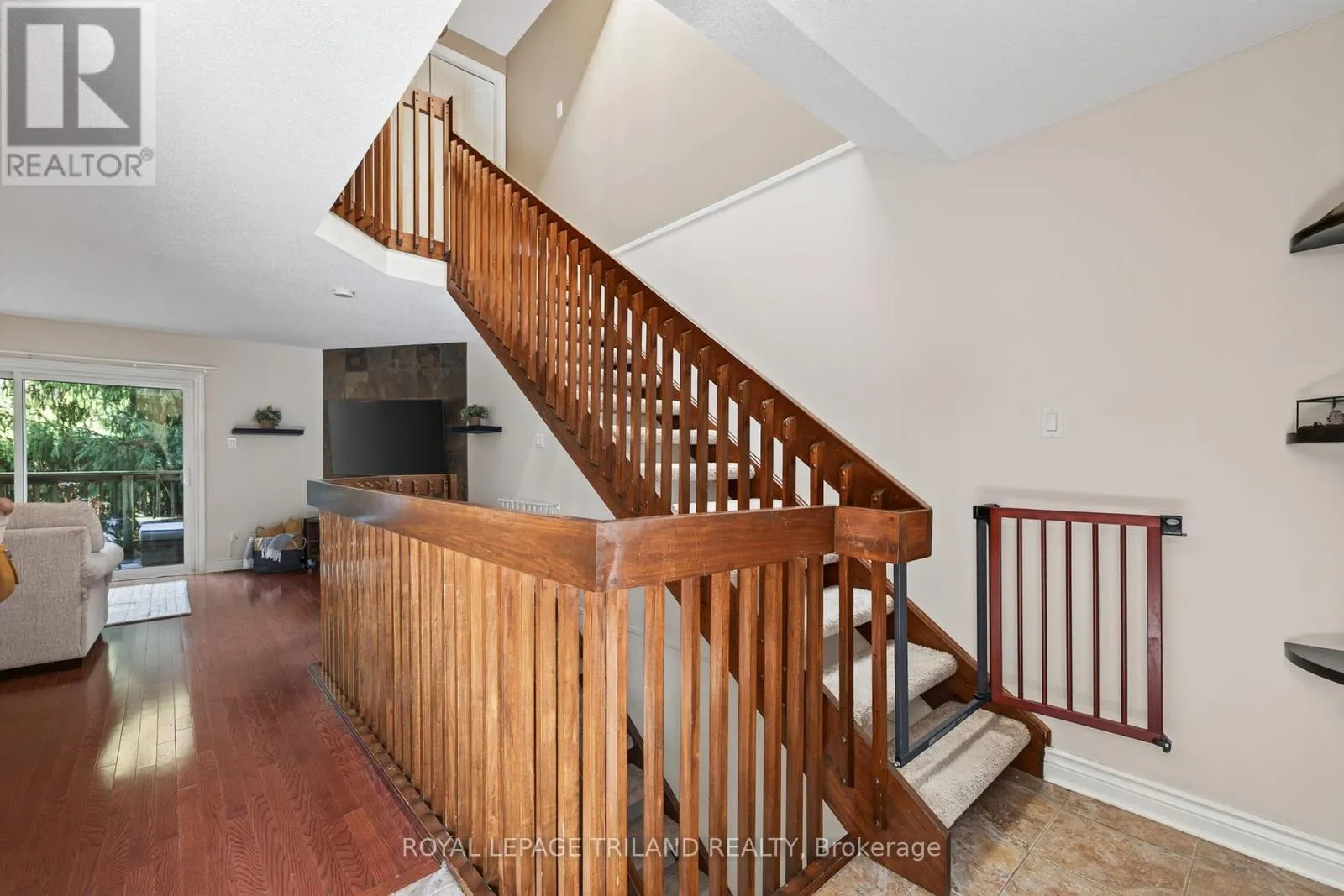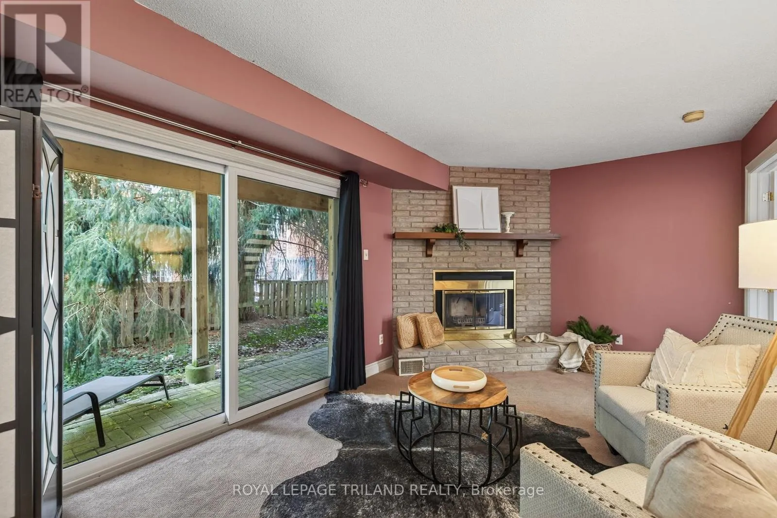 Commissioners and Reynolds Rd. Welcome to this bright and inviting 3-bedroom, 2-bathroom townhouse condo with three levels of comfortable living all in the heart of Byron, offering a warm chalet-style vibe. Head up to the main level, where you'll find an open-concept living and dining area featuring hardwood flooring, fresh paint, and an electric fireplace. The updated kitchen boasts newer stainless steel appliances, while two separate balconies one off the kitchen and another off the living room offer perfect spots for your morning coffee or evening unwind. A convenient 2-piece bath completes this level. The upper floor includes three bedrooms and a4-piece bath, with the primary bedroom featuring a walk-in closet for added storage and comfort. The ground-level walkout leads to a cozy back patio, perfect for enjoying the quiet surroundings, while inside, a wood-burning fireplace adds warmth and charm. Additional highlights include a Lennox furnace (2019),A/C (2016), and an owned water heater (2019), plus an attached garage for added convenience. Ideally located within walking distance to Springbank Park, close to Boler Mountain, and near great schools and local amenities, this move-in-ready home combines warmth, style, and an unbeatable Byron location. Book your showing today! (id:27476)