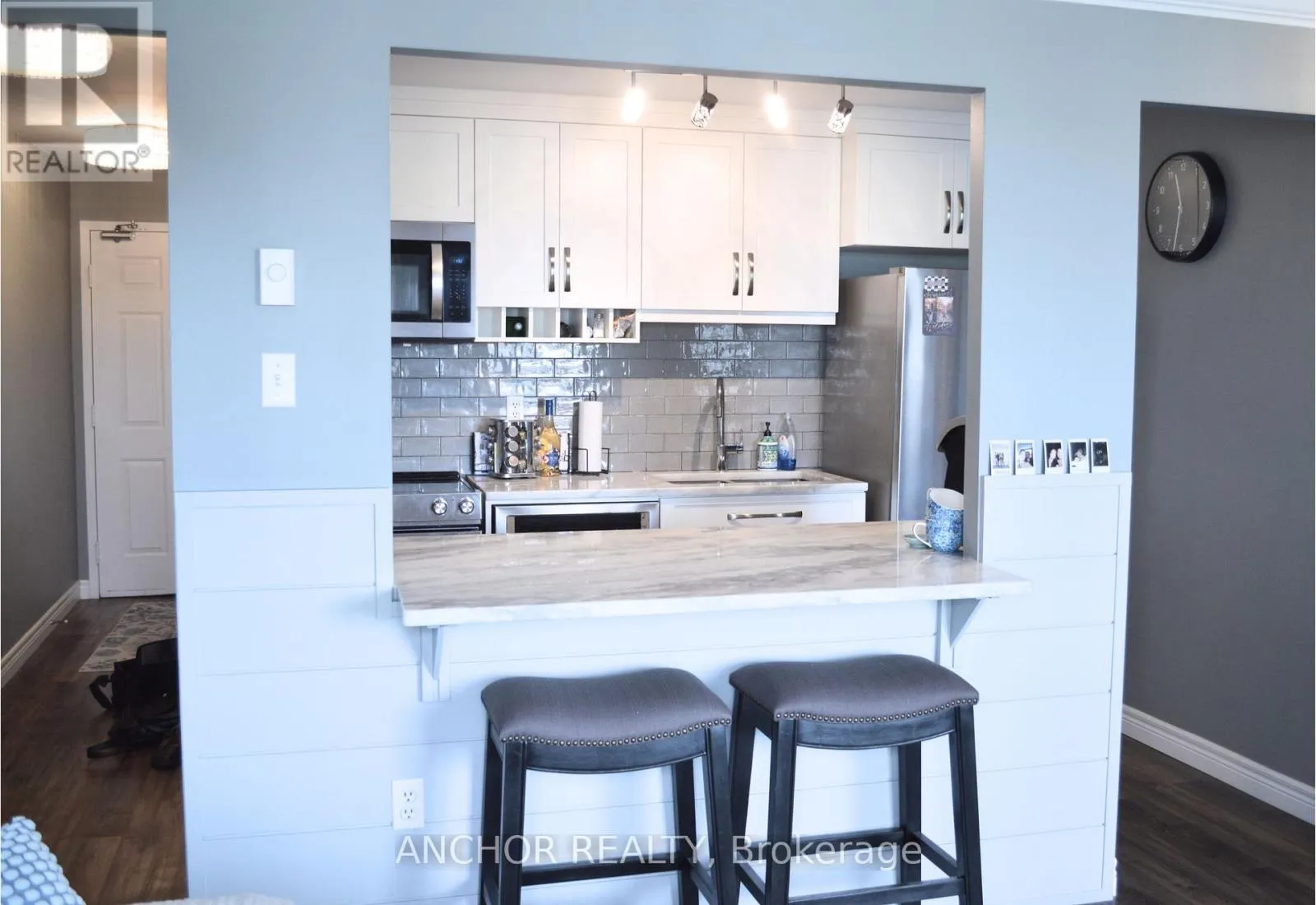 Cross Streets: Topping Lane. ** Directions: Head North on Wharncliffe Rd. S., turn left on Commissioners Rd. W., turn right. A unique and rare opportunity to own this one bedroom condo. From the 9th floor, enjoy the panoramic view of the tree tops and Western skies from the privacy of your balcony. The unit is spotless, lavished with tones of upgrades, professionally executed. Custom kitchen with stylish cabinetry, backsplash, new vanity cabinet, granite countertops, stainless steel appliances and breakfast bar. Crown moulding, laminate flooring throughout the house, new and modern light fixtures, all new high-end interior doors, window coverings, trims and the list goes on....no expense was spared! The large bathroom has been renovated top to bottom and it comes with its own storage cabinet. An oversized closet on the hallway, 8 ft. deep and large enough to store your sporting equipment and bike. In suite laundry for your convenience. All appliances included. Well maintained building with spacious lobby and controlled entrance. Plenty of parking space for both residents and visitors. Easy access to shopping, bus routes, schools and parks. Beautifully appointed, this home is perfect for the first-time home buyer, retirees looking to downsize or investors. (id:27476)