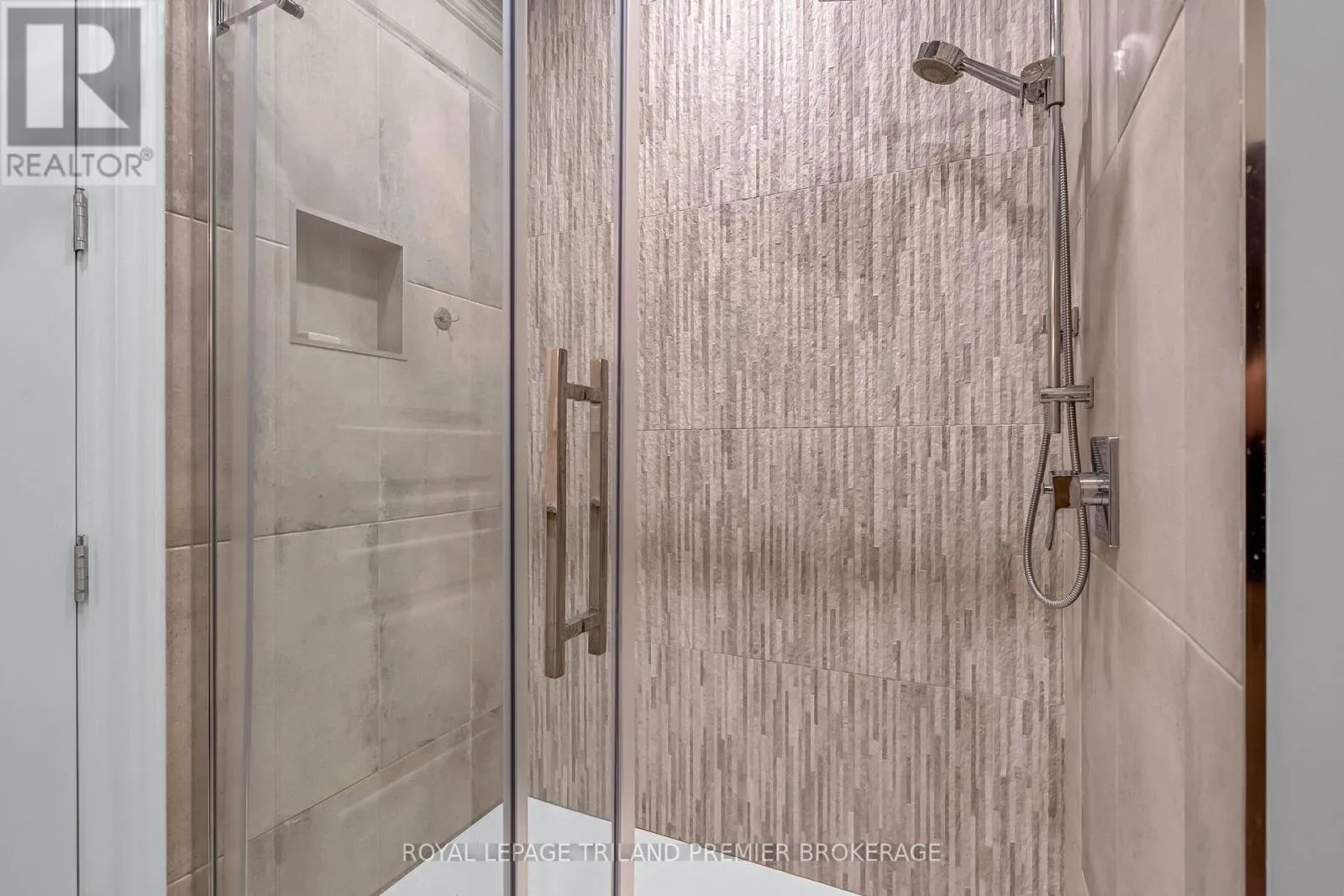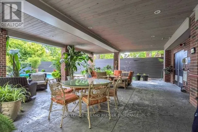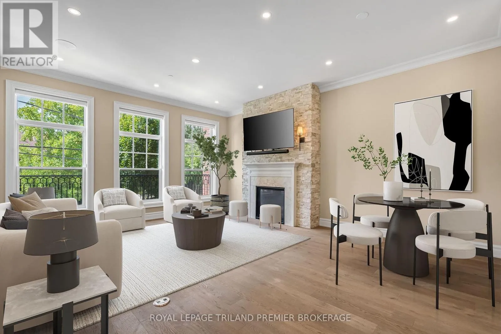 Cross Streets: Craig. ** Directions: CRAIG STREET. Welcome to PARKS EDGE, featuring only 7 suites in one of London's most desirable areas. Surrounded by majestic trees and beautifully landscaped grounds, complete with a pool and waterfall, this location is just minutes from downtown and mere steps from everything Wortley Village has to offer. Finished in the fall of 2017, Suite 202 boasts 1,332 square feet of interior space, along with an 8x15 southwest-facing covered terrace that overlooks the village. This terrace includes a hose bib, power, and gas hookup. This two-bedroom, two-bath suite exemplifies unparalleled quality, featuring 10-foot ceilings, oversized windows, a gas fireplace, and top-tier fixtures and finishes. Other notable attributes include custom GCW granite in the kitchen and bathrooms, high-end appliances, wide plank white oak flooring, in-floor radiant heating, solid core doors, extensive millwork, and automated blinds with blackout options in both bedrooms. Enjoy virtually no sound transfer between units, along with a Sonos sound system in the great room, kitchen, and primary bedroom. The Lutron lighting system throughout, including motion-activated features, adds significant value. The suite also offers extensive built-ins in all closets and a heated garage. A guest suite located just off the lobby is available for overnight visitors. The Common Element Fee covers building insurance, maintenance, common areas, door upkeep, landscaping, heating, private garbage removal, property management fees, roofing, snow removal, water, and windows. PET FRIENDLY BUILDING. This could be your next home sweet home! (id:27476)