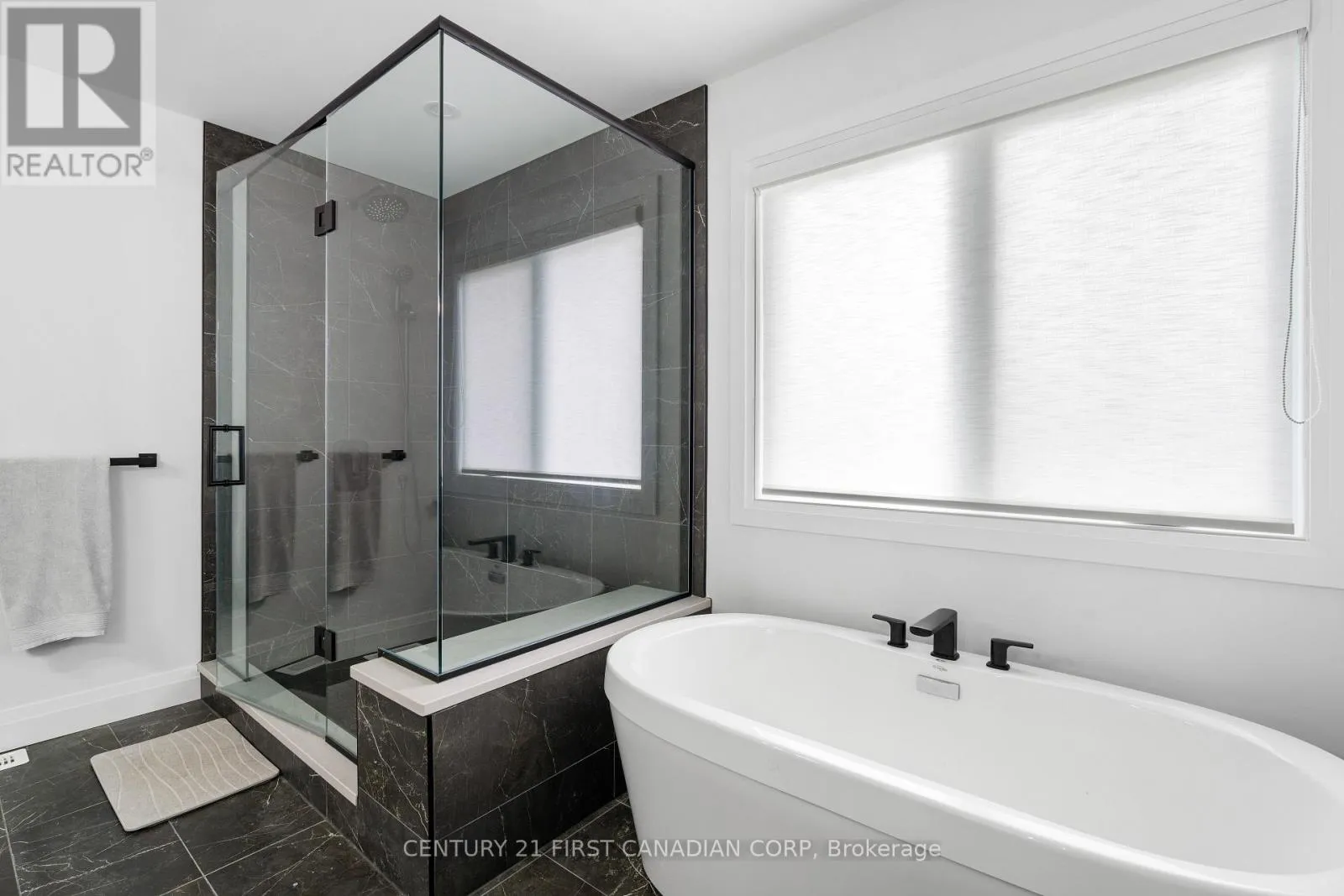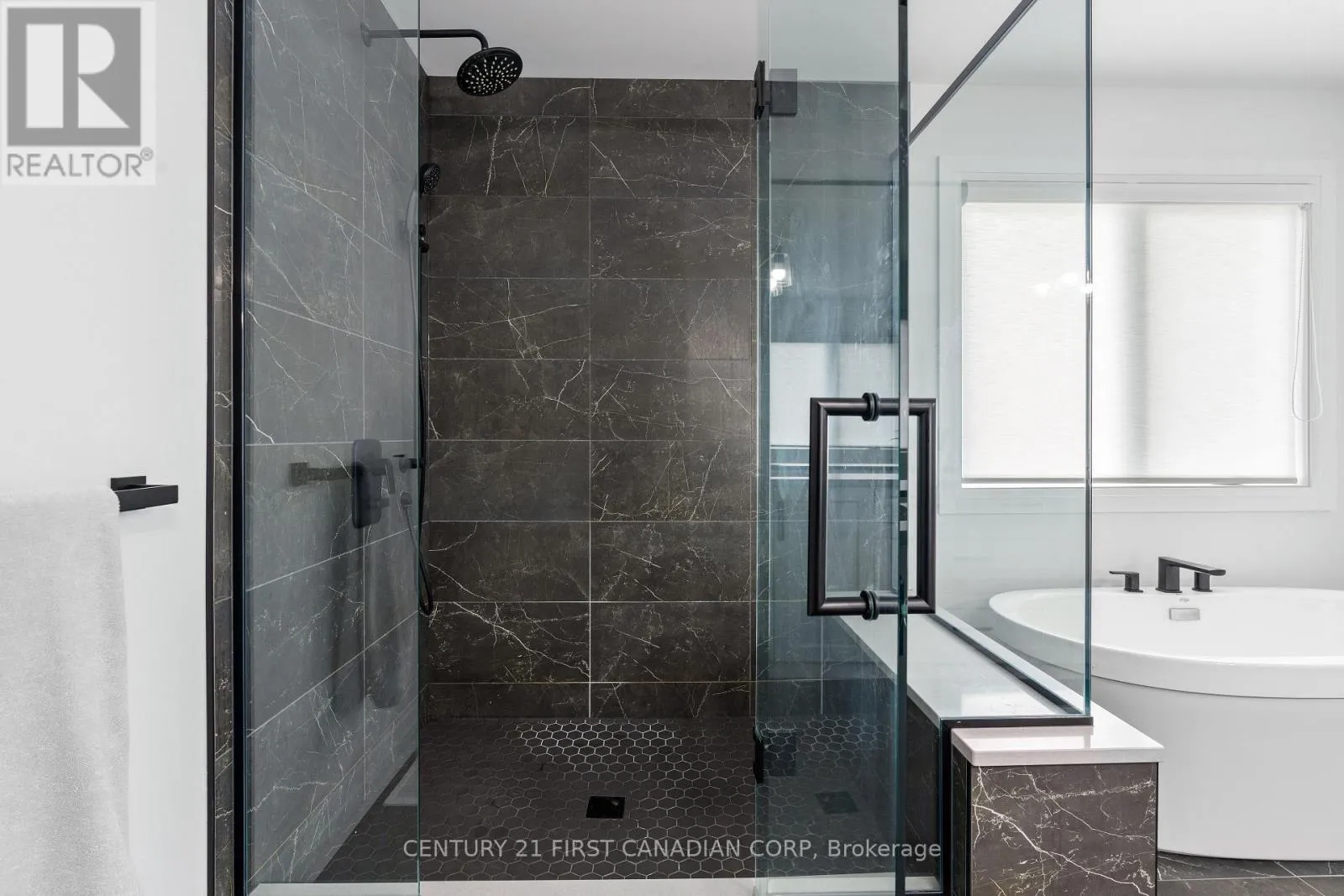 Cross Streets: Apricot Drive. ** Directions: From Boler Rd turn East on Manhattan Dr., then North on Apricot Dr then West on Princeton Terr. Custom-built by Castell Homes, this exceptional 4+1 bedroom, 4.5 bath home is located in the prestigious Boler Heights community in London. Set at the end of an exclusive court, it offers over 4,300 square feet of finished space on a fully fenced, spacious lot with a complete Rain Bird irrigation system. The open-concept main floor features a great room with gas fireplace and custom built-ins, a chef's kitchen with quartz countertops, large island, gas stove, walk-in pantry, and a butler's pantry with bar fridge connecting to the formal dining room. A private office, mudroom, and powder room complete the level. Upstairs includes four bedrooms, each with bathroom access, including a luxurious primary suite with a walk-in closet and spa-inspired ensuite. A convenient laundry room adds practicality. The finished lower level offers a spacious rec room, games area, fitness room, fifth bedroom, and full bath. A covered 22' x 12' deck overlooks the backyard. Located close to Byron, Optimist Park, and Westwood Power Centre, with easy access to Highway 401. (id:27476)