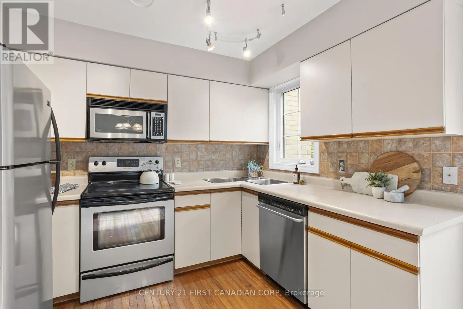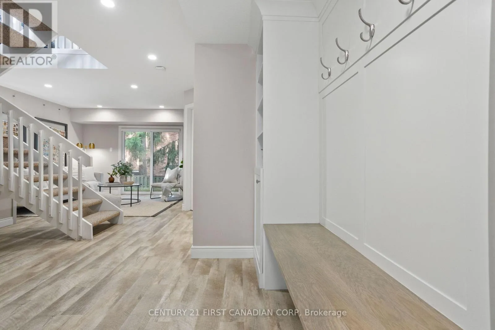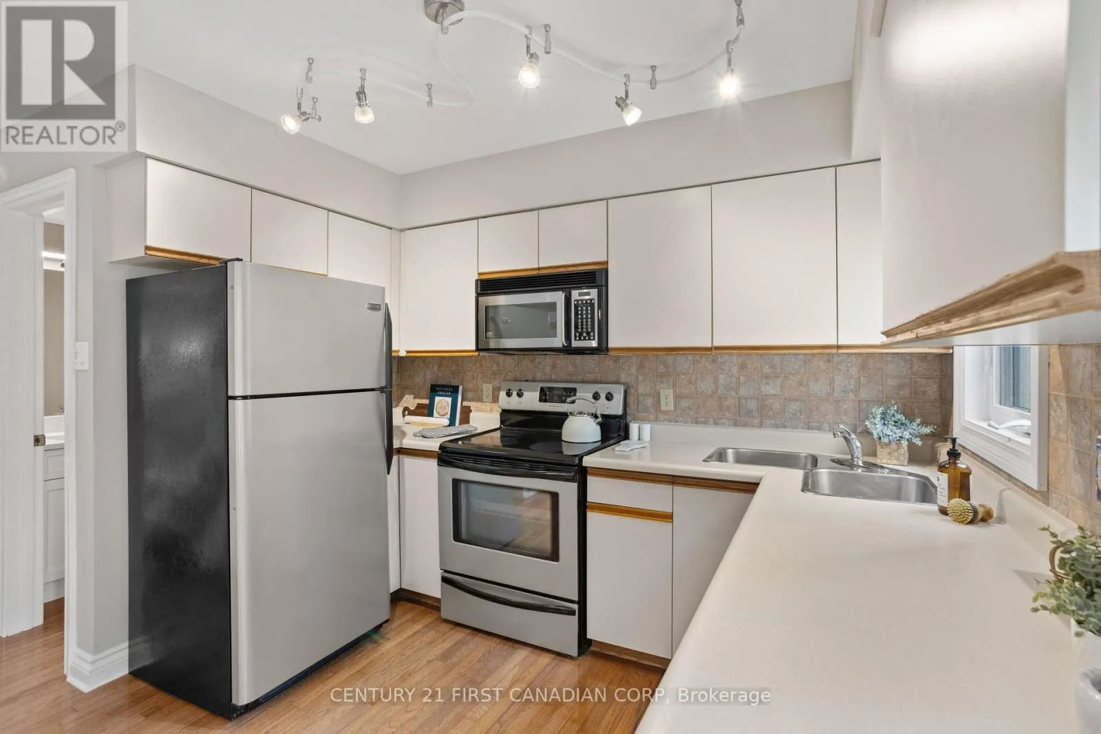 Cross Streets: Reynolds Road and Commissioners Road W. ** Directions: Heading west on Commissioners Road W., continue past Reynolds Road and the entrance to the property will be on your right. Welcome to 1399 Commissioners Road W., Unit 30, in the sought-after Byron neighbourhood of London. This three-storey townhome offers two spacious bedrooms, 1.5 bathrooms, and a single-car garage. The entry level features a versatile den or office space finished with luxury vinyl plank and provides access to a private patio through updated patio doors. The main floor showcases an open-concept design with hardwood flooring, a gas fireplace, and a private outdoor balcony space through updated patio doors off the living room. A central open staircase with a skylight from the third floor, combined with an abundance of windows throughout, fills the home with natural light. Upstairs, you'll find two generously sized bedrooms and a beautifully renovated three-piece bathroom completed with heated floors, tiled walls and floors, Grohe fixtures, and a 20 rainfall shower. The half bathroom on the main floor also includes Grohe fixtures and a gorgeous tile feature wall. The second and third floors are finished with hardwood, while the furnace room floor has been epoxied to match the luxury vinyl plank flooring. The home is further enhanced by an owned tankless water heater, increasing efficiency and comfort. The garage is finished with Gladiator Garage slat walls, baseboards, and an epoxy floor, offering excellent storage and durability. This condo community backs onto the Thames River and is just minutes on foot to Springbank Park and the heart of Byron, making it the perfect combination of nature, convenience, and lifestyle. (id:27476)