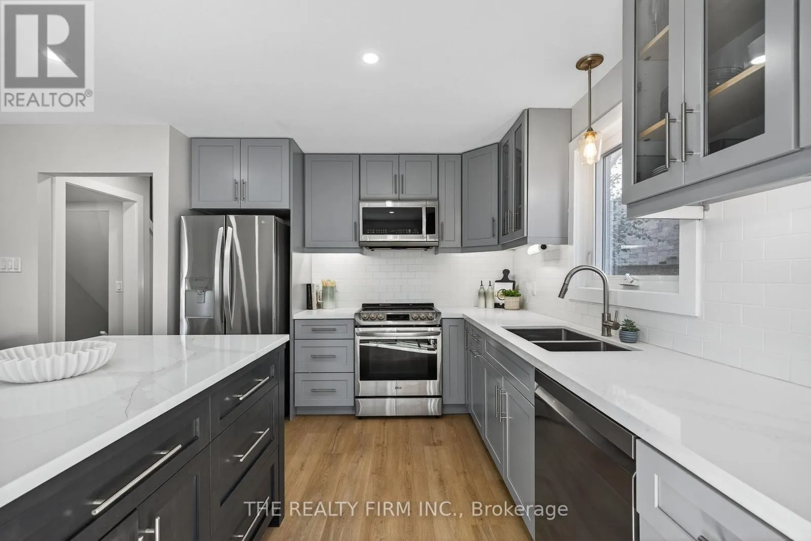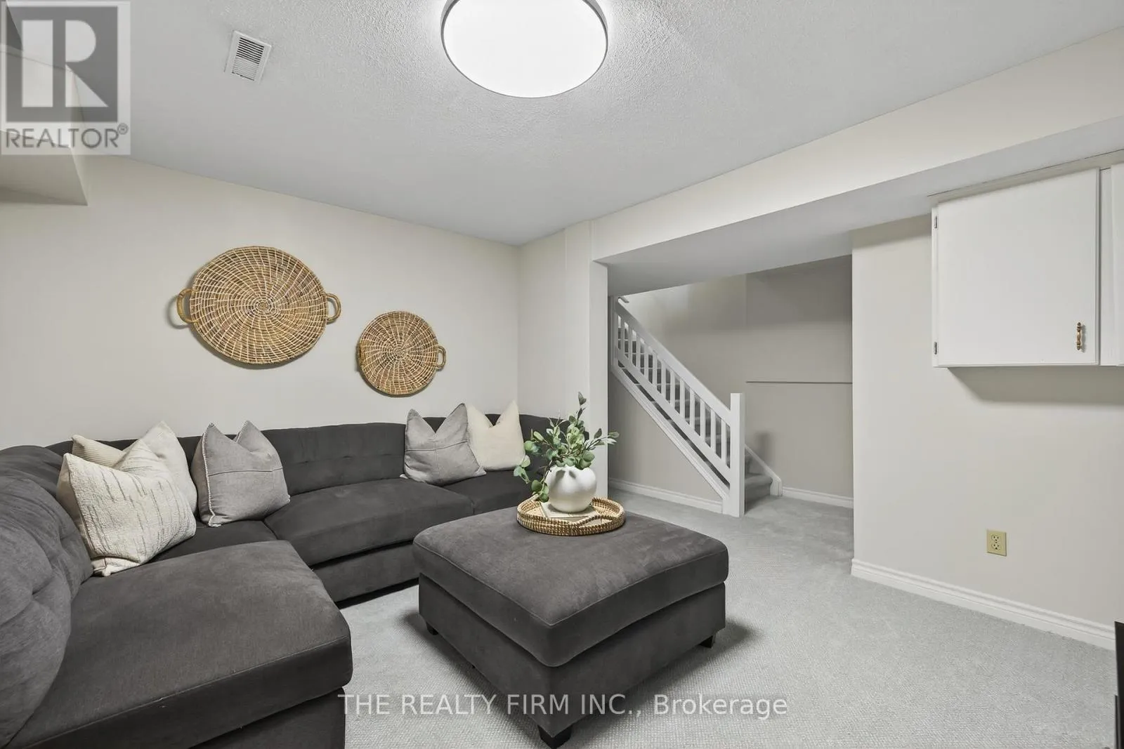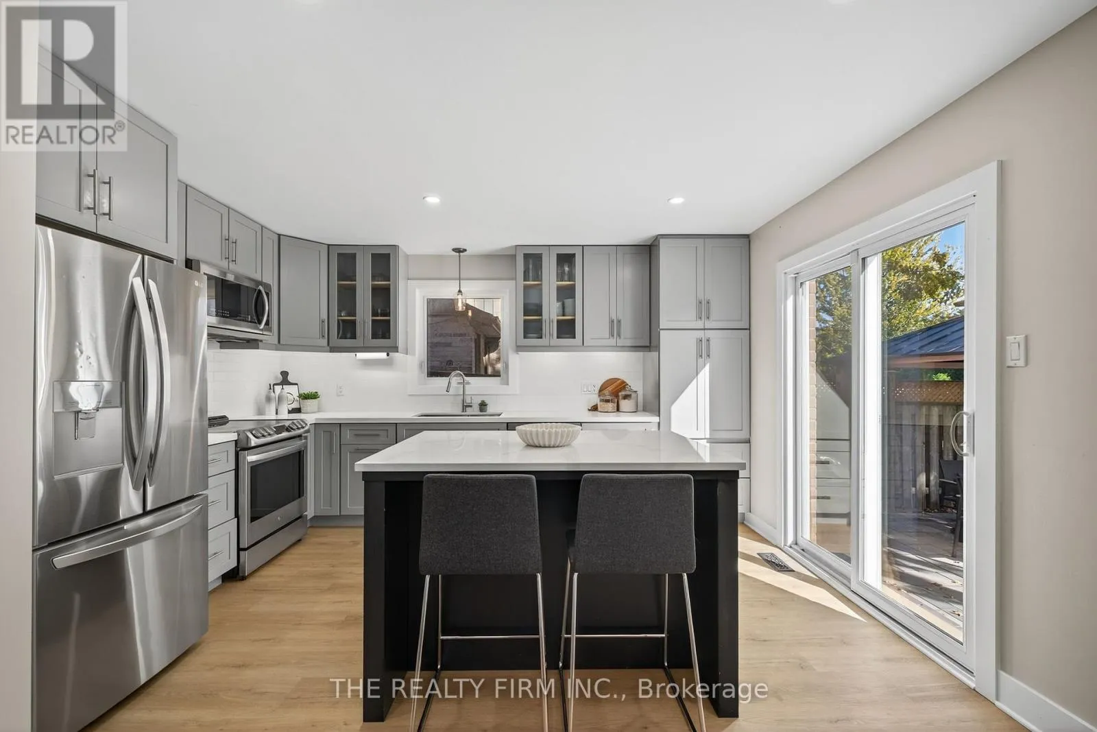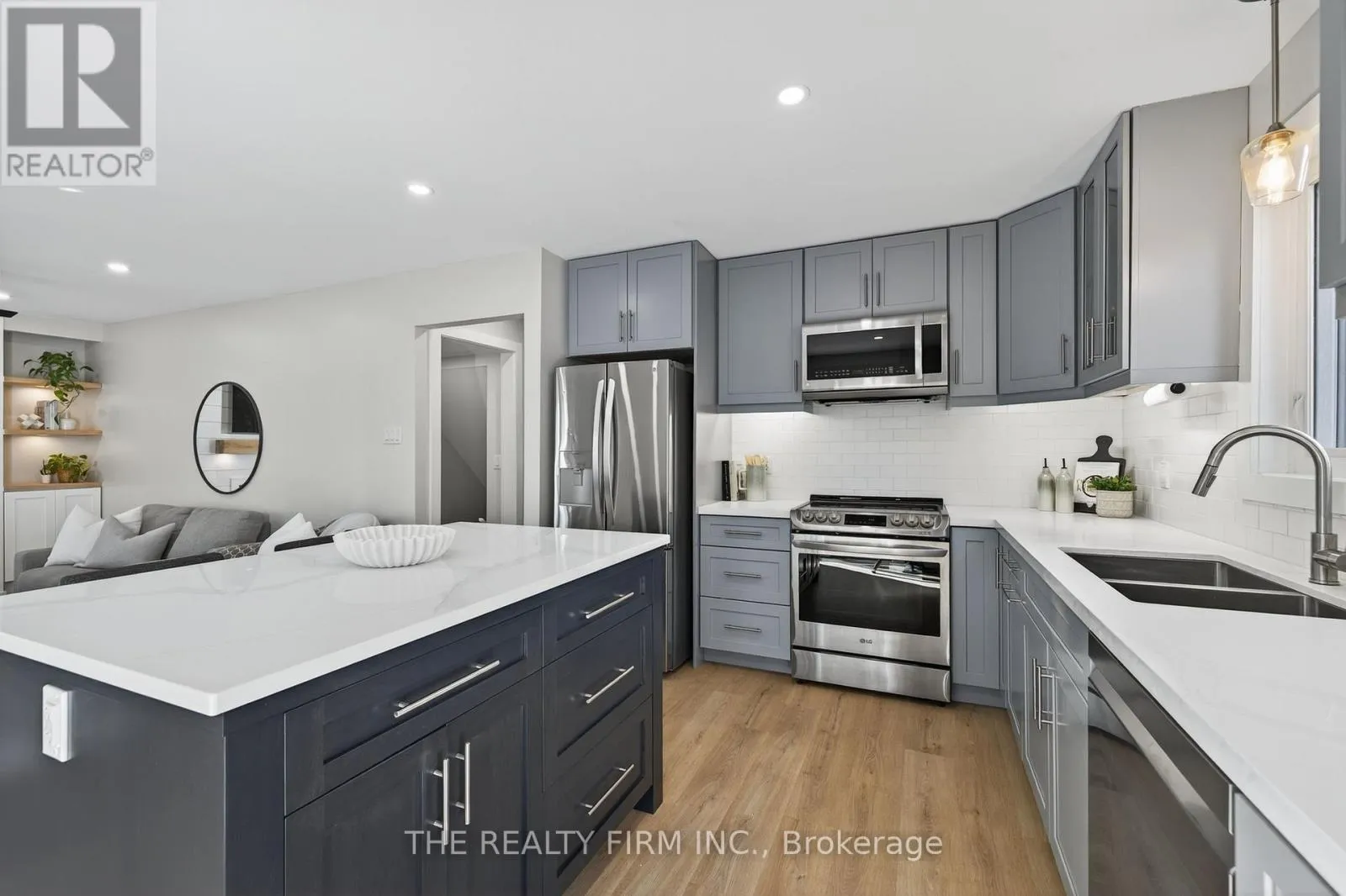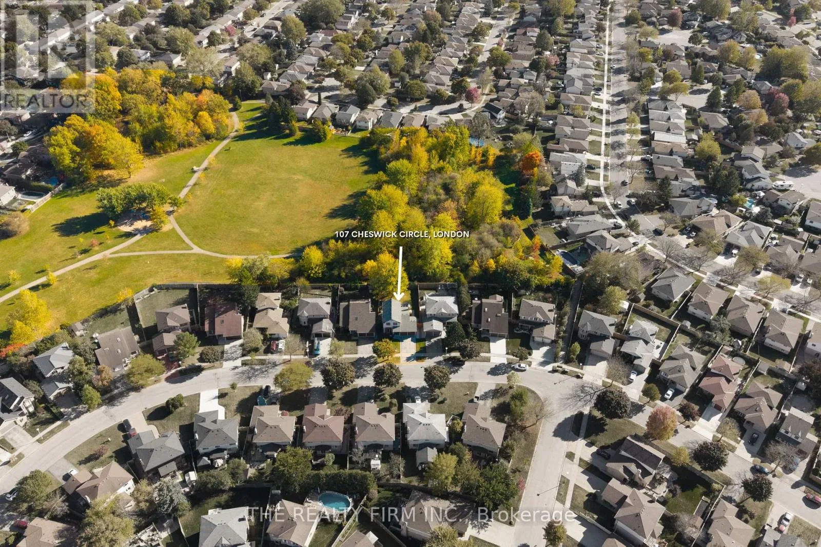 Cross Streets: Sarah Crescent & Cheswick Circle. ** Directions: From Exeter Rd, turn right onto Chalkstone Dr, left onto Jalna Blvd, then right onto Cheswick Circle. Discover ultimate family living at 107 Cheswick Circle. This beautifully updated two-storey home blends comfort, style, and function in a quiet, tree-lined neighbourhood where kids can ride bikes and neighbours still wave hello. Offering 3+1 bedrooms, 2 bathrooms (plus a basement rough-in) and double-car garage with paving stone driveway, it's the kind of home that instantly feels welcoming. Step inside to bright, open spaces finished with new vinyl plank flooring on the main floor and new carpet in the lower level. The dining room's crown moulding and large bay window create an inviting setting for family meals and holidays, conveniently located next to the 2-piece bathroom. The modern kitchen shines with stainless steel appliances, quartz counters, island with breakfast bar plus a generous amount of cabinetry for effortless organization. The adjoining living room centers around a cozy gas fireplace framed in charming shiplap, surrounded by custom built-ins. Oversized main-floor laundry connects to the garage and side yard, making everyday life easier. Upstairs, three spacious bedrooms feature ceiling fans and soft carpeting for comfort. The primary bedroom offers a walk-in closet, while the updated 4-piece bathroom showcases stylish finishes and a linen closet for added storage. The finished lower level extends your living space with a rec room, guest bedroom, and rough-in for a future bathroom -- ideal for a granny suite or teenage retreat. Out back, enjoy the serenity of nature with no rear neighbours and a stunning backdrop of forest and parkland. Relax under the gazebo, host barbecues on the paving stone patio, or watch kids and pets play freely in the open green space framed by mature trees. Additional recent updates include new shingles and eavestrough (2024) offering peace of mind for years ahead. Close to parks, trails, schools, White Oaks Mall, and Highway 401, this home delivers comfort, community, and connection -- everything a family could hope for. (id:27476)