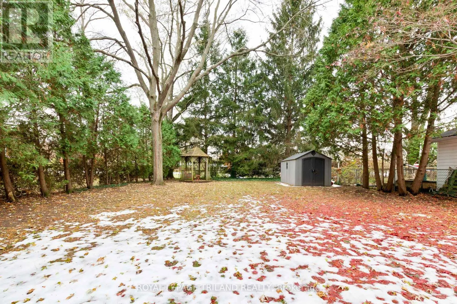 Cross Streets: Byron Baseline and Boler Rd. ** Directions: Byron Baseline Rd to Byron Blvd. Welcome to 365 Byron Blvd, a charming 2-bedroom + den/office, 2 full bathroom home set on a large, treed, and ultra-private lot backing directly onto a park. Situated in one of Byron's most desirable locations, you're just minutes from Springbank Park, downtown Byron, Boler Mountain, and several top rated schools. Inside, the warm and inviting living room features hardwood floors, crown moulding, and a gas fireplace, with hardwood carried through both bedrooms. The bright, functional kitchen offers a side-door entrance with direct access to the unfinished lower level, and features large windows overlooking the private backyard-providing a beautiful backdrop to all your meals. Step out from the kitchen to a covered back porch, leading to a back deck and hot tub-a perfect outdoor retreat for entertaining or unwinding. The expansive, beautifully treed backyard offers rare privacy and a tranquil setting right in the city. This home has been thoughtfully updated with a newer electrical panel, majority of windows, updated bathroom, deck, fence, new light fixtures, freshly painted, back and side exterior doors (2025), roof replaced in 2013. Move-in ready, thoughtfully updated, and ideally located - 365 Byron Blvd is a must-see! (id:27476)