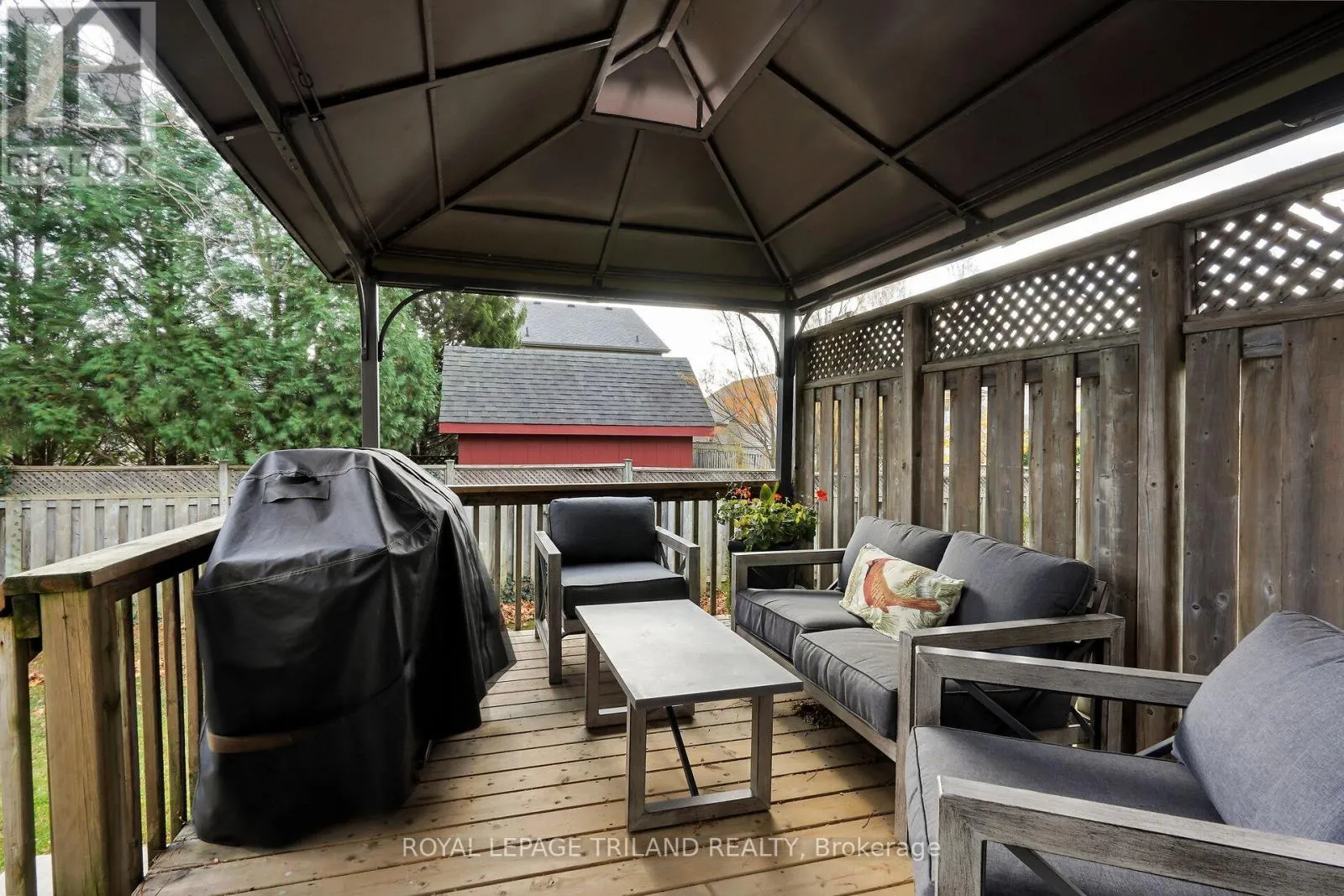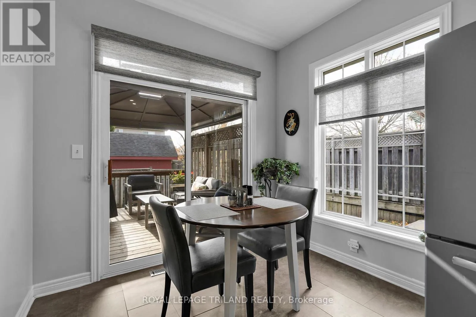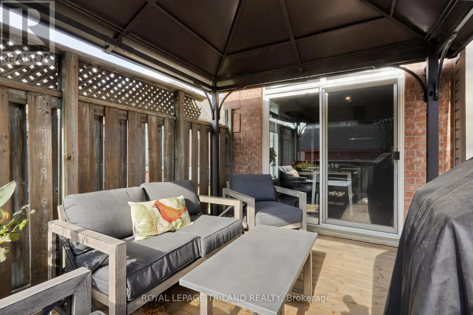 COMMISSIONERS ROAD AND HIGHBURY AVENUE Welcome to 121-2025 Meadowgate Blvd, a charming end unit townhouse nestled within a desirable gated community. Boasting 2+1 well-appointed bedrooms and 2.5 modern bathrooms, this residence is perfect for anyone looking to embrace a more comfortable, downsized lifestyle without compromising on quality or space. Upon entering this exquisite home, you'll be surrounded by the warmth of natural light that beams across the open concept living and dining area, complete with rich hardwood flooring, a striking vaulted ceiling, and an inviting ambience. The living space seamlessly unfolds into the eat-in kitchen, where culinary enthusiasts will delight in the opportunity to create sumptuous meals before stepping out to the private deck, crowned with a delightful gazebo, ideal for savouring peaceful moments. Convenience is key, with main floor laundry facilities and a generous primary bedroom that features a serene ensuite and a spacious walk-in closet. The large finished lower level offers additional living space, including a comfortable bedroom, a full bathroom, a recreation room perfect for entertaining, and a gas fireplace that adds a touch of cozy elegance. This immaculate home also includes a single car garage with opener and inside entry. The clubhouse, a hub of social activity, provides a party room, meeting room, gym, library, and an indoor pool. Its deck overlooks a tranquil pond with a fountain, offering picturesque views and a sense of community. Located with easy access to the 401, parks, trails, shopping, and the hospital, this property presents a turn-key solution for those seeking a serene, maintenance-free lifestyle. Spotless and move-in ready, this townhouse awaits to be your new haven of comfort and elegance. (id:27476)