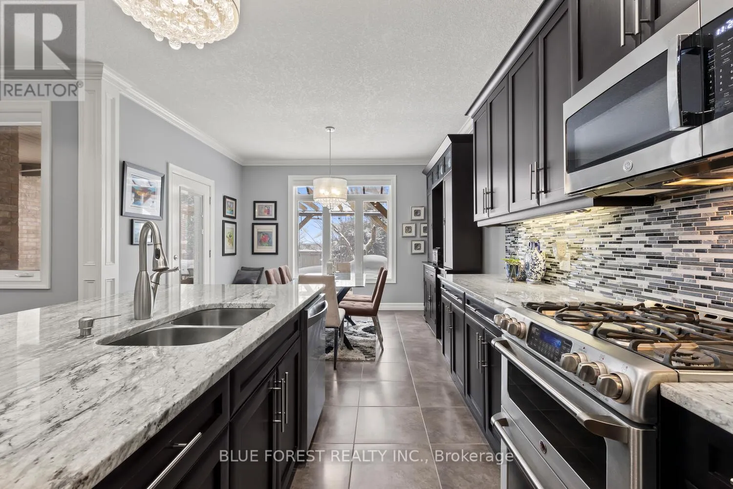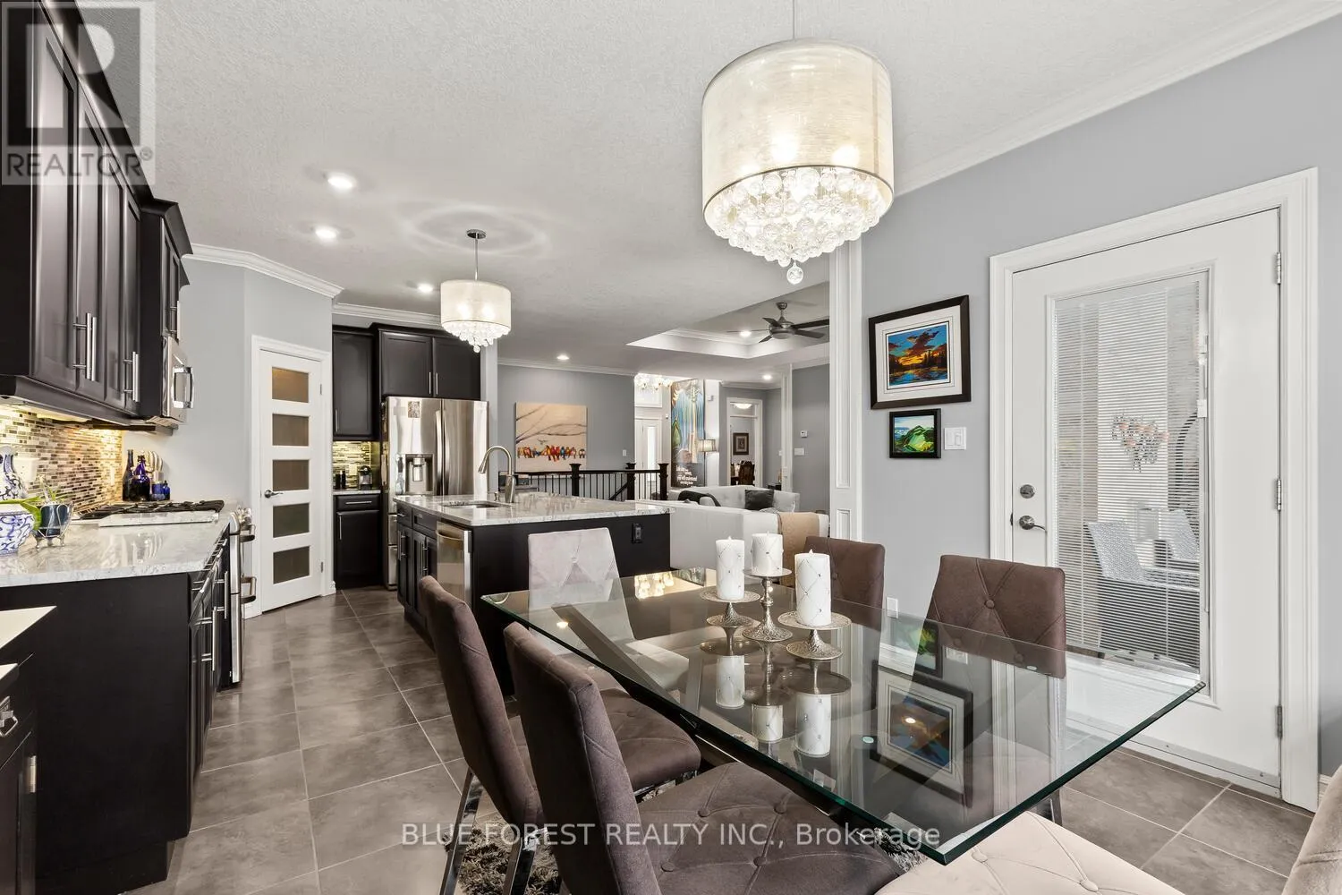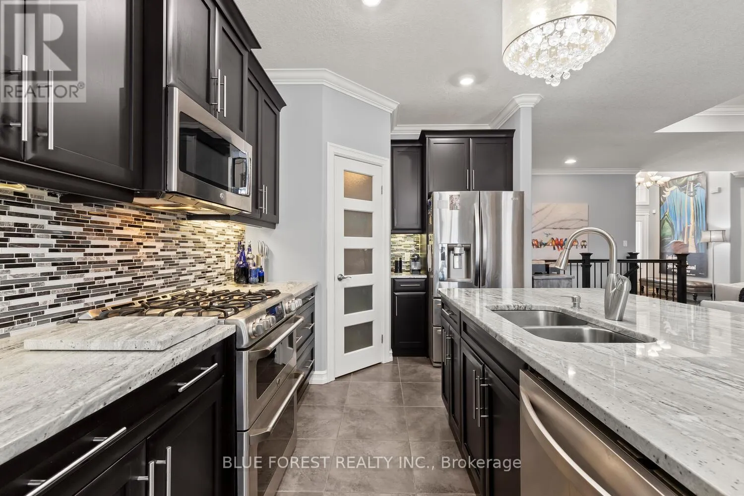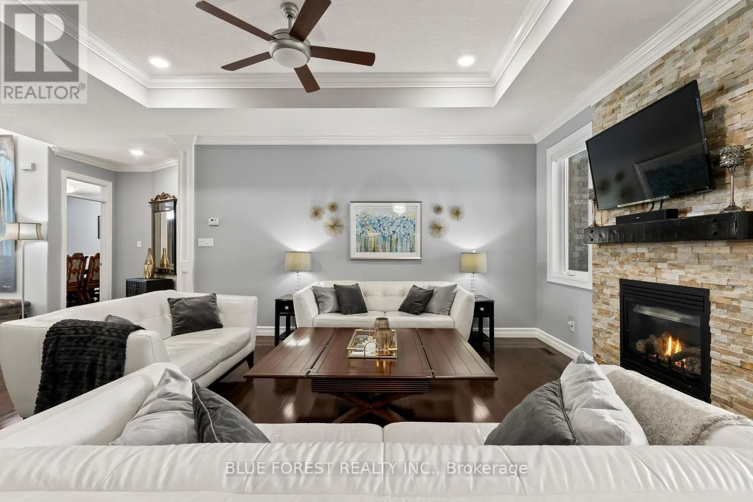 Cross Streets: PACK RD AND COLONEL TALBOT. ** Directions: Colonel Talbot south to Pack rd to Pioneer parkway. This stunning former model home is in immaculate condition and loaded with all the premium upgrades you would expect from a showcase property. Offering over 3,000 square feet of space, this home features 9ft ceilings, rich hardwood floors, and elegant crown moldings throughout. The main floor offers a bright and open layout, including a great room with gas burning fireplace, a beautiful kitchen finished with granite countertops, a large island, a corner pantry, and stainless appliances with a five-burner gas stove. The adjacent dining area features garden doors that open to a large covered porch, which connects to an extended deck. This outdoor setup is perfect for entertaining, providing a seamless transition to the fenced yard and mature trees while offering a sheltered space to enjoy the outdoors regardless of the weather.The main level includes three bedrooms, highlighted by a spacious primary suite featuring a walk-in closet and a three-piece ensuite with a jetted spa shower. One of the additional bedrooms is currently utilized as a formal dining room, demonstrating the floor plan's flexibility. A second four-piece bathroom with granite tops and a convenient laundry room with access to the triple-car garage complete the main floor. The fully finished lower level provides even more functional space with a large combination family and recreation room, complete with a custom built-in entertainment cabinet. This level also features a fourth bedroom with an attached private office and a three-piece bathroom with an updated shower. With a custom brick and stone exterior and a location just steps from nature trails, quick drive to all amenities, hospitals and 401 access, StarTech YMCA, parks, trails, a brand-new public elementary school (White Pine PS) this home is in absolute move-in condition. (id:27476)
