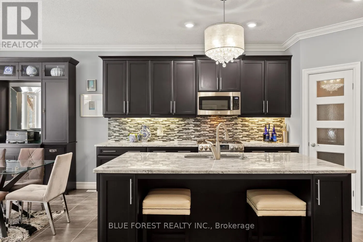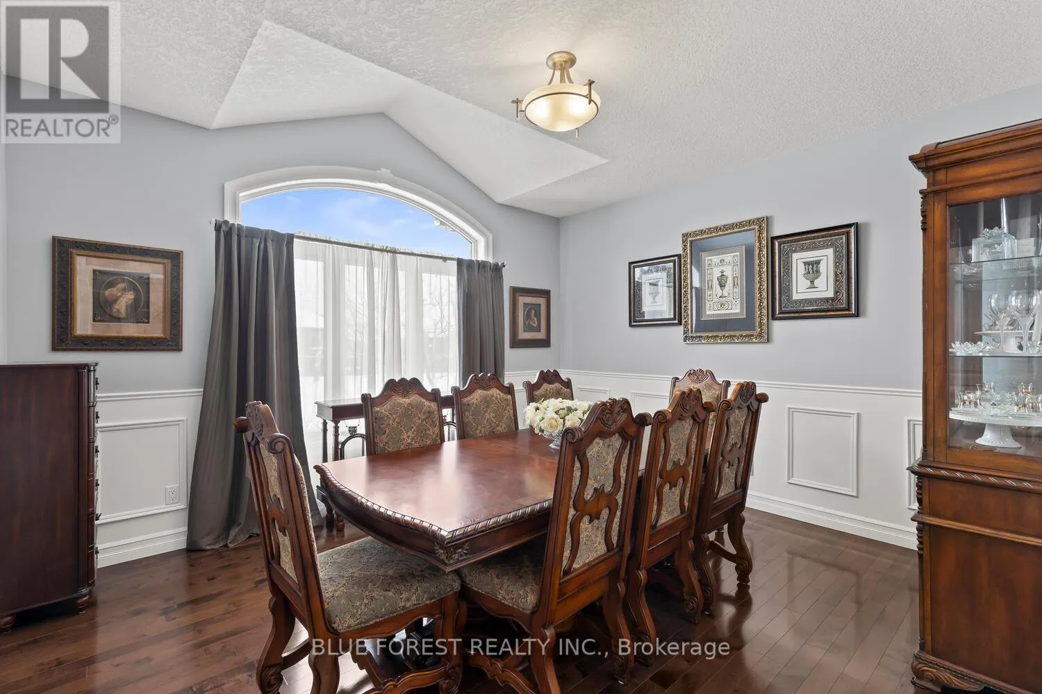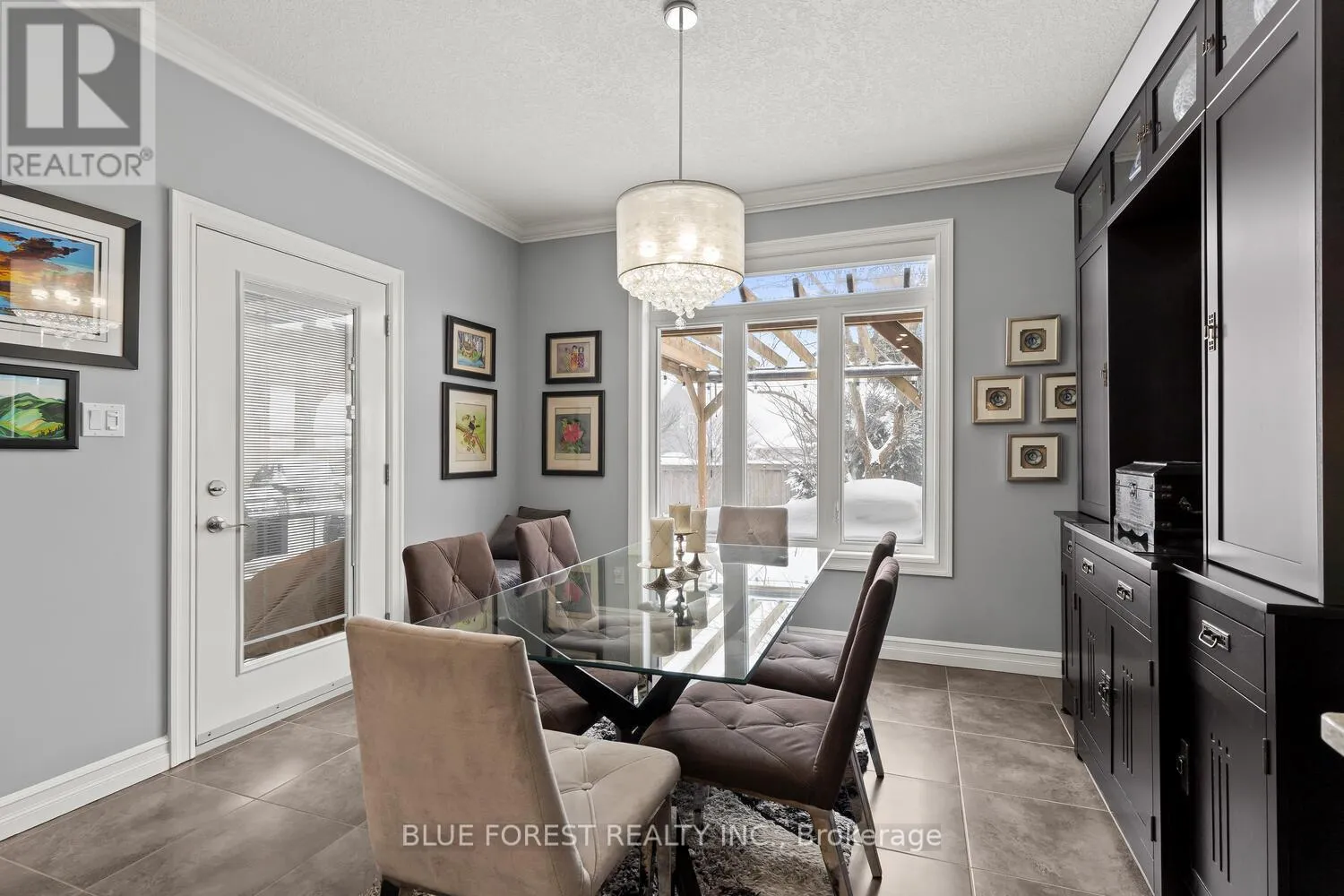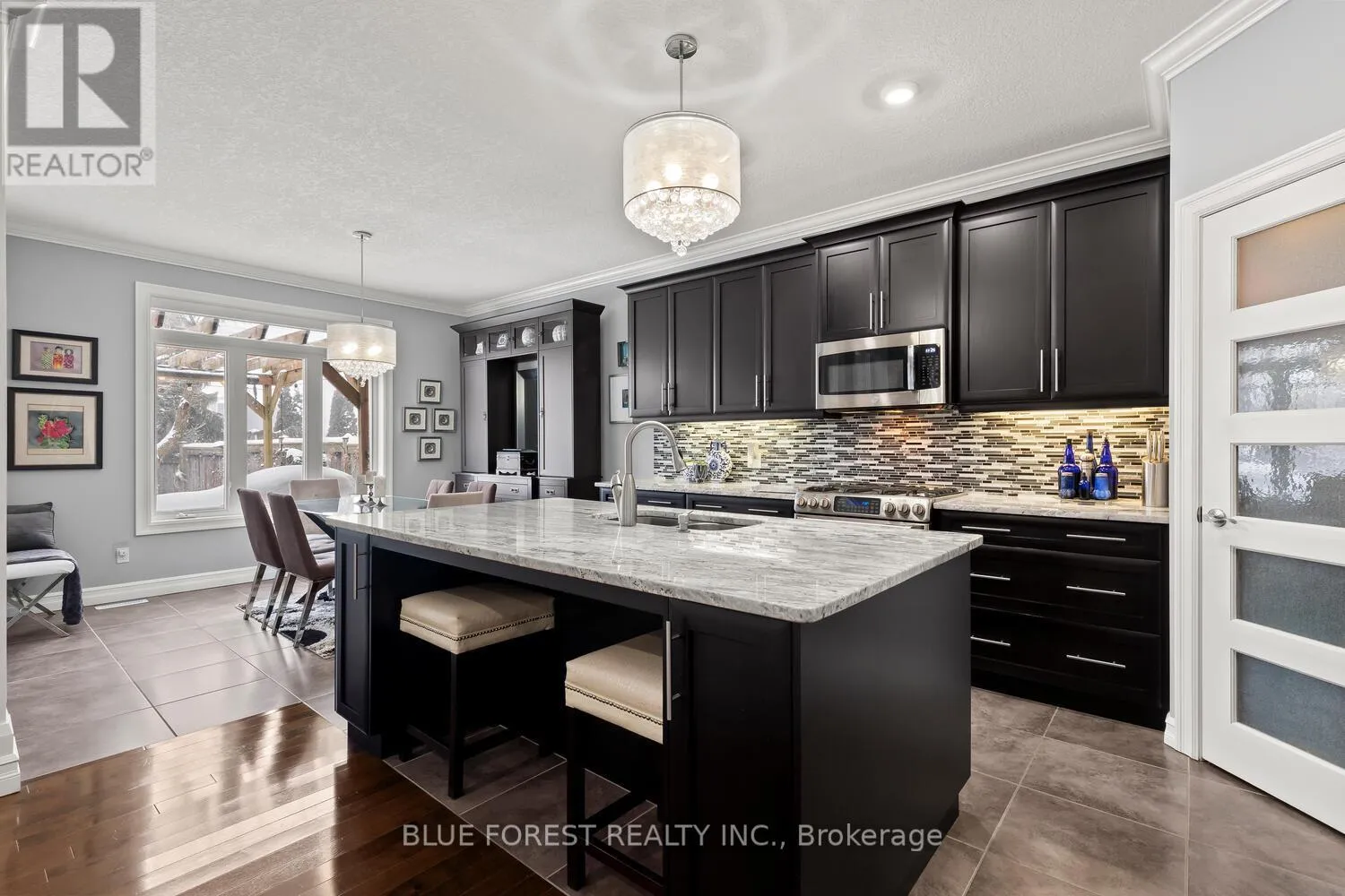 Cross Streets: PACK RD AND COLONEL TALBOT. ** Directions: Colonel Talbot south to Pack rd to Pioneer parkway. This stunning former model home is in immaculate condition and loaded with all the premium upgrades you would expect from a showcase property. Offering over 3,000 square feet of space, this home features 9ft ceilings, rich hardwood floors, and elegant crown moldings throughout. The main floor offers a bright and open layout, including a great room with gas burning fireplace, a beautiful kitchen finished with granite countertops, a large island, a corner pantry, and stainless appliances with a five-burner gas stove. The adjacent dining area features garden doors that open to a large covered porch, which connects to an extended deck. This outdoor setup is perfect for entertaining, providing a seamless transition to the fenced yard and mature trees while offering a sheltered space to enjoy the outdoors regardless of the weather.The main level includes three bedrooms, highlighted by a spacious primary suite featuring a walk-in closet and a three-piece ensuite with a jetted spa shower. One of the additional bedrooms is currently utilized as a formal dining room, demonstrating the floor plan's flexibility. A second four-piece bathroom with granite tops and a convenient laundry room with access to the triple-car garage complete the main floor. The fully finished lower level provides even more functional space with a large combination family and recreation room, complete with a custom built-in entertainment cabinet. This level also features a fourth bedroom with an attached private office and a three-piece bathroom with an updated shower. With a custom brick and stone exterior and a location just steps from nature trails, quick drive to all amenities, hospitals and 401 access, StarTech YMCA, parks, trails, a brand-new public elementary school (White Pine PS) this home is in absolute move-in condition. (id:27476)
