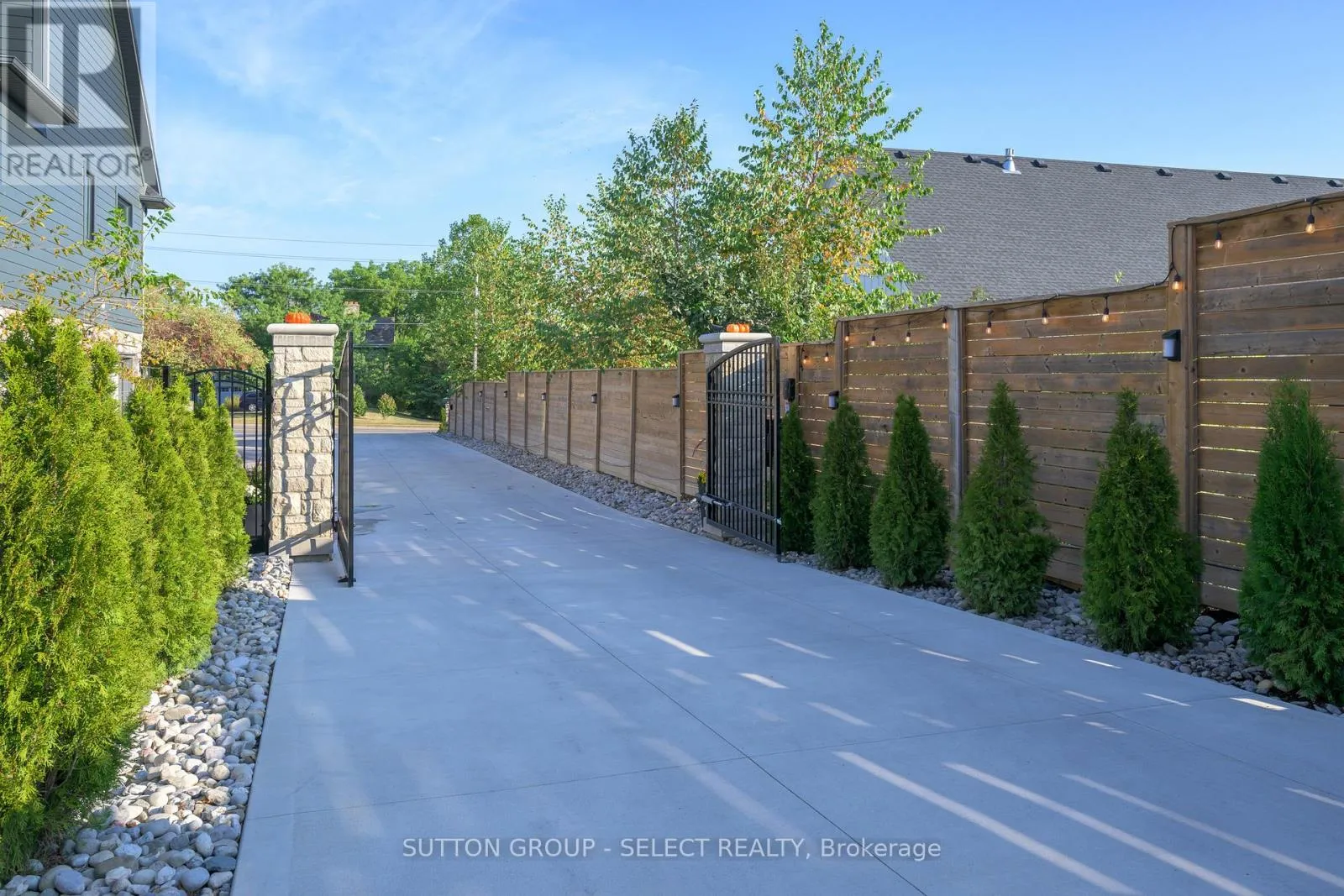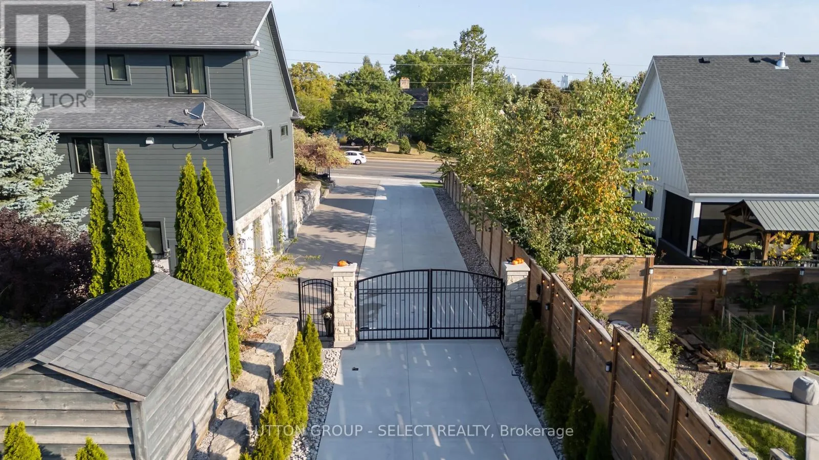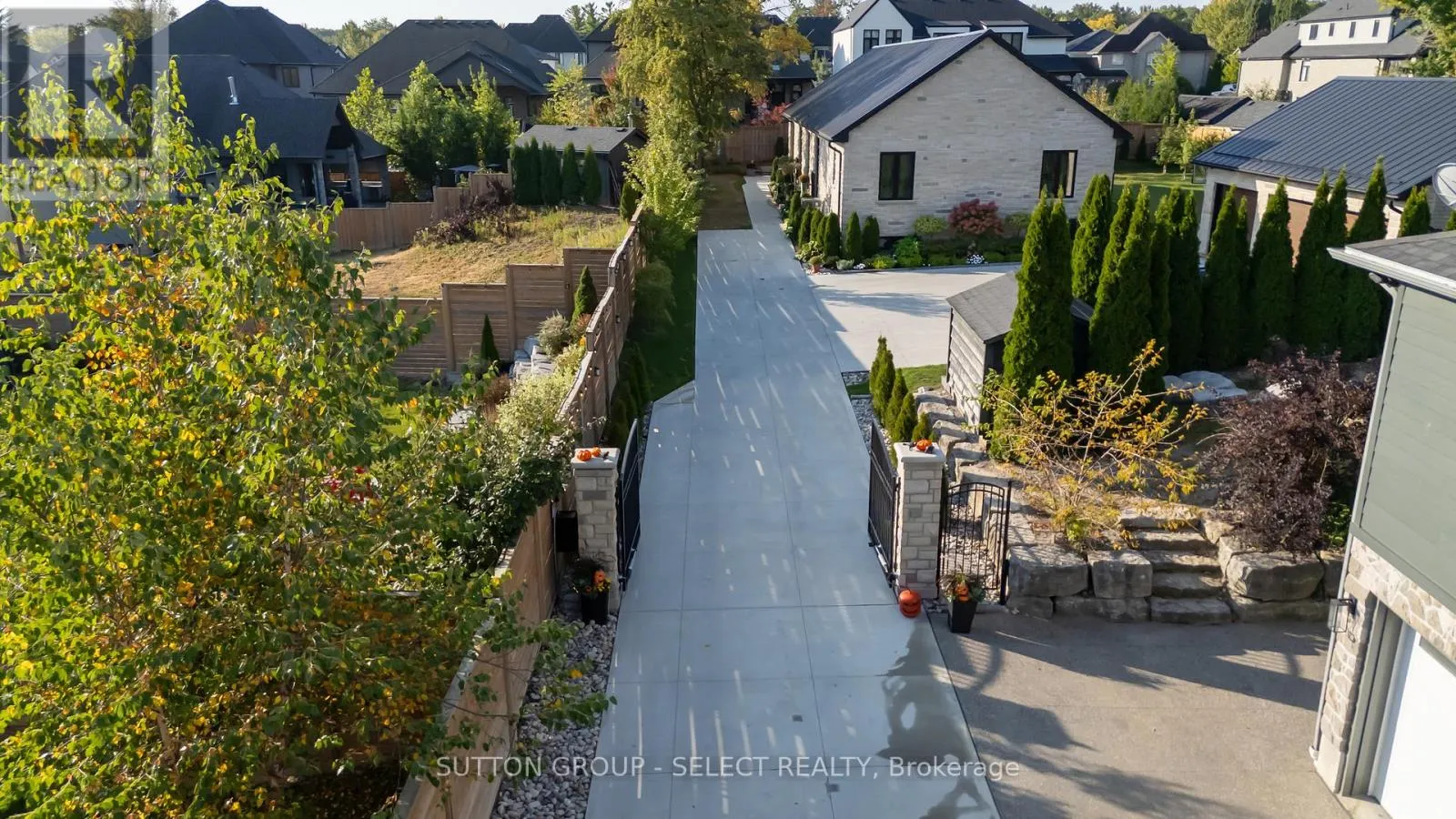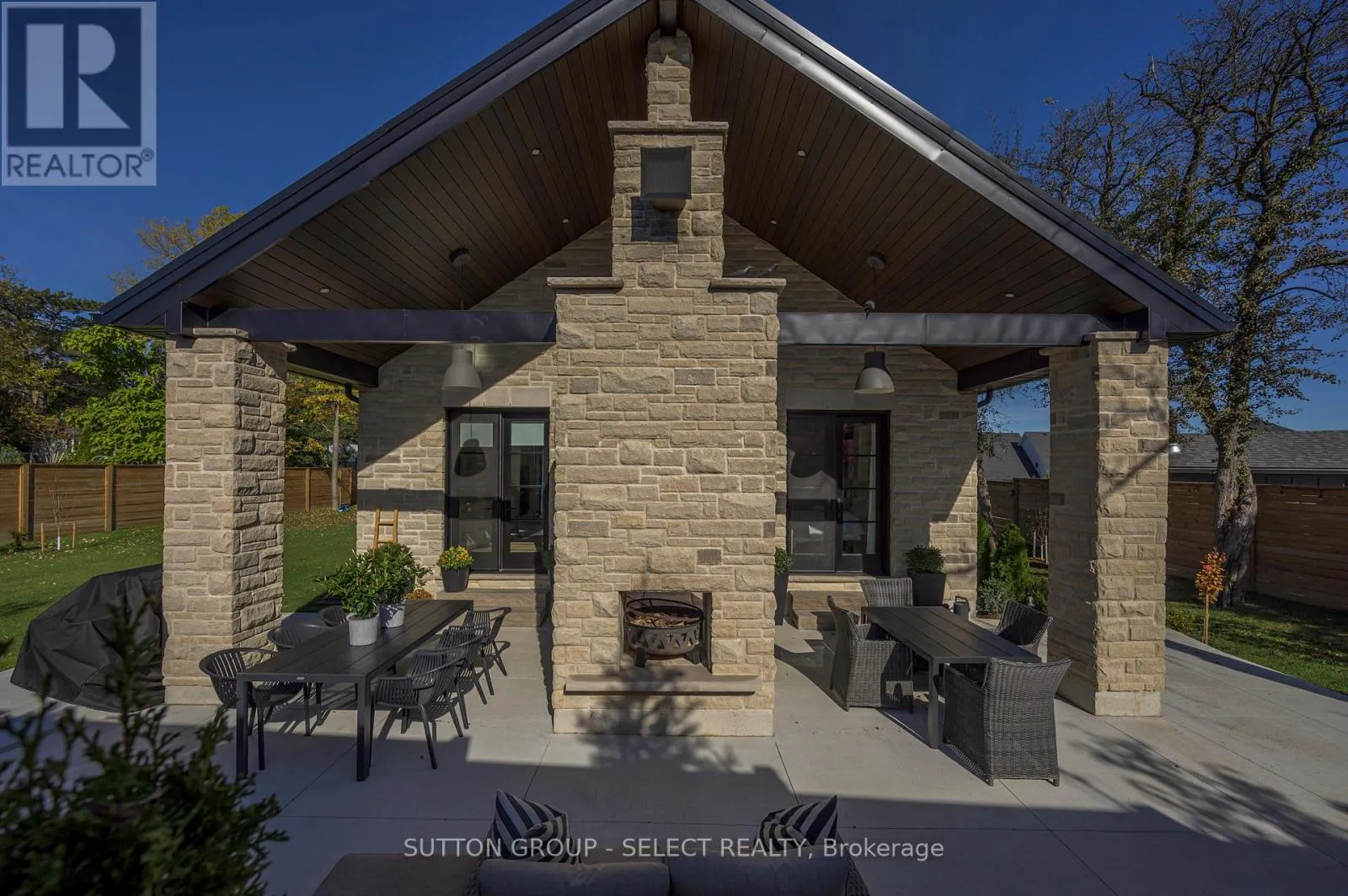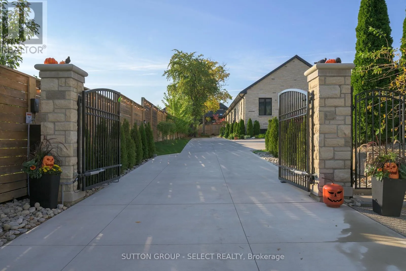 Cross Streets: Edwin Drive. ** Directions: Commissioners Rd E & Edwin Drive. Understated executive bungalow, set intentionally back from the road, behind the mystique of automated privacy gates, creating the English stone-cottage inspired residence found wrapped in trees, tranquility, and quiet prestige. A long, softly illuminated, concrete drive draws you away from traffic to a quiet fully fenced, pool-sized lot, with abundant guest parking and a separate 3-car garage. The timeless stone exterior, romantic Juliette balconies, and partially covered verandah set the stage for refined outdoor living, anchored by a two-sided fireplace that invites lingering evenings and effortless entertaining. Inside, soaring 10-ft ceilings on the main level and 9-foot ceilings in the lower level create a sense of volume and light for this modern-European aesthetic. The main floor unfolds in a thoughtful 2-bedroom plus den layout that balances intimacy and openness, centred around a showpiece kitchen with ceiling-height flat-panel cabinetry, quartz surfaces, and a wet bar/servery with garden door access to the terrace. Scandinavian-inspired baths and a serene, boutique-style primary suite complete the upper level with quiet sophistication, while the den adapts easily as a third bedroom. The lower level is equally impressive and remarkably versatile, offering 3 additional bedrooms, 2 bathrooms, a full second kitchen and laundry, and expansive living areas filled with natural light. Whether envisioned as a seamless extension of the main home, a private guest or teen retreat, or an elevated work-from-home, the possibilities are exceptional. Notably, there are no interior load-bearing walls on this level, allowing easy removal of fireplace and island to create an exceptional flex/games/media space. A metal roof, 3-bay garage w/ 220-amp service & the rare setback position complete this private, design-driven residence delivering beauty, presence, and flexibility in equal measure-quietly tucked away, yet moments from Hospitals, Wortley Village, and Highland Golf. (id:27476)