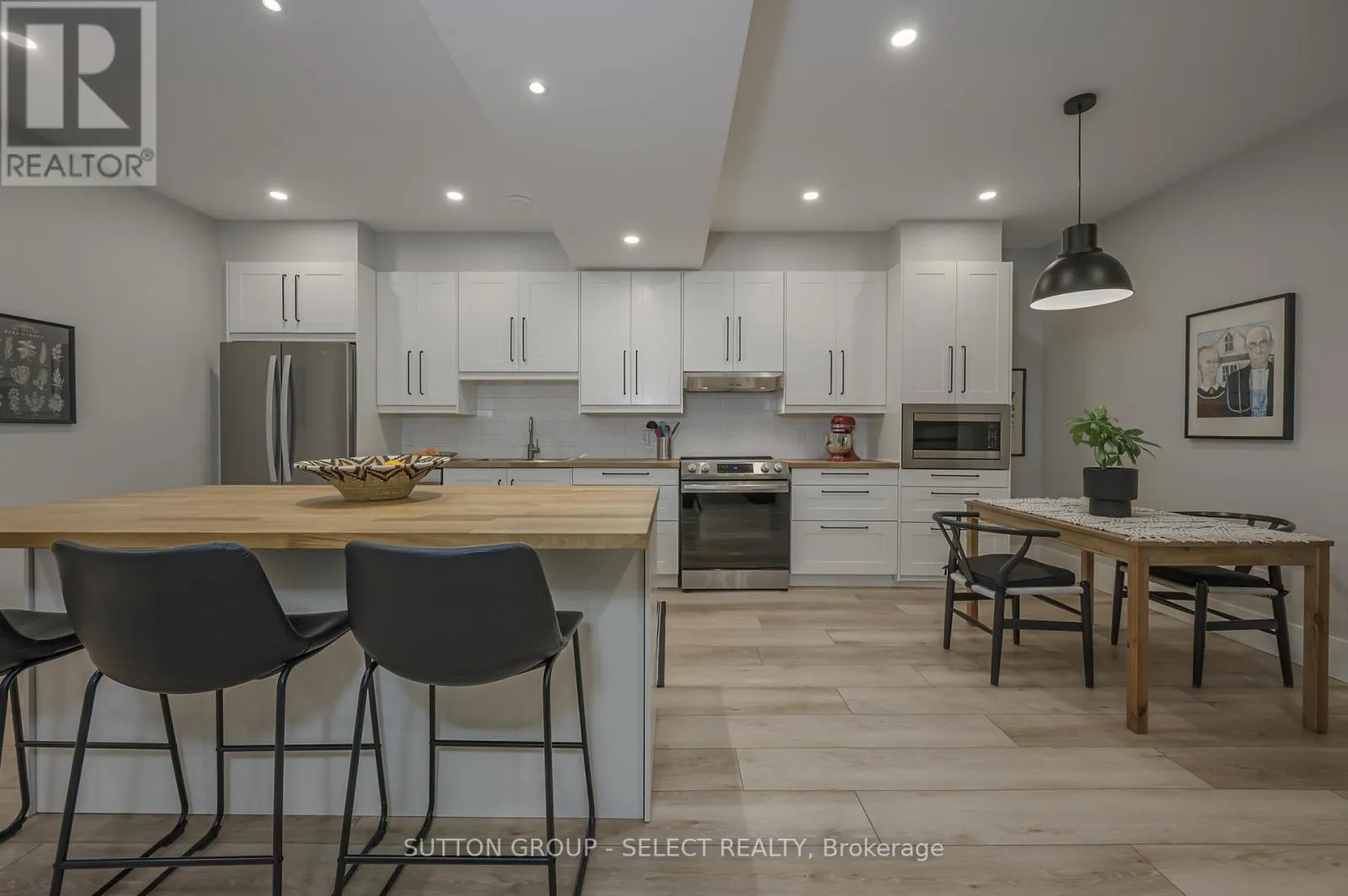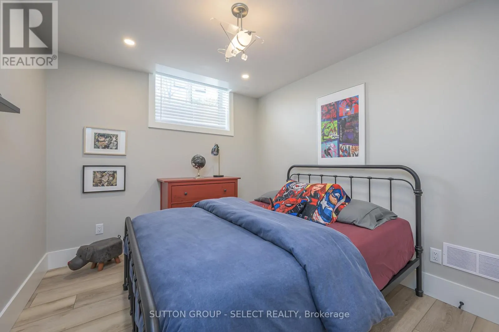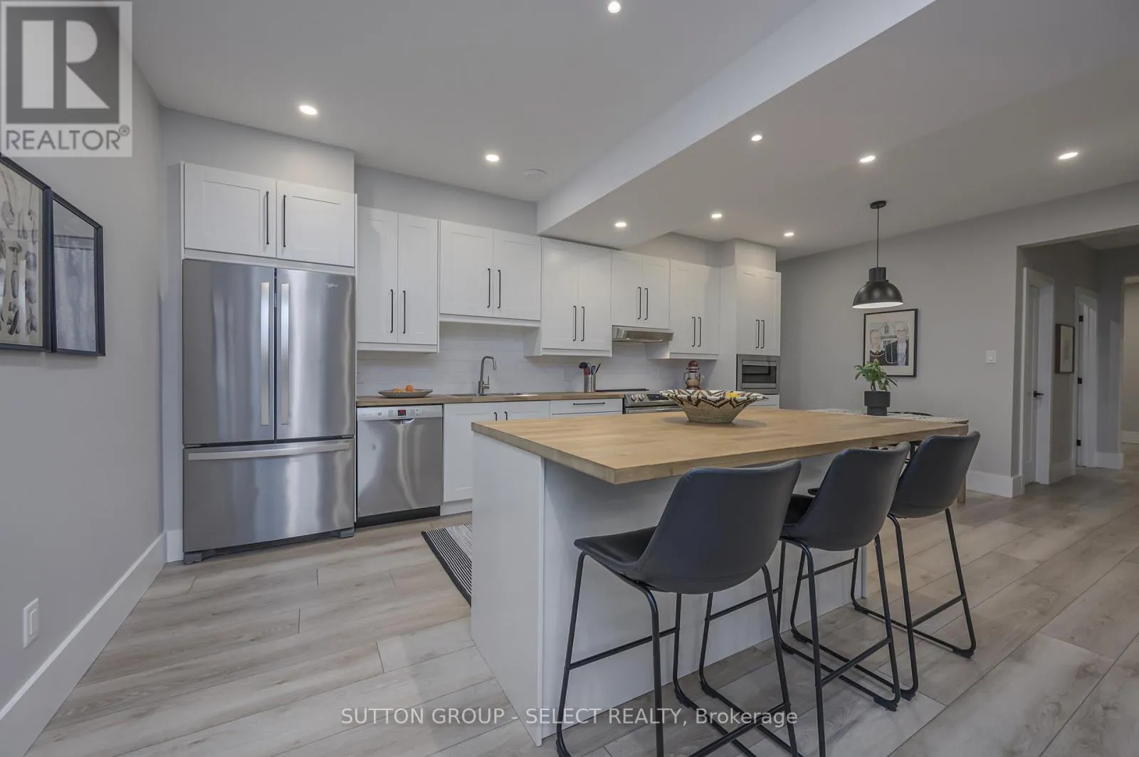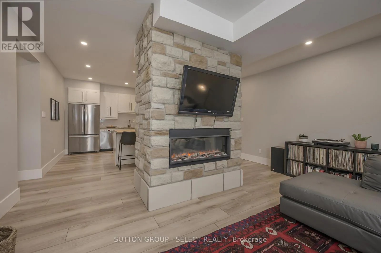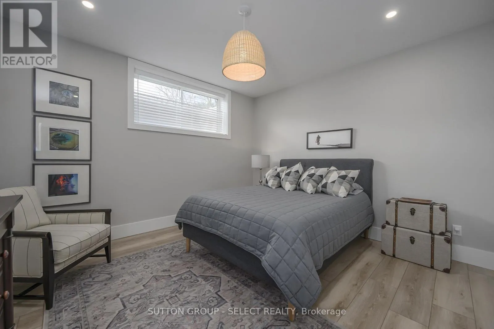 Cross Streets: Edwin Drive. ** Directions: Commissioners Rd E & Edwin Drive. Understated executive bungalow, set intentionally back from the road, behind the mystique of automated privacy gates, creating the English stone-cottage inspired residence found wrapped in trees, tranquility, and quiet prestige. A long, softly illuminated, concrete drive draws you away from traffic to a quiet fully fenced, pool-sized lot, with abundant guest parking and a separate 3-car garage. The timeless stone exterior, romantic Juliette balconies, and partially covered verandah set the stage for refined outdoor living, anchored by a two-sided fireplace that invites lingering evenings and effortless entertaining. Inside, soaring 10-ft ceilings on the main level and 9-foot ceilings in the lower level create a sense of volume and light for this modern-European aesthetic. The main floor unfolds in a thoughtful 2-bedroom plus den layout that balances intimacy and openness, centred around a showpiece kitchen with ceiling-height flat-panel cabinetry, quartz surfaces, and a wet bar/servery with garden door access to the terrace. Scandinavian-inspired baths and a serene, boutique-style primary suite complete the upper level with quiet sophistication, while the den adapts easily as a third bedroom. The lower level is equally impressive and remarkably versatile, offering 3 additional bedrooms, 2 bathrooms, a full second kitchen and laundry, and expansive living areas filled with natural light. Whether envisioned as a seamless extension of the main home, a private guest or teen retreat, or an elevated work-from-home, the possibilities are exceptional. Notably, there are no interior load-bearing walls on this level, allowing easy removal of fireplace and island to create an exceptional flex/games/media space. A metal roof, 3-bay garage w/ 220-amp service & the rare setback position complete this private, design-driven residence delivering beauty, presence, and flexibility in equal measure-quietly tucked away, yet moments from Hospitals, Wortley Village, and Highland Golf. (id:27476)