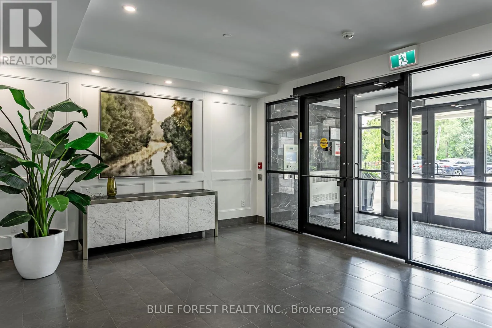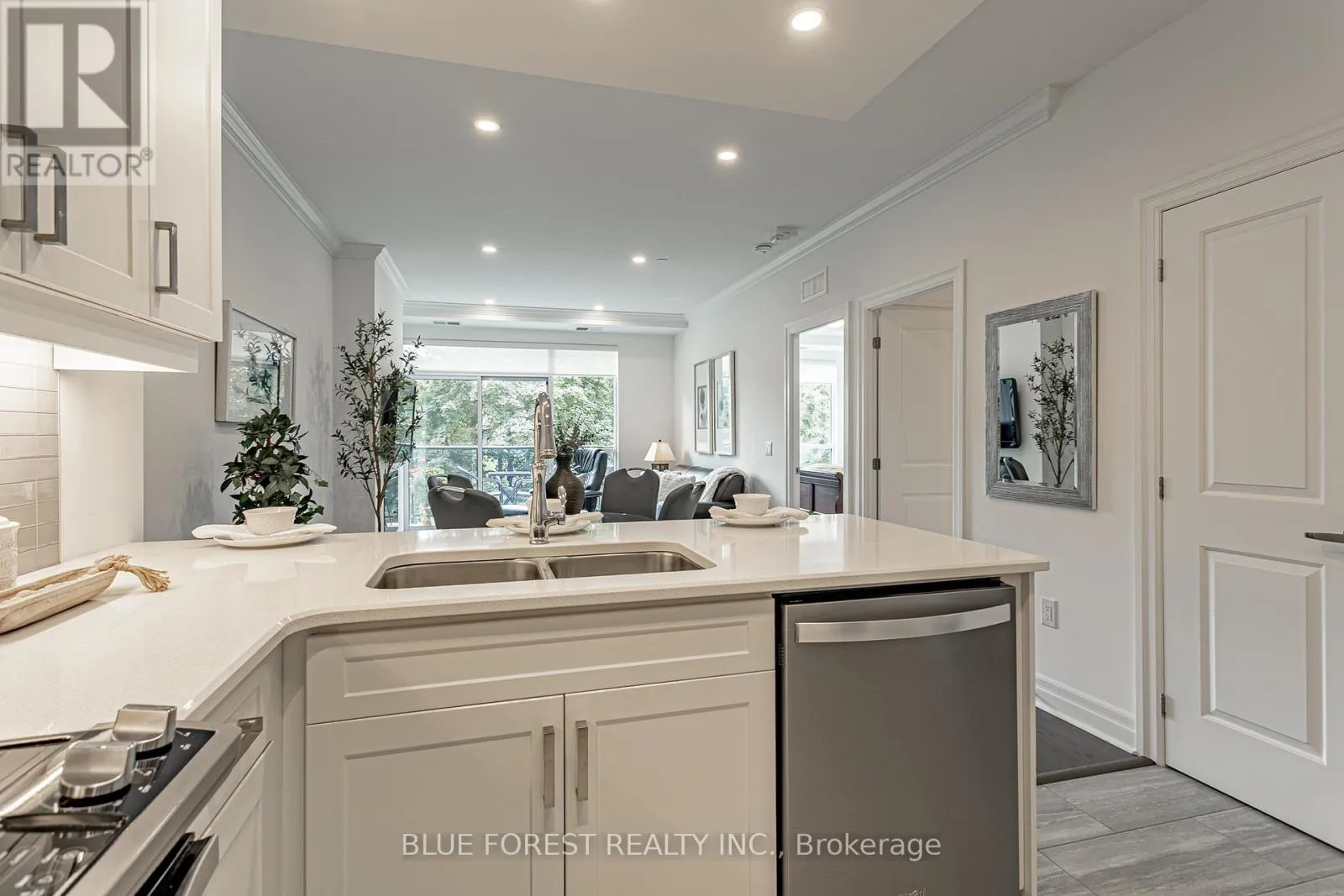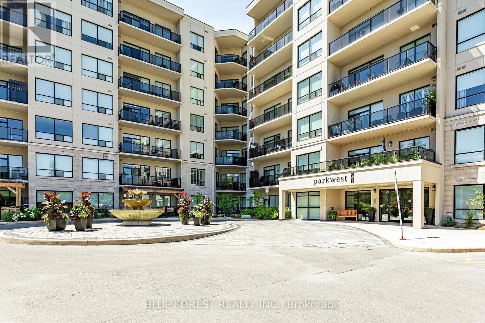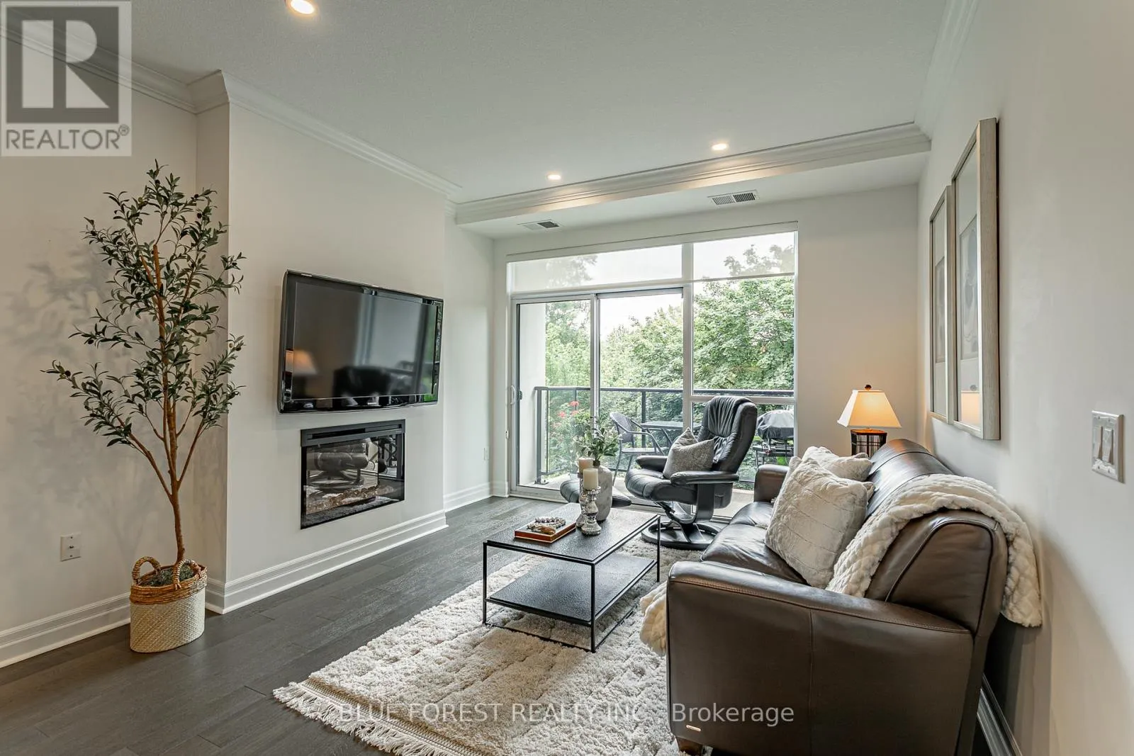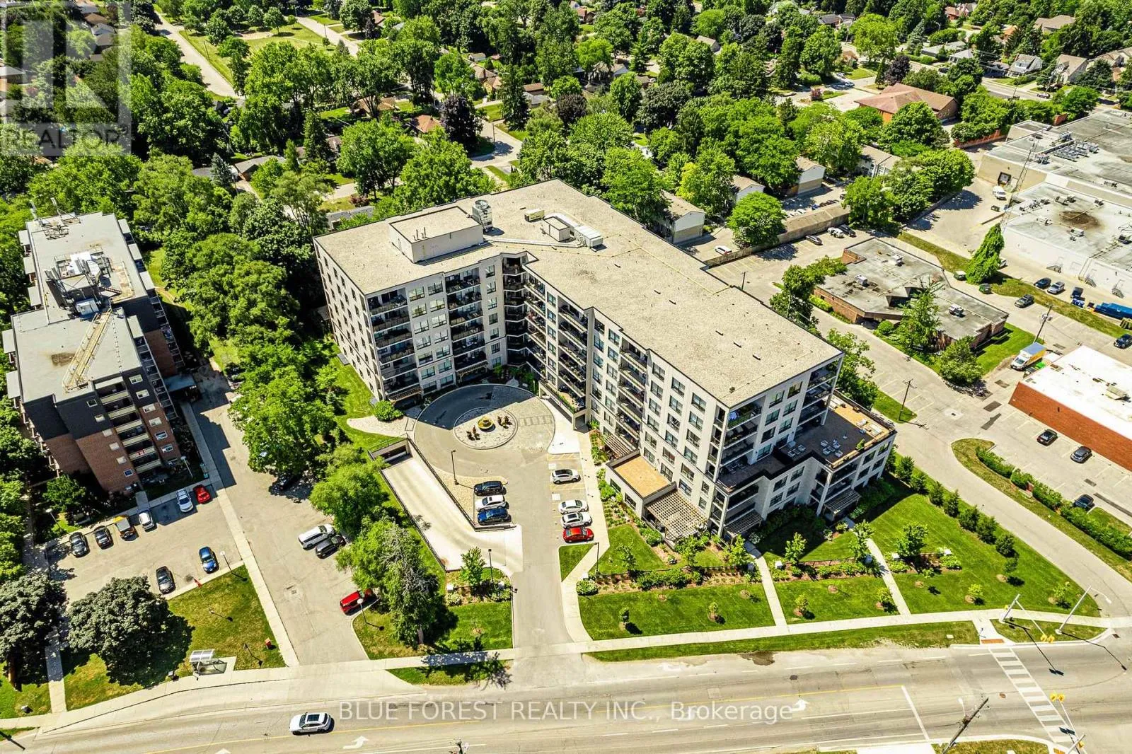 Cross Streets: Boler Rd. & Commissioners Rd. ** Directions: Commissioners Rd W. to Byron. Stylish and modern 6-year-old condo (Parkwest) perfectly situated across from the scenic Springbank Park in highly sought-after Byron. The bright, contemporary kitchen is thoughtfully designed for both style and function, featuring crisp white cabinetry, stainless steel appliances, quartz countertops, tile flooring, and a convenient breakfast bar that opens to the main living area. The open-concept layout flows effortlessly into the dining and living spaces, finished with warm laminate flooring and anchored by a sleek electric fireplace. The South facing unit enjoys sunshine throughout most of the day, creating a warm and inviting atmosphere year round. Step out onto your private balcony, surrounded by mature trees, an ideal spot to enjoy morning coffee or unwind in peace. The spacious primary bedroom boasts a professionally designed walk-in closet and large windows that flood the room with natural light. A versatile den provides the perfect flex space for a home office, guest room, or reading nook. The oversized 5-piece bathroom is both elegant and functional, offering double sinks, quartz countertops, large tub, and a glass-enclosed shower. Additional features include in-suite laundry, owned underground parking space, and a private storage locker. Residents enjoy exceptional amenities, including a stylish party room with pool table, kitchen and lounge area; a fully equipped fitness room, two outdoor patios, a guest suite, and even a private golf simulator room. Ample visitor parking. Enjoy direct access to the park with walking trails along the Thames River. Walking distance to shopping, restaurants, and bus stop. For those avid skiers, Boler Mountain is just minutes away. Condo fees include heating, air conditioning, water, building insurance, and outdoor maintenance making for effortless living in a truly exceptional location. (id:27476)