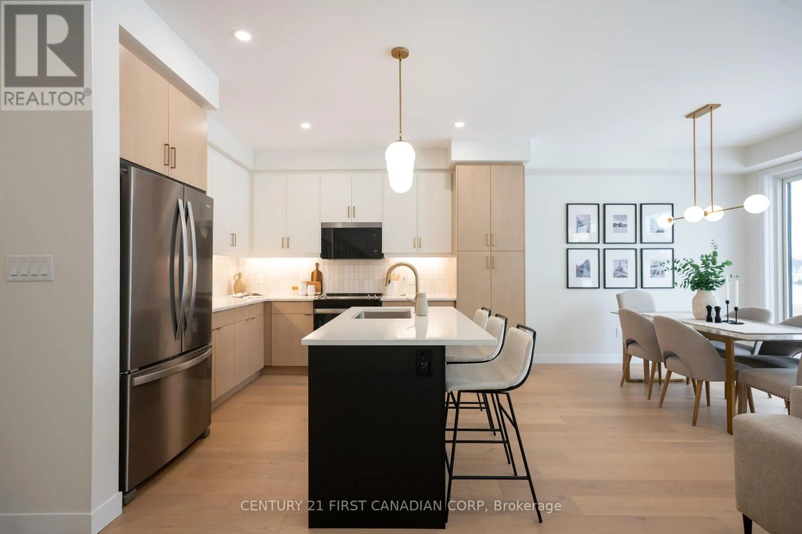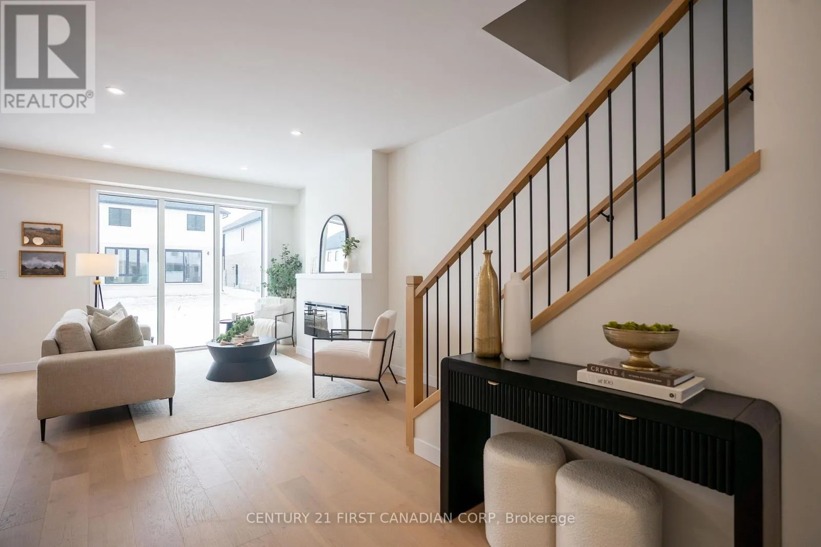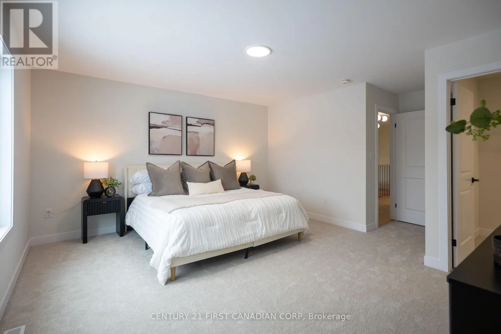 Cross Streets: Wonderland Road S & Hamlyn Street. ** Directions: Turn westbound onto Hamlyn Street from Wonderland Road South. Turn left onto Liberty Crossing and drive to the end of the street. Turn left onto Calhoun Way. Townhomes are on the left. Welcome to Rockmount Homes' latest model home in Liberty Crossing, located by Wonderland Road S & Exeter Road. These Award-Winning Townhomes are the Largest Freehold Townhomes in the area, boasting a spacious 1,768 Square Feet with Outstanding Finishes Inside & Out, plus NO CONDO FEES! Renowned for their craftsmanship and townhome design, these Grand Homes are built with Stone and Hardie-Paneling Exteriors for Long-Lasting Beauty and Durability. This upgraded Model Home boasts above-standard finishes such as the Tiled Kitchen Backsplash, Upgraded Kitchen Cabinets, a 5-Piece Whirlpool Appliance Package, Oversized Floor-to-Ceiling Windows with Window Treatments, Quartz Bathroom Countertops, Upgraded Lighting & Plumbing Fixtures, Poplar Stained Stairs, Engineered Hardwood in the Upper Hallway, and Added Cabinetry in the Upstairs Laundry Room. On the second level, you'll find three spacious bedrooms all brilliantly lit with large windows, two full 4-piece bathrooms, and a tiled laundry room, designed with family-oriented living in mind. The luxurious primary suite features a walk-in closet and spa-like ensuite complete with dual vanities and a glass-enclosed tiled shower with a roller top door. This neighbourhood is primely located minutes from the 402/401 Highways, Costco, and other major shopping centres, as well as several large parks, golf courses and Boler Mountain. (id:27476)