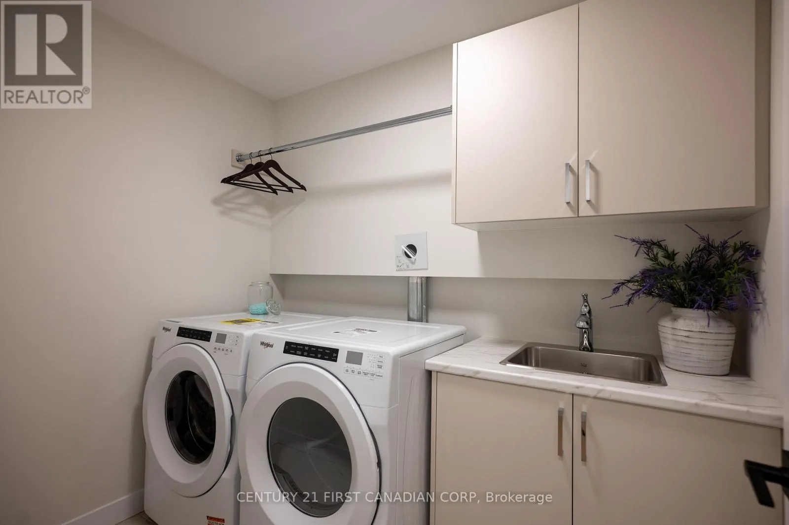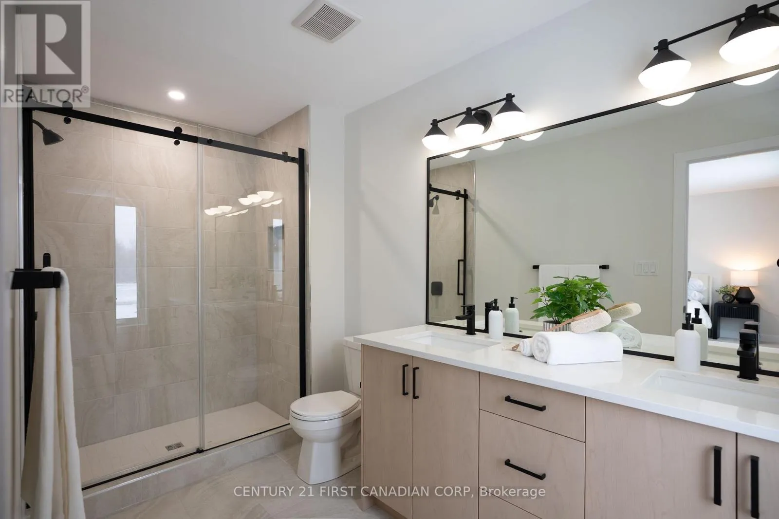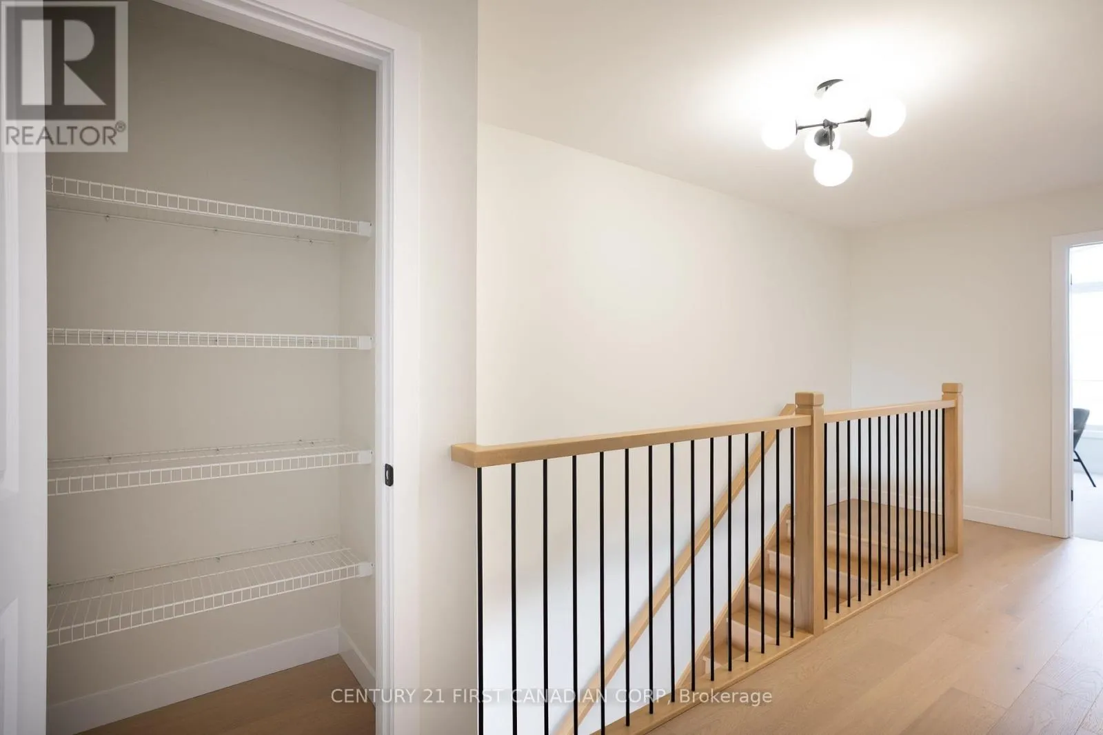Cross Streets: Wonderland Road S & Hamlyn Street. ** Directions: Turn westbound onto Hamlyn Street from Wonderland Road South. Turn left onto Liberty Crossing and drive to the end of the street. Turn left onto Calhoun Way. Townhomes are on the left. Welcome to Rockmount Homes' latest model home in Liberty Crossing, located by Wonderland Road S & Exeter Road. These Award-Winning Townhomes are the Largest Freehold Townhomes in the area, boasting a spacious 1,768 Square Feet with Outstanding Finishes Inside & Out, plus NO CONDO FEES! Renowned for their craftsmanship and townhome design, these Grand Homes are built with Stone and Hardie-Paneling Exteriors for Long-Lasting Beauty and Durability. This upgraded Model Home boasts above-standard finishes such as the Tiled Kitchen Backsplash, Upgraded Kitchen Cabinets, a 5-Piece Whirlpool Appliance Package, Oversized Floor-to-Ceiling Windows with Window Treatments, Quartz Bathroom Countertops, Upgraded Lighting & Plumbing Fixtures, Poplar Stained Stairs, Engineered Hardwood in the Upper Hallway, and Added Cabinetry in the Upstairs Laundry Room. On the second level, you'll find three spacious bedrooms all brilliantly lit with large windows, two full 4-piece bathrooms, and a tiled laundry room, designed with family-oriented living in mind. The luxurious primary suite features a walk-in closet and spa-like ensuite complete with dual vanities and a glass-enclosed tiled shower with a roller top door. This neighbourhood is primely located minutes from the 402/401 Highways, Costco, and other major shopping centres, as well as several large parks, golf courses and Boler Mountain. (id:27476)