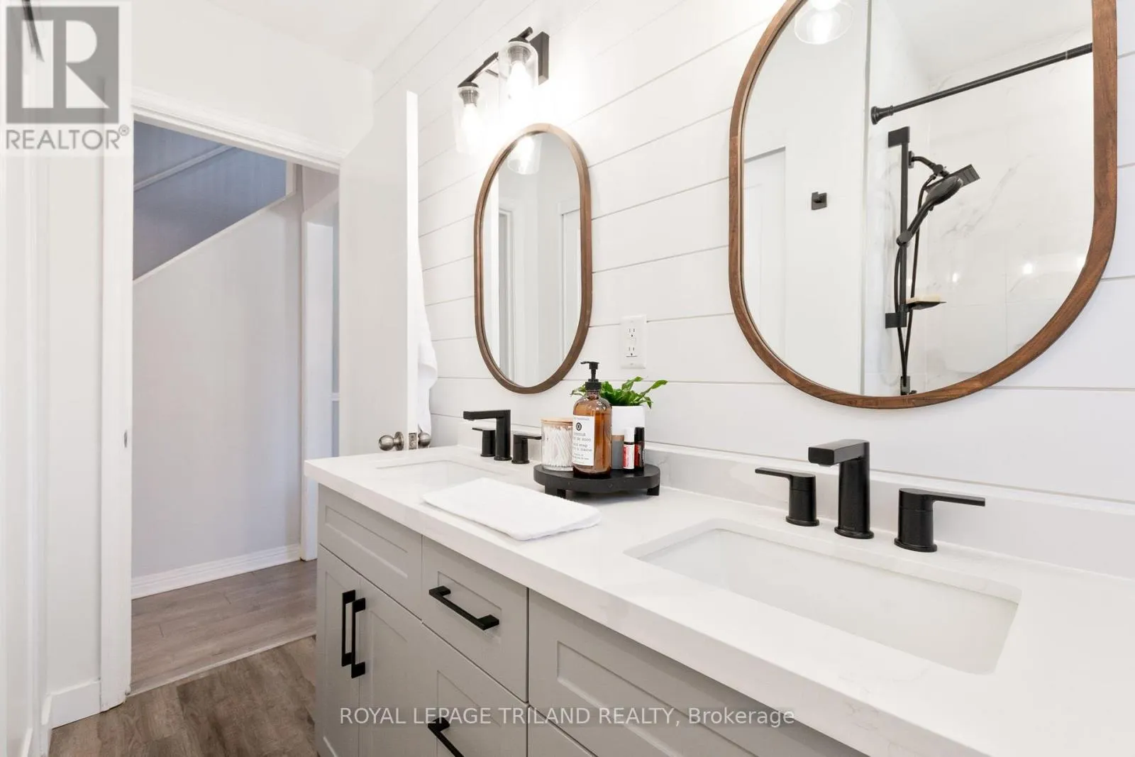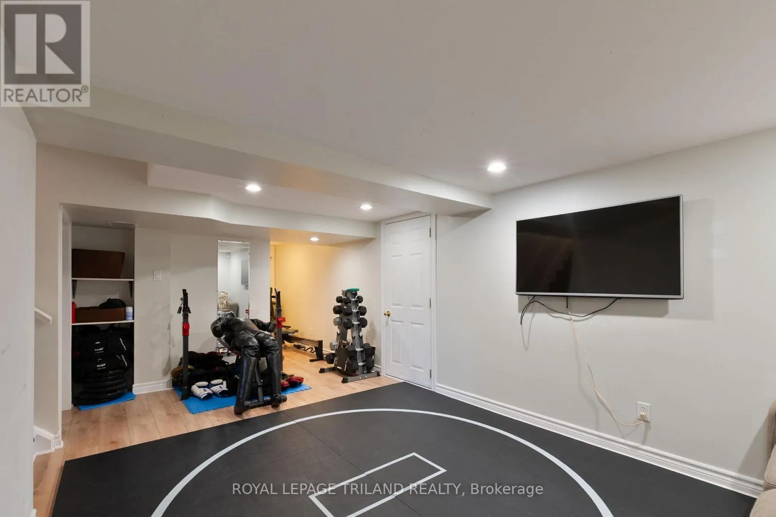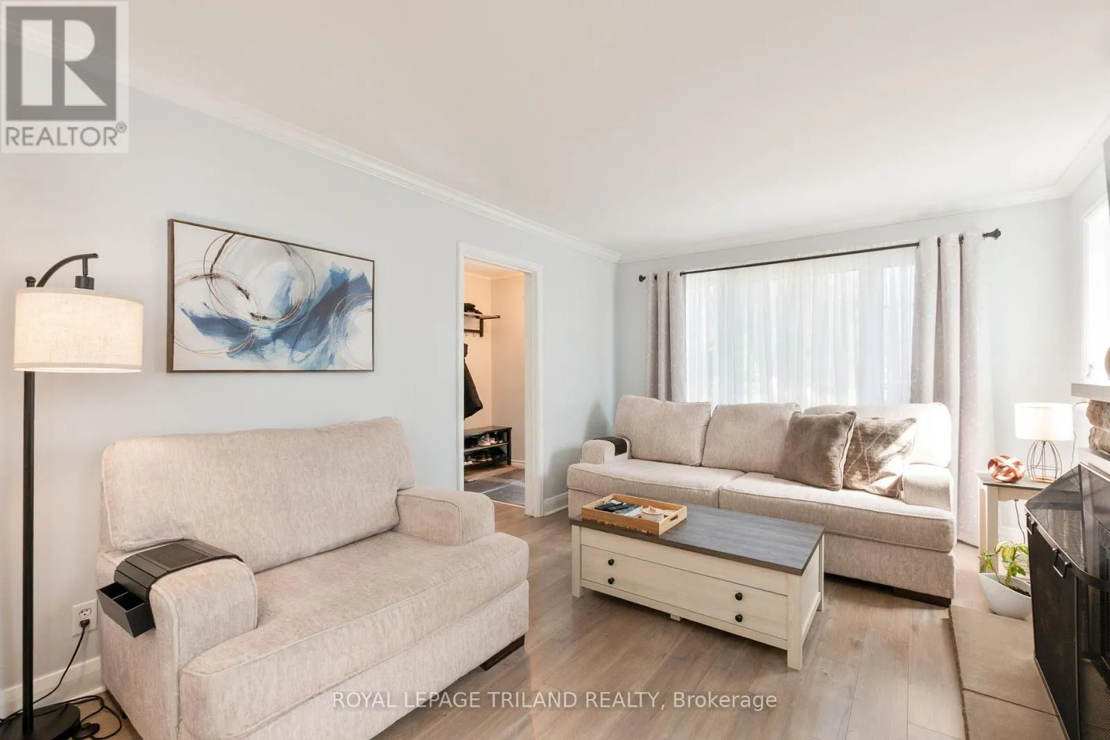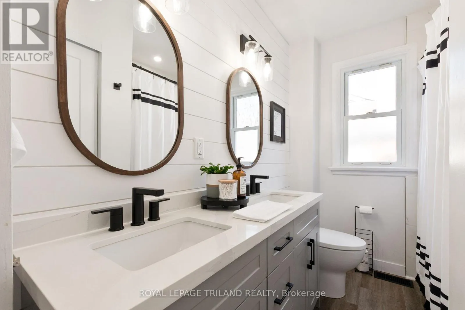 Cross Streets: Byron Baseline. ** Directions: Byron Baseline to Byron Blvd. Welcome to 417 Byron Blvd, a charming 1.5 storey Cape Cod style home in the heart of Byron. Built in 1950, this property sits on an impressive 50 x 187 ft lot, approximately 0.215 acres, offering exceptional space and future potential for renovation or expansion if required. Surrounded by mature trees, the expansive backyard is perfect for gardening, entertaining, or letting kids and pets play. The property features parking for 5+ vehicles, a detached single car garage built in 2016, and a recently updated concrete walkway and front porch completed in 2025. Inside, the front entry opens to a bright formal living room with a gas fireplace and large front and side windows. The adjoining dining room is also filled with natural light, creating a warm and inviting space for gatherings. The main floor includes a versatile third bedroom (also ideal as a home office or playroom), along with a spacious galley style kitchen featuring updated white cabinetry, ample storage, and prep space. A fully updated 5 piece bath with dual sinks and a tiled tub/shower adds both style and function. The entire main floor is finished in updated laminate flooring. Just off the kitchen, step out to the large sundeck built in 2010, perfect for summer entertaining and BBQs. Upstairs offers two generously sized bedrooms with recently replaced carpeting, providing comfortable and private spaces ideal for family living. The lower level is partially finished with a rec room, fourth bedroom, 3 piece bath, laundry, and plenty of storage. Notable updates include shingles in 2019 and furnace in 2012. Located in one of Byron's most sought after communities, this home is just minutes to top rated schools, shopping, restaurants, and the natural beauty of Springbank Park with its scenic trails along the Thames River. Enjoy the perfect blend of a quiet, established neighbourhood with convenient access to all amenities. (id:27476)