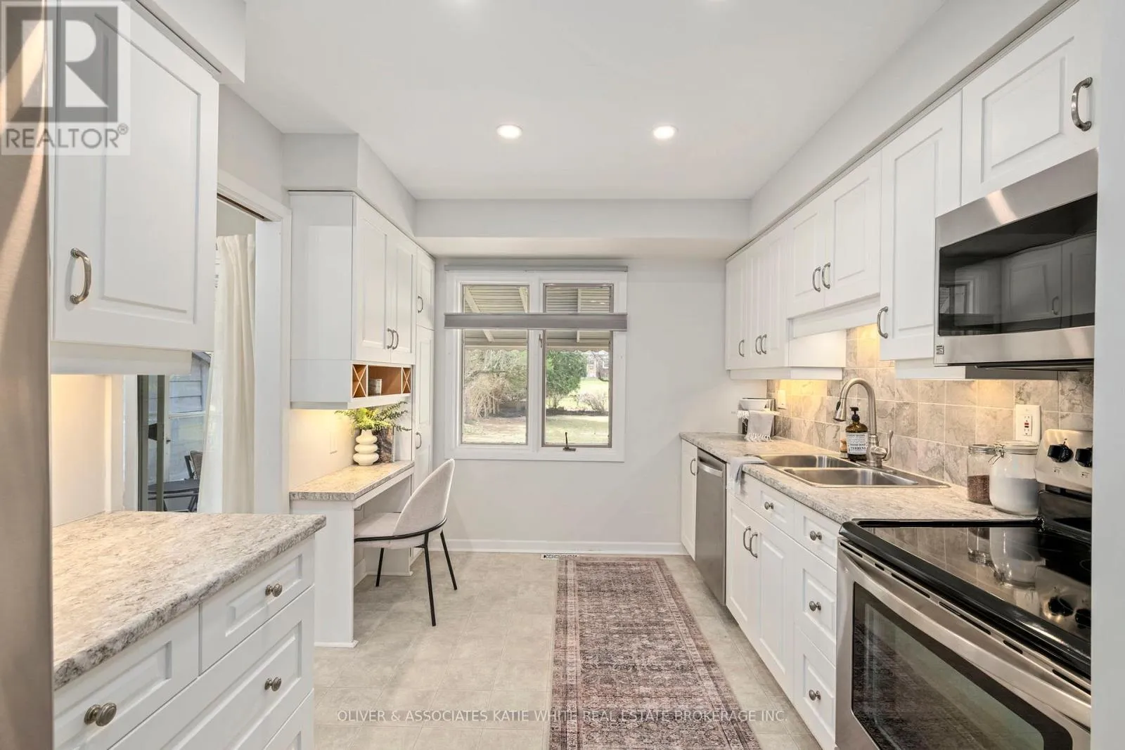 Cross Streets: GRIFFITH STREET. ** Directions: Located on Norman Ave between Grand View and Griffith. Great opportunity to own a family home in the heart of Byron. Located on a quiet street close to parks, community centre, schools, restaurants, and shopping. The main floor offers a bright living room, formal dining space, and a separate sunroom off the dining area. The kitchen has been updated and includes newer appliances. Upstairs features 3 good-sized bedrooms, freshly painted, along with an updated 4-piece bathroom. The lower level includes a family room with built-ins and a window seat, a 3-piece bathroom with walk-in shower, and walk-up access to the backyard. The basement is partially finished with a laundry area, space for a home gym or hobby area, and additional storage. Outside, the property offers a private, fenced backyard with mature trees. Double wide driveway plus an oversized attached single garage with inside entry. (id:27476)