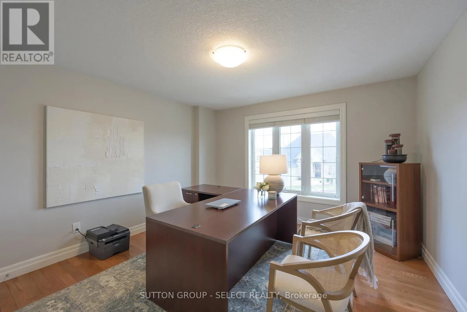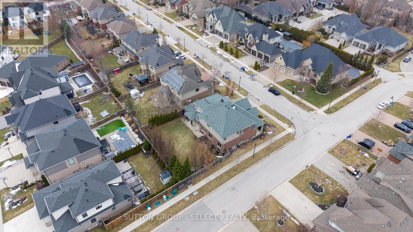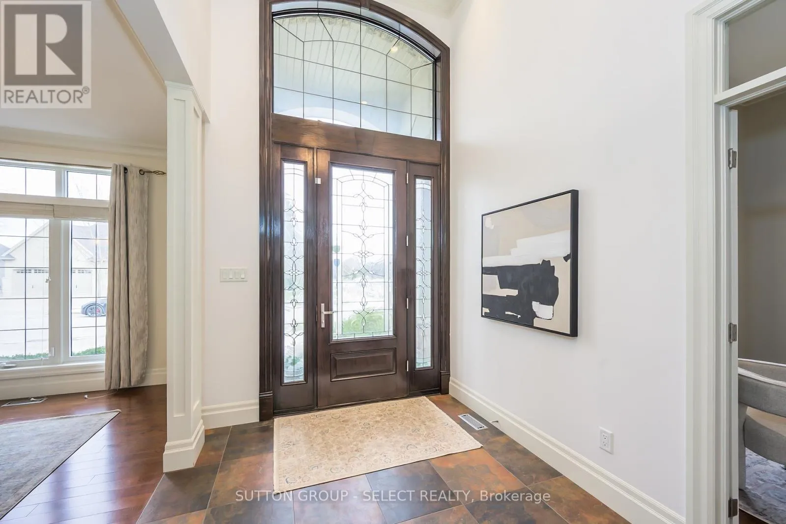 Cross Streets: Wickerson Gate/ Bayford Crescent. ** Directions: WEST ON BYRON BASELINE RD., TURN LEFT ON WICKERSON RD. AND THEN TURN LEFT ON WICKERSON GATE. A rare combination of scale, presence, and setting begins at the covered front porch, where substantial columns, stonework, and a stately entry create an immediate sense of arrival. A triple car garage and wide driveway reinforce the home's presence from the street. Inside, the two-storey foyer rises with natural light, framed by an arched opening and statement lighting-introducing the volume and architectural detail that define this home.The main level is anchored by expansive principal rooms that feel both open and intentional. Rich hardwood, substantial crown moulding, and custom millwork carry throughout, while a wall of windows across the back of the home draws in natural light and connects seamlessly to the outdoor living space. The living area is centred around a fireplace, with clear sightlines into the kitchen and dining spaces-designed for both everyday function and larger gatherings.The kitchen delivers on both presence and practicality, with extensive cabinetry, a large centre island with prep sink, gas range, and a walk-in pantry. A wet bar/servery enhances flow to the dining area. A private office is located off the foyer, along with convenient main floor laundry. Garden doors lead to a covered patio with an integrated wood-burning fireplace-an outdoor space that feels private and purposeful.Upstairs, a wide landing overlooks the foyer below. Four well-proportioned bedrooms include a primary suite with space to unwind, complemented by an ensuite with soaker tub, glass shower, double vanity, and skylight.The fully finished lower level adds flexibility with a large media/games room, fireplace, bedroom, full bath, and workshop.. A separate staircase from the garage supports multi-generational or private use.A fully fenced, pool-sized yard and wide corner lot offer added frontage, privacy, and a more open streetscape, set in Wickerson Heights at the edge of Byron Village. Nearby trails, Thames River, West 5, RiverBend Golf & Hunt Club Golf. (id:27476)