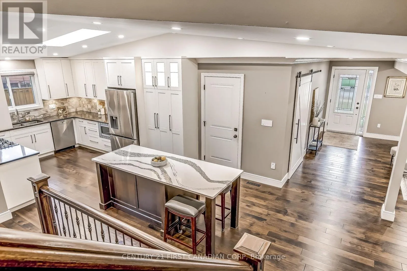 Cross Streets: HOMEVIEW. ** Directions: Homeview then east on Golfview. Welcome to Golfview Crescent. This 3+1 bedroom, 2 bathroom four level backsplit on a large pie shaped lot is ready for you to make it your own. The completely renovated main floor offers a spacious living room with plenty of natural light, which opens to the elegant dining room and from there you enter the Eat-in kitchen, which has plenty of storage and a side door leading to the large deck. Downstairs you will find a grand family room with a natural wood burning fireplace. The fourth level has a large laundry room and is also completely finished and would make a great playroom. Outside you have a fully fenced yard, with plenty of room for the dogs or kids to play! (id:27476)