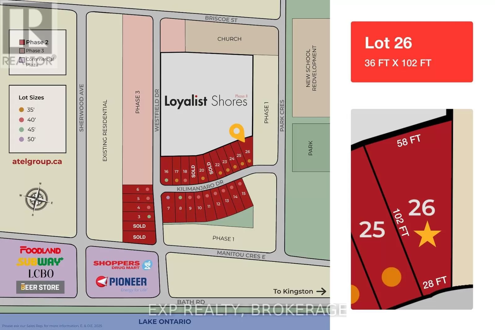 Cross Streets: Westfield Drive. ** Directions: Bath Road to Westfield Drive to Kilimanjaro Drive. Rare opportunity to build your dream home in Loyalist Shores. Lot 26 features a 36-foot x 102-foot pie-shaped lot, with a frontage that widens from 28 feet to a spacious 58-foot rear yard. Located in a fully serviced, developing subdivision in the heart of Amherstview, just minutes from Kingston. This brand new neighbourhood blends quiet residential living with unmatched convenience, located steps from the upcoming school redevelopment directly across the street and minutes from a revitalized community recreation centre, waterfront parks, and everyday amenities. With full municipal servicing to be completed by late 2025, this lot will be ready for closing and construction at that time, making it the perfect window to plan and design your custom home. Don't miss this opportunity to secure a premium lot in one of Kingston's most promising new communities. (id:27476)