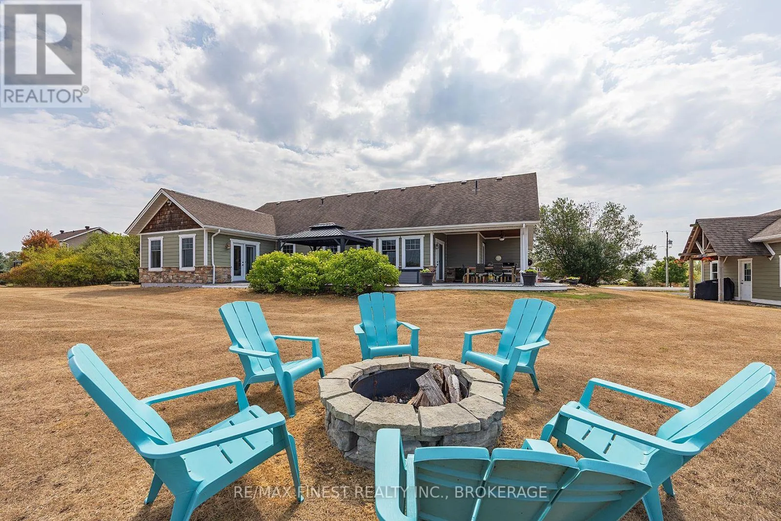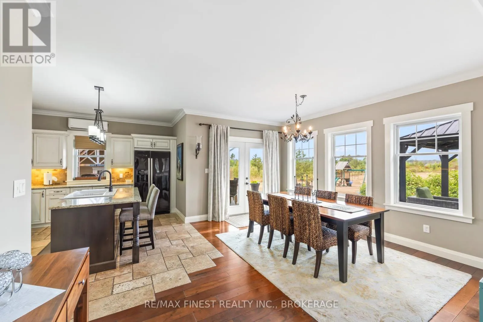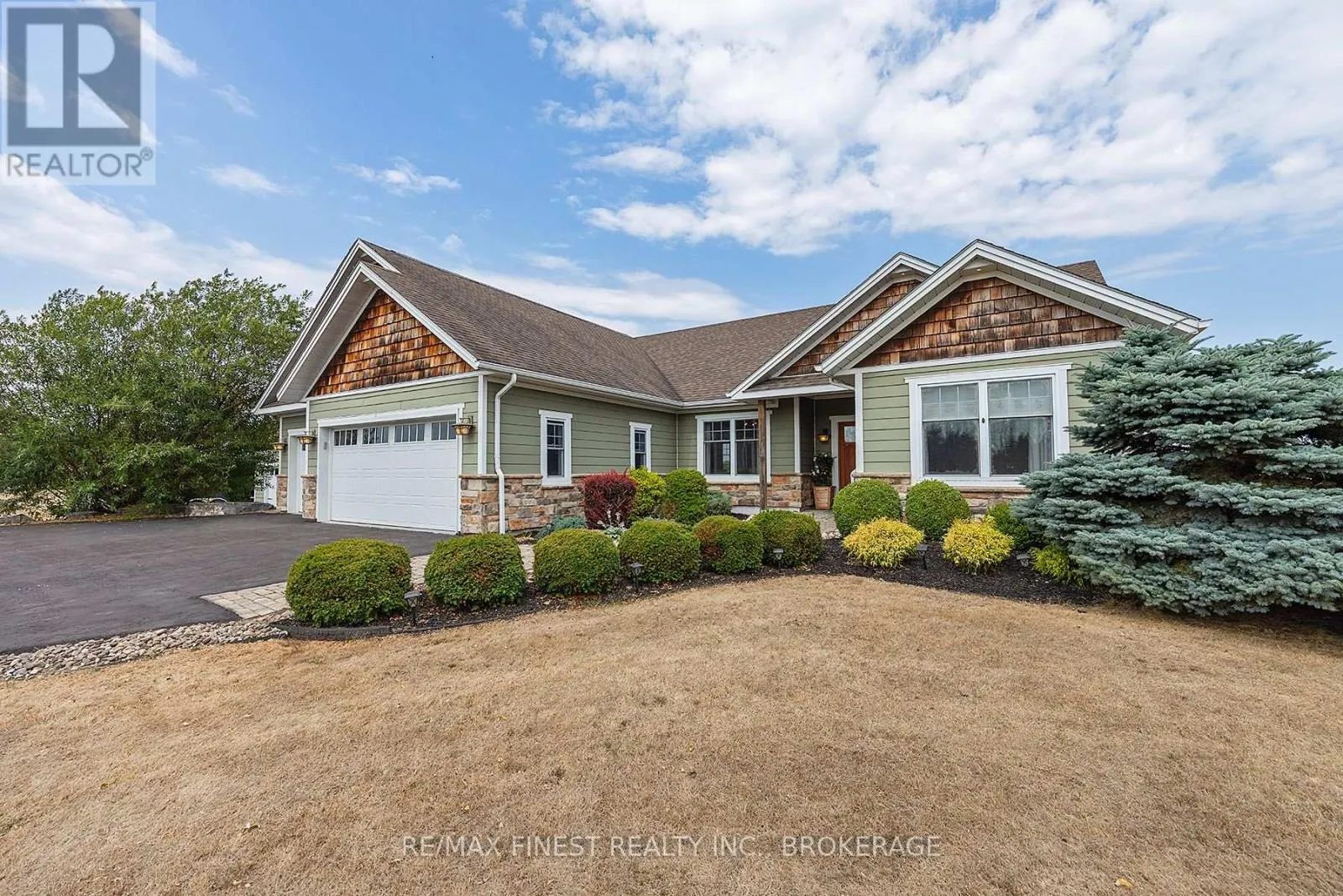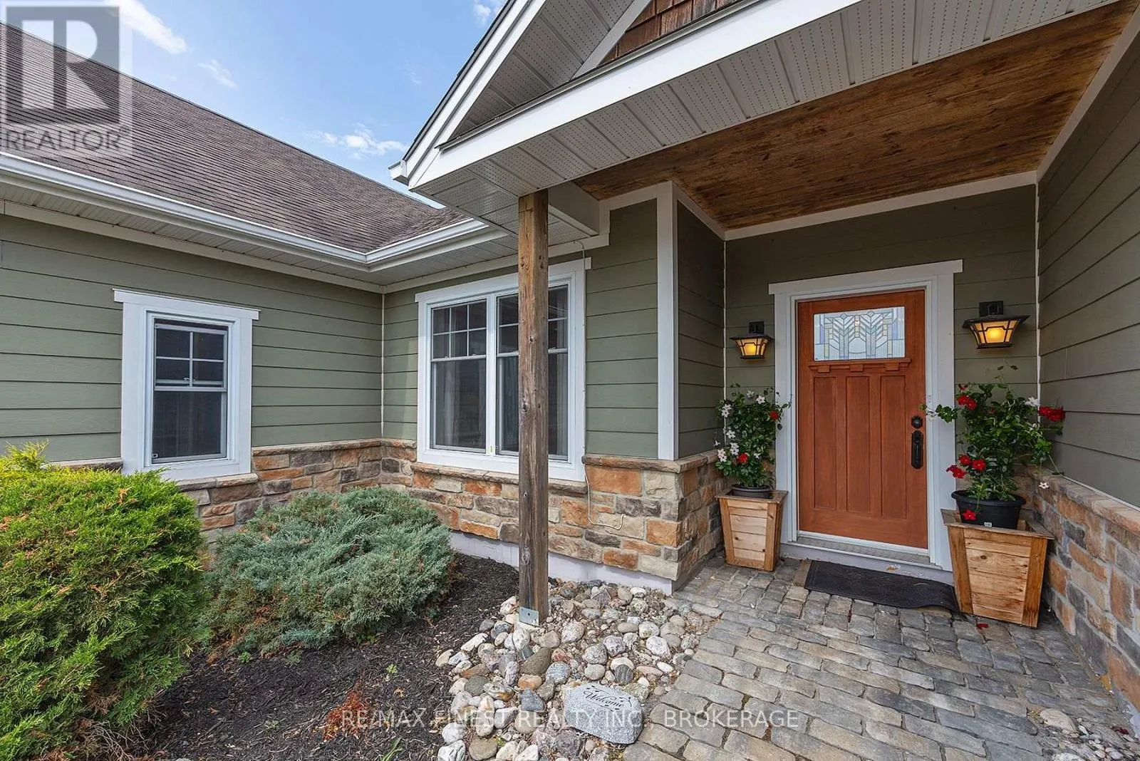 Cross Streets: County Rd 4. ** Directions: County road 4 towards #2, Right on County road 28. Discover this exquisite custom-built bungalow, over 2,000 sq. ft. of refined living on 2 meticulously landscaped acres, just minutes west of Kingston. Crafted with exceptional artistry and thoughtful design, every detail reflects superior quality. Step inside to distressed hickory hardwood and elegant travertine floors flowing throughout an open-concept layout. The luxurious primary suite boasts vaulted ceilings, exposed beams, a spacious walk-in closet, and a spa-like ensuite with a tiled walk-in shower and rainfall shower head. At the heart of the home, a grand family room with a floor-to-ceiling stone fireplace, coffered ceilings, and recessed lighting opens seamlessly to a gourmet kitchen. Featuring granite countertops, a stone backsplash, under-cabinet lighting, a convenient pot filler, a large pantry, and an expansive center island, it's a chef's dream. The adjacent dining area connects effortlessly to an early 1,000 sq. ft. partially covered cedar deck and gazebo through garden doors-ideal for al fresco entertaining. Additional highlights include a formal living room, a dedicated home office, and a well-appointed laundry/mudroom. The property offers a heated three-car attached garage and a 16' x 26' detached garage for generous storage and versatility. Comfort meets efficiency with radiant in-floor heating, a heat pump for supplemental heating and cooling, an HRV system, and central vacuum throughout. Timeless elegance, impeccable craftsmanship, and thoughtful functionality-quality through and through. Schedule your private viewing today and experience this exceptional residence. (id:27476)