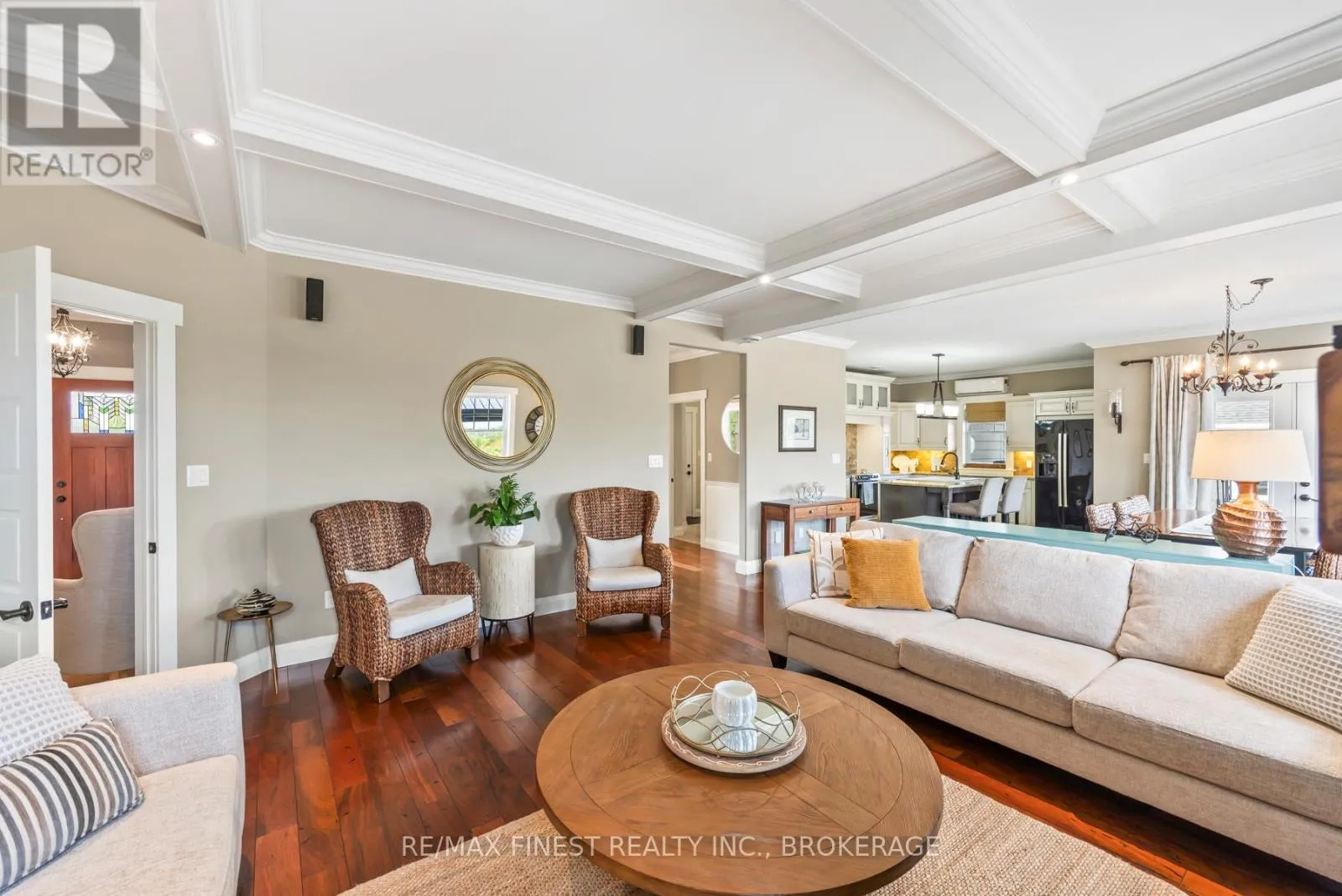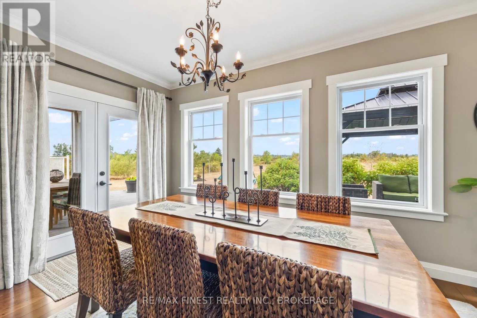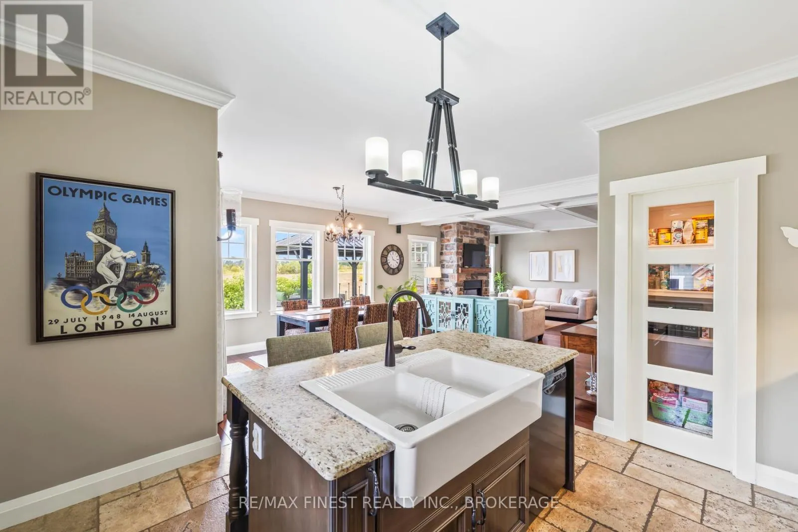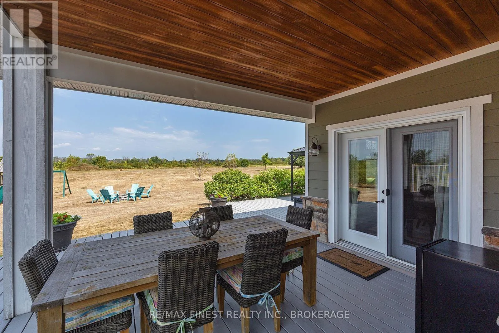 Cross Streets: County Rd 4. ** Directions: County road 4 towards #2, Right on County road 28. Discover this exquisite custom-built bungalow, over 2,000 sq. ft. of refined living on 2 meticulously landscaped acres, just minutes west of Kingston. Crafted with exceptional artistry and thoughtful design, every detail reflects superior quality. Step inside to distressed hickory hardwood and elegant travertine floors flowing throughout an open-concept layout. The luxurious primary suite boasts vaulted ceilings, exposed beams, a spacious walk-in closet, and a spa-like ensuite with a tiled walk-in shower and rainfall shower head. At the heart of the home, a grand family room with a floor-to-ceiling stone fireplace, coffered ceilings, and recessed lighting opens seamlessly to a gourmet kitchen. Featuring granite countertops, a stone backsplash, under-cabinet lighting, a convenient pot filler, a large pantry, and an expansive center island, it's a chef's dream. The adjacent dining area connects effortlessly to an early 1,000 sq. ft. partially covered cedar deck and gazebo through garden doors-ideal for al fresco entertaining. Additional highlights include a formal living room, a dedicated home office, and a well-appointed laundry/mudroom. The property offers a heated three-car attached garage and a 16' x 26' detached garage for generous storage and versatility. Comfort meets efficiency with radiant in-floor heating, a heat pump for supplemental heating and cooling, an HRV system, and central vacuum throughout. Timeless elegance, impeccable craftsmanship, and thoughtful functionality-quality through and through. Schedule your private viewing today and experience this exceptional residence. (id:27476)