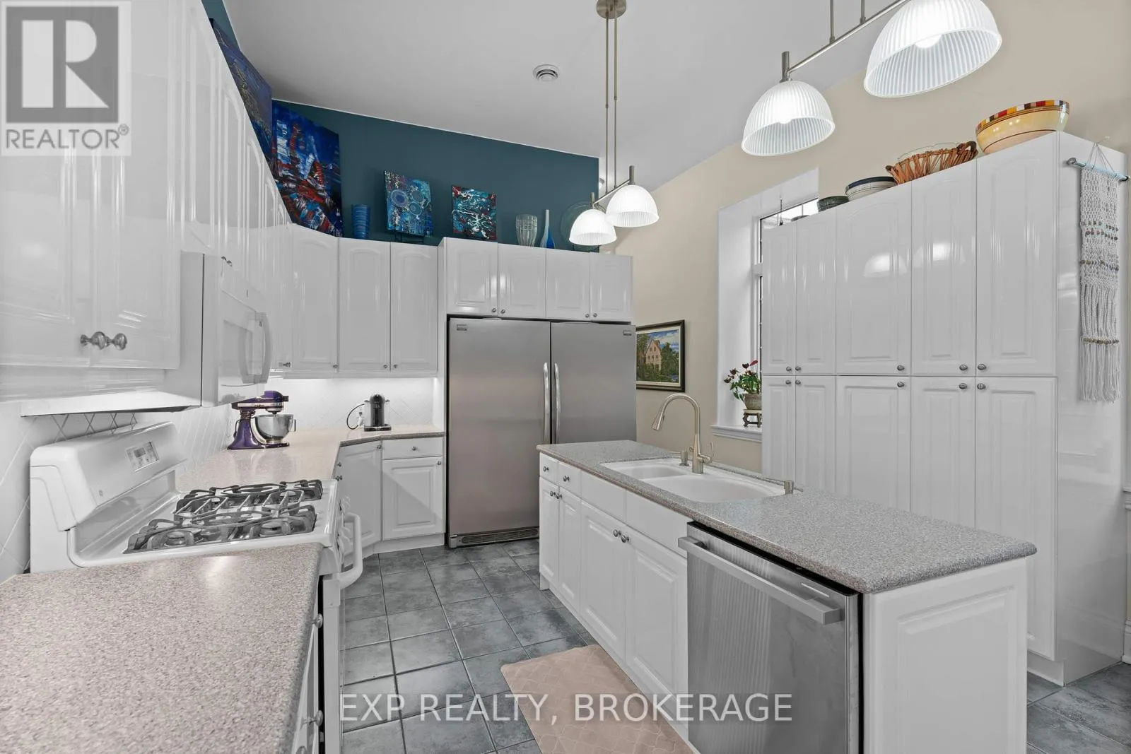 Cross Streets: County Road 2 (Princess Street West) to Odessa to Cross Street. ** Directions: County Road 2 (Princess Street West) to Odessa to CrossStreet. Prepare to be wowed the minute you step through the door of this majestic home with a stunning oak staircase and ceilings that soar to 12 feet throughout. Plenty of natural light filters through the house with 7-foot windows (24 total). Plant lovers will appreciate the 20-inch deep window sills. This home is a solid 3-brick-thick construction and features larger rooms throughout, perfect for entertaining and large family gatherings. The house has been completely gutted to the bricks and renovated to modern standards. A Georgian-style home, where you can enjoy the beauty and tranquillity of yesteryear while warming up by the gas fireplace or the radiant in-floor heating. Imagine morning coffee or afternoon refreshments on your sun-drenched second-floor balcony oasis. This fine home has lots of potential with large rooms (including a 14-foot x 25-foot art studio on the second level) that could be divided into extra bedrooms. You will be impressed with this home, it has been part of the Kingston Symphony Home Tour and many art tours. Updates include a metal roof, a new eavestrough (2023), an all-new outside concrete window sill (2024), brick and chimney repointing (2024), and a brand new boiler and water heater (2024). Schedule your private viewing today. (id:27476)