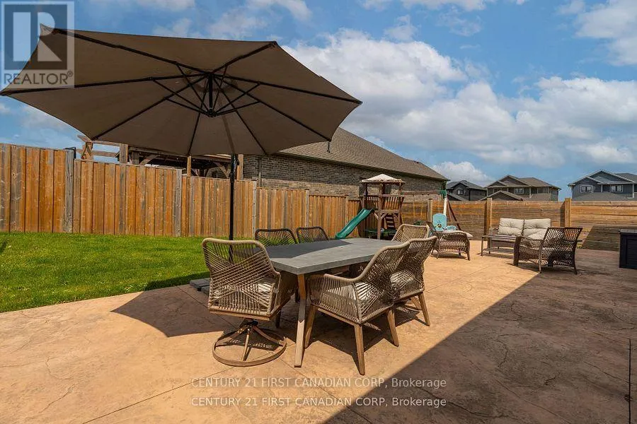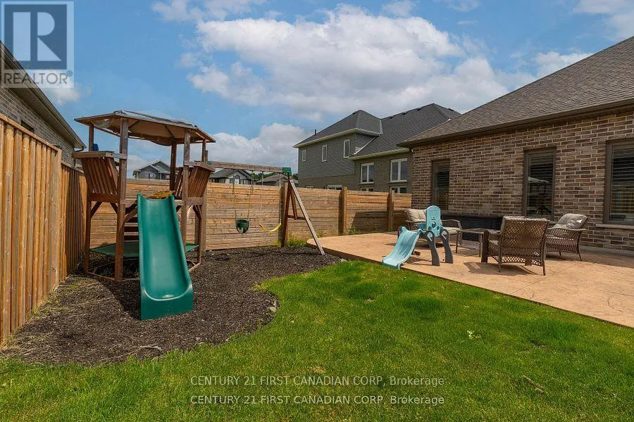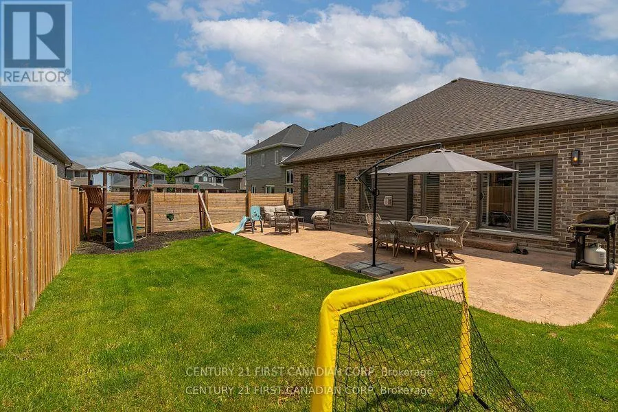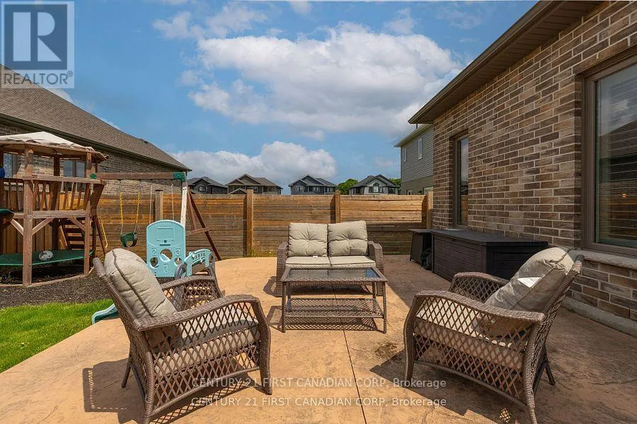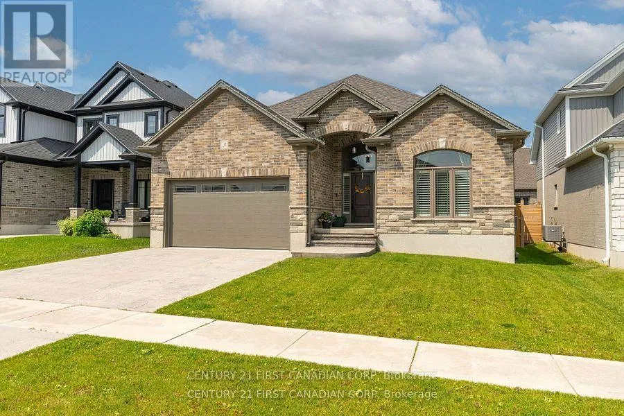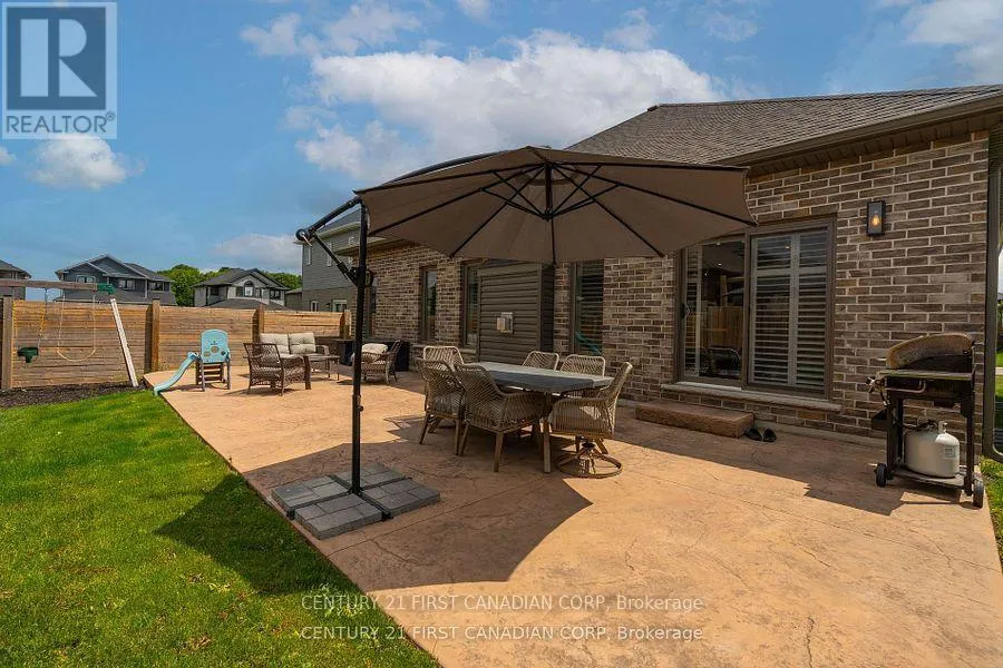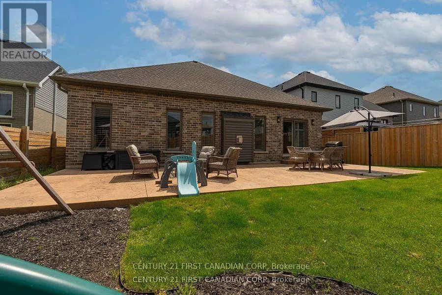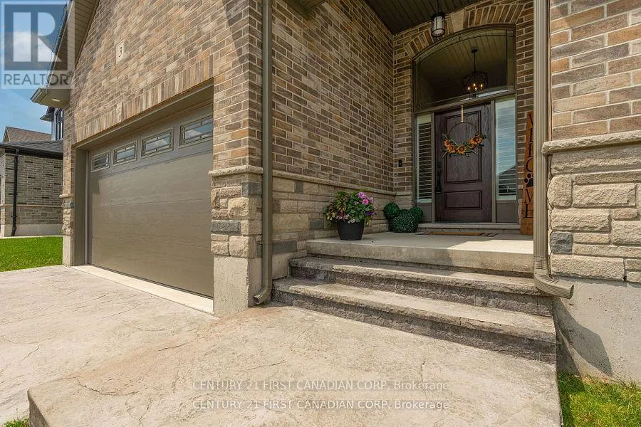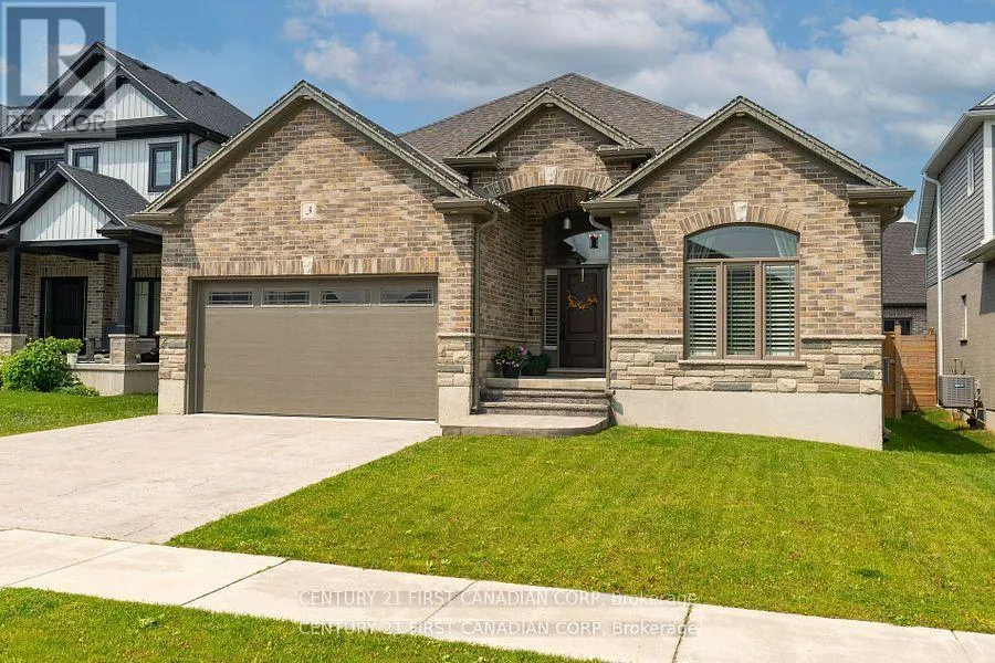 Cross Streets: From London take Richmond St North to Lucan. Turn Right on Saintsbury Line. Turn Left on Gilmour Drive. Turn Left on Hardy Court. ** Directions: Turn onto Hardy from Gilmour or Hearn. Welcome to 3 Hardy Court, a former model home located on a premier street in Lucan's sought-after Ridge Crossing neighbourhood. This stunning 1,732 sq ft full-brick bungalow looks straight out of a designer magazine and is sure to impress! Built in 2019 and in impeccable condition, this home is better than new no construction zones, just turn-key perfection. The rare and spacious 3-bedroom main floor layout offers the convenience of one-level living without sacrificing square footage or style.From the moment you arrive, the curb appeal is evident with a stamped concrete driveway and a 16-foot stamped concrete patio that spans the width of the home in the fully fenced backyard perfect for entertaining or quiet evenings. Inside, the home welcomes you with an extra-wide foyer and a dramatic 12-foot vaulted ceiling, leading to a grand great room highlighted by a cozy gas fireplace and tray ceiling with crown molding. The kitchen is sleek and modern with ceiling-height cabinetry, quartz countertops, beautiful white subway tile backsplash, a massive island with seating for four, a stylish range hood, KitchenAid appliances, and a large walk-in pantry. The open-concept dining area with California shutters flows seamlessly to the outdoor living space.The primary suite is tucked away in its own private wing, offering a peaceful retreat with a walk-in closet, and a spa-inspired ensuite with double vanity, quartz countertops, and a glass walk-in shower. Two additional generously sized bedrooms are located at the front of the home, sharing a stylish 4-piece bath. A well-located main floor laundry room with custom built in cubbies, connects conveniently to the double-car garage.Situated just steps from schools, walking trails, the community centre, and a short drive to North London, this is Lucan living at its finest. Whether you're upsizing, downsizing, or right-sizing this pristine, feature-rich home is a must-see. (id:27476)