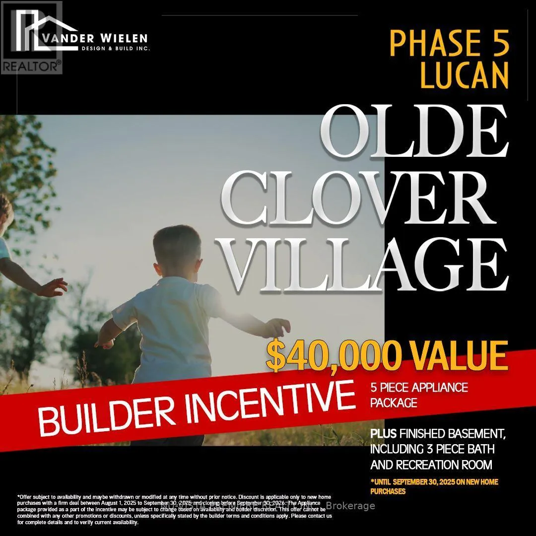 Cross Streets: Watts Lucan. ** Directions: From London on Richmond Street, turn at first right (N) going into Lucan on Spencer. Then 2nd right on Watts. House on right. Sign on lot. EXTRA WIDE LOT! The EMERALD model with 1862 sq ft of Luxury finished area located on quiet street in final phase of OLDE CLOVER VILLAGE. Walking distance to park, school and shopping! This home comes standard with a separate grade entrance to the basement ideal for future basement development. Quality built by Vander Wielen Design & Build Inc, and packed with luxury features! Choice of granite or quartz tops, hardwood floor on the main floor and upper hallway, 9 ft ceilings on the main, deluxe "Island" style kitchen, 2 full baths upstairs including a 5 pc luxury ensuite with tempered glass shower and soaker tub and 2nd floor laundry. The kitchen features a massive centre island and looks out on large rear yard. ( 486 x 1199). Oversized double garage with room to make it wider. This home is to be built. Photo is of similar property. SPECIAL BONUS: 5 pc appliance package valued at $7500. included basement finishing to include a family room and a 3 pc bathroom Included in all homes purchased before October 31st. See listing agent for details. (id:27476)