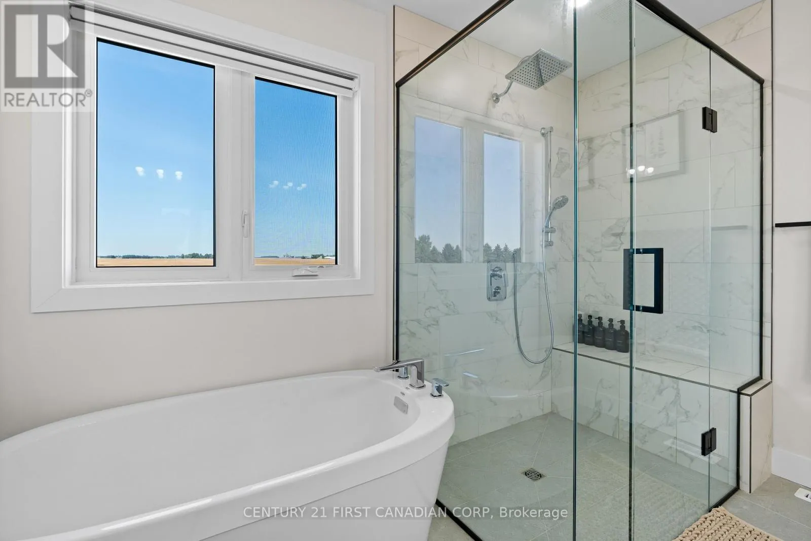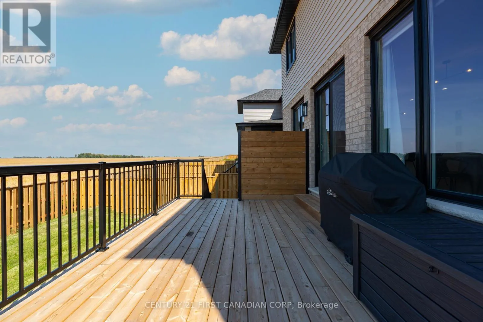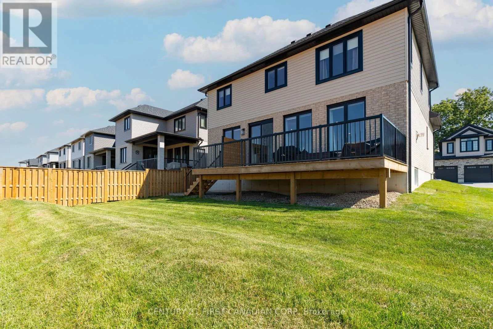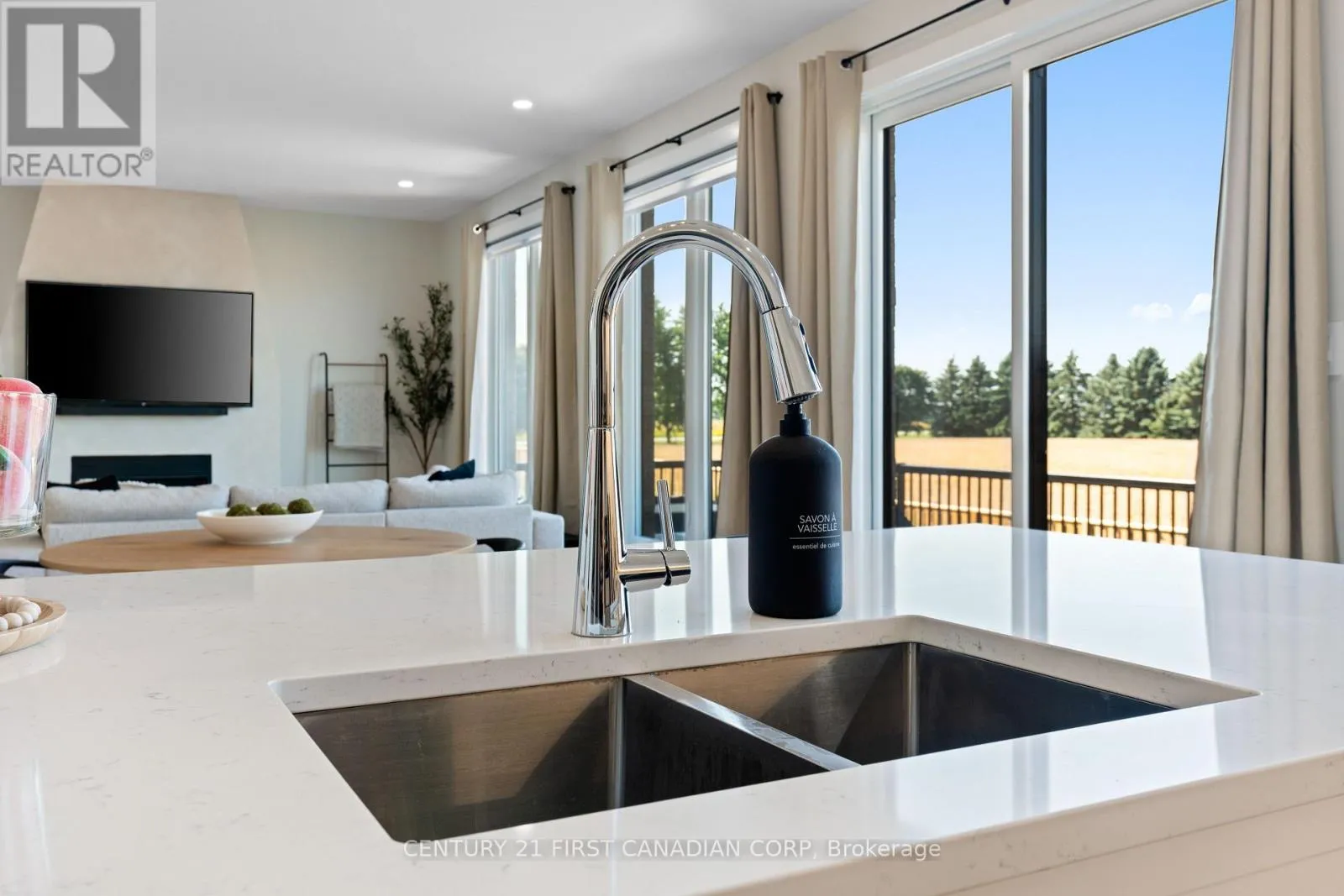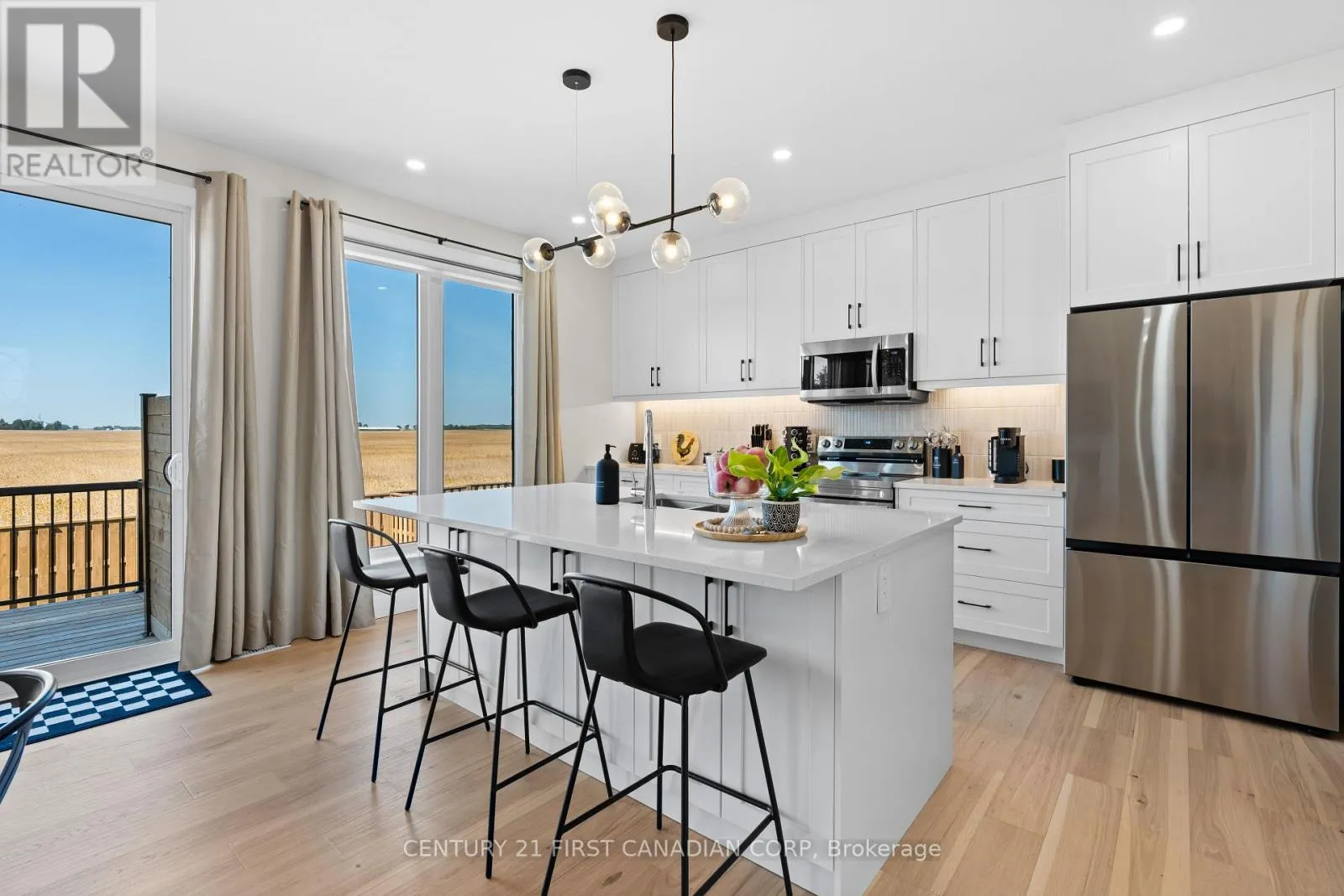 Cross Streets: Granton Line. ** Directions: From Granton Line turn West on Fallon Drive, then turn North into the Condo Complex. Modern living with small-town charm in this detached two-storey home in Granton! Built in 2024, this vacant land condo is perfectly set on a corner lot backing onto open farm fields. With 4 bedrooms and 2.5 bathrooms, this home features a two-car garage and a bright, open-concept design. The main floor is highlighted by a dedicated office, a great room with fireplace, and a dining area that flows into the sleek kitchen with large centre island and walk-in pantry. A two-piece powder room and a mudroom with garage access add convenience. Upstairs, are find four spacious bedrooms, including a primary retreat with walk-in closet and spa-like five-piece en-suite, plus a four-piece bath and a dedicated laundry room. Outside, a deck runs nearly the full width of the home, overlooking a private yard and wide-open views of the fields behind. Granton is a welcoming community just minutes from London and St. Marys, where you can enjoy peaceful living, friendly neighbours, and the charm of small-town life with easy access to city amenities. (id:27476)